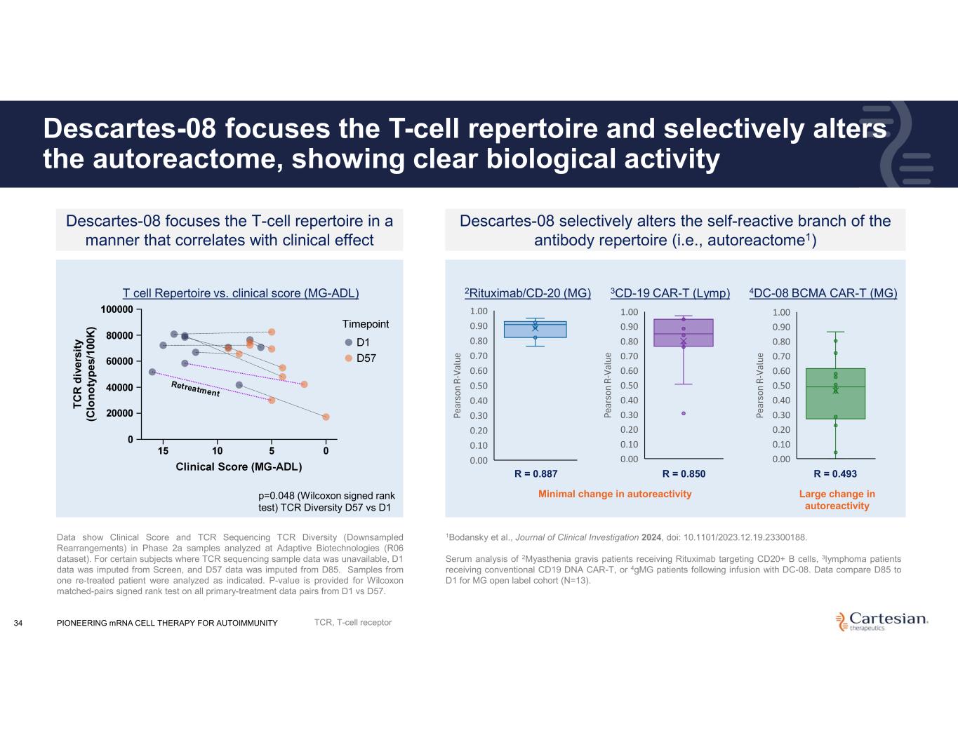 PIONEERING mRNA CELL THERAPY FOR AUTOIMMUNITY34 Descartes-08 focuses the T-cell repertoire and selectively alters the autoreactome, showing clear biological activity Descartes-08 focuses the T-cell repertoire in a manner that correlates with clinical effect p=0.048 (Wilcoxon signed rank test) TCR Diversity D57 vs D1 Data show Clinical Score and TCR Sequencing TCR Diversity (Downsampled Rearrangements) in Phase 2a samples analyzed at Adaptive Biotechnologies (R06 dataset). For certain subjects where TCR sequencing sample data was unavailable, D1 data was imputed from Screen, and D57 data was imputed from D85. Samples from one re-treated patient were analyzed as indicated. P-value is provided for Wilcoxon matched-pairs signed rank test on all primary-treatment data pairs from D1 vs D57. Descartes-08 selectively alters the self-reactive branch of the antibody repertoire (i.e., autoreactome1) 1Bodansky et al., Journal of Clinical Investigation 2024, doi: 10.1101/2023.12.19.23300188. Serum analysis of 2Myasthenia gravis patients receiving Rituximab targeting CD20+ B cells, 3lymphoma patients receiving conventional CD19 DNA CAR-T, or 4gMG patients following infusion with DC-08. Data compare D85 to D1 for MG open label cohort (N=13). Pe ar so n R- Va lu e 0.00 0.10 0.20 0.30 0.40 0.50 0.60 0.70 0.80 0.90 1.00 T C R d iv er si ty (C lo n o ty p es /1 00 K ) Minimal change in autoreactivity Pe ar so n R- Va lu e 0.00 0.10 0.20 0.30 0.40 0.50 0.60 0.70 0.80 0.90 1.00 R = 0.887 3CD-19 CAR-T (Lymp) Pe ar so n R- Va lu e 0.00 0.10 0.20 0.30 0.40 0.50 0.60 0.70 0.80 0.90 1.00 R = 0.850 4DC-08 BCMA CAR-T (MG) R = 0.493 2Rituximab/CD-20 (MG)T cell Repertoire vs. clinical score (MG-ADL) Large change in autoreactivity TCR, T-cell receptor