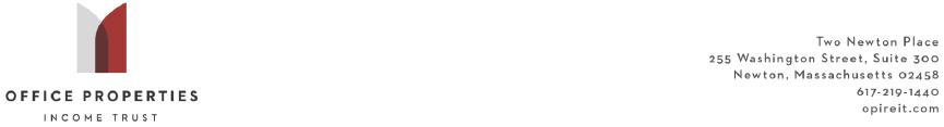 Newton, MA (May 1, 2024): Office Properties Income Trust (Nasdaq: OPI) (“OPI”) today announced that it is offering noteholders the option to exchange their outstanding senior unsecured notes due 2025, 2026, 2027 and 2031 for new 9.000% Senior Secured Notes due 2029 and related guarantees pursuant to the terms and conditions set forth in an Offering Memorandum dated as of May 1, 2024 (the “Offering Memorandum”).