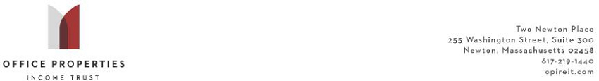 Office Properties Income Trust Announces Entry into Support Agreement with Certain Noteholders and Extension of Private Exchange Offers Relating to Existing Unsecured Senior Notes
