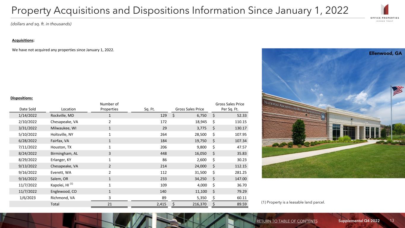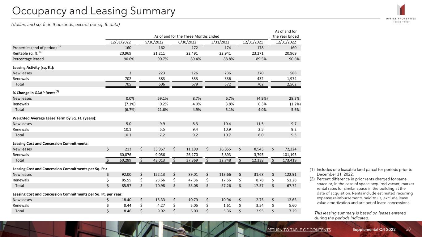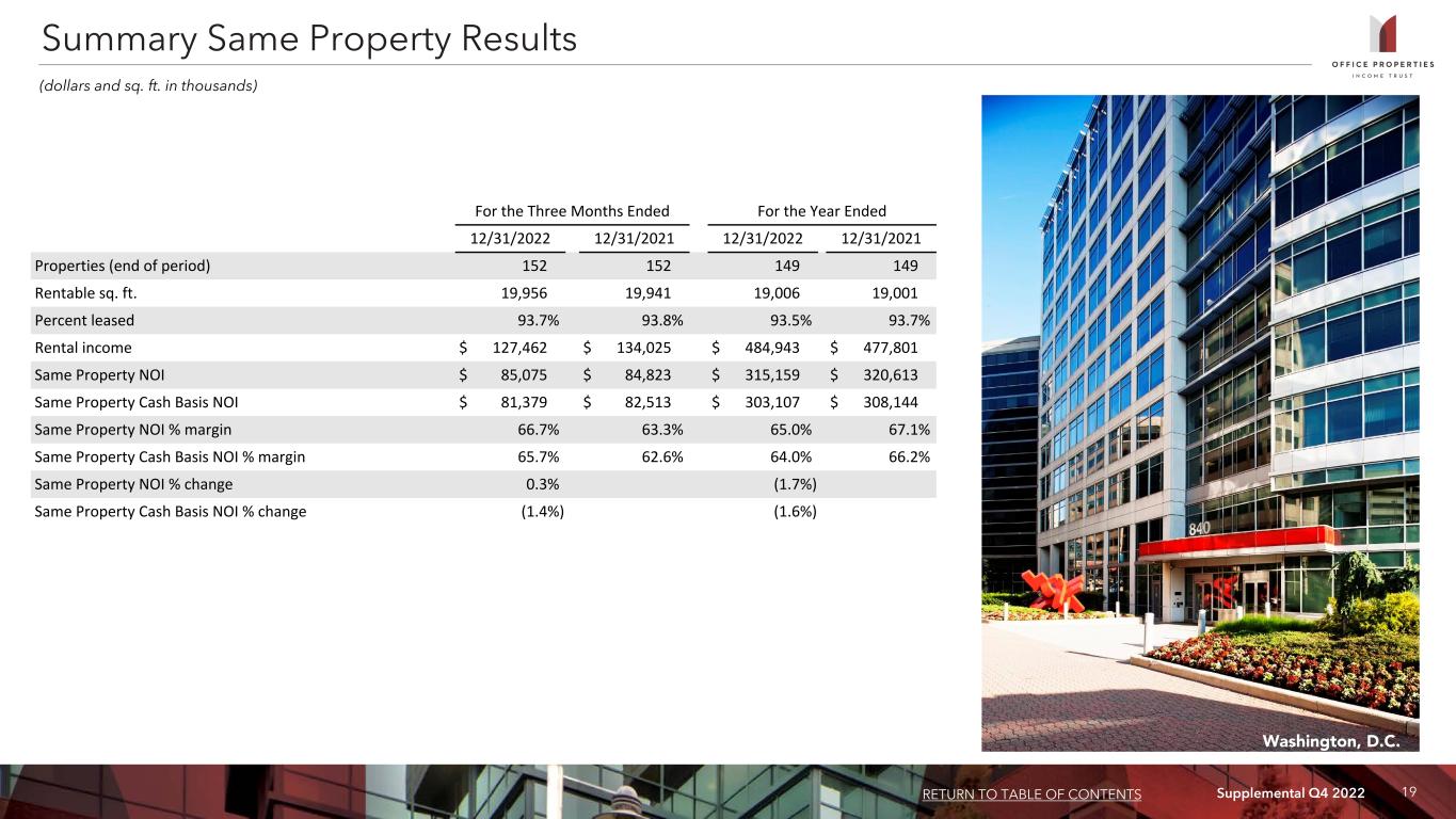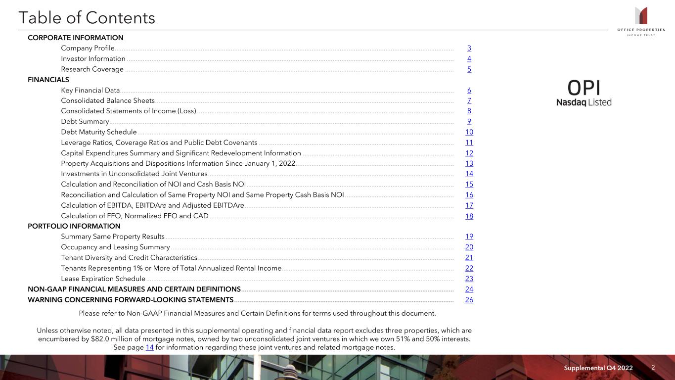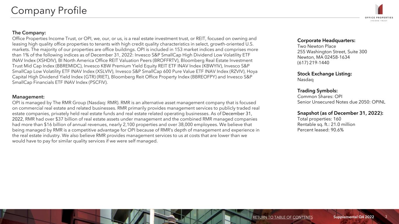 Supplemental Q4 2022 3 The Company: Office Properties Income Trust, or OPI, we, our, or us, is a real estate investment trust, or REIT, focused on owning and leasing high quality office properties to tenants with high credit quality characteristics in select, growth-oriented U.S. markets. The majority of our properties are office buildings. OPI is included in 153 market indices and comprises more than 1% of the following indices as of December 31, 2022: Invesco S&P SmallCap High Dividend Low Volatility ETF INAV Index (XSHDIV), BI North America Office REIT Valuation Peers (BROFFRTV), Bloomberg Real Estate Investment Trust Mid Cap Index (BBREMIDC), Invesco KBW Premium Yield Equity REIT ETF INAV Index (KBWYIV), Invesco S&P SmallCap Low Volatility ETF INAV Index (XSLVIV), Invesco S&P SmallCap 600 Pure Value ETF INAV Index (RZVIV), Hoya Capital High Dividend Yield Index (GTR) (RIET), Bloomberg Reit Office Property Index (BBREOFPY) and Invesco S&P SmallCap Financials ETF INAV Index (PSCFIV). Management: OPI is managed by The RMR Group (Nasdaq: RMR). RMR is an alternative asset management company that is focused on commercial real estate and related businesses. RMR primarily provides management services to publicly traded real estate companies, privately held real estate funds and real estate related operating businesses. As of December 31, 2022, RMR had over $37 billion of real estate assets under management and the combined RMR managed companies had more than $16 billion of annual revenues, nearly 2,100 properties and over 38,000 employees. We believe that being managed by RMR is a competitive advantage for OPI because of RMR’s depth of management and experience in the real estate industry. We also believe RMR provides management services to us at costs that are lower than we would have to pay for similar quality services if we were self managed. RETURN TO TABLE OF CONTENTS Corporate Headquarters: Two Newton Place 255 Washington Street, Suite 300 Newton, MA 02458-1634 (617) 219-1440 Stock Exchange Listing: Nasdaq Trading Symbols: Common Shares: OPI Senior Unsecured Notes due 2050: OPINL Snapshot (as of December 31, 2022): Total properties: 160 Rentable sq. ft.: 21.0 million Percent leased: 90.6% Company Profile