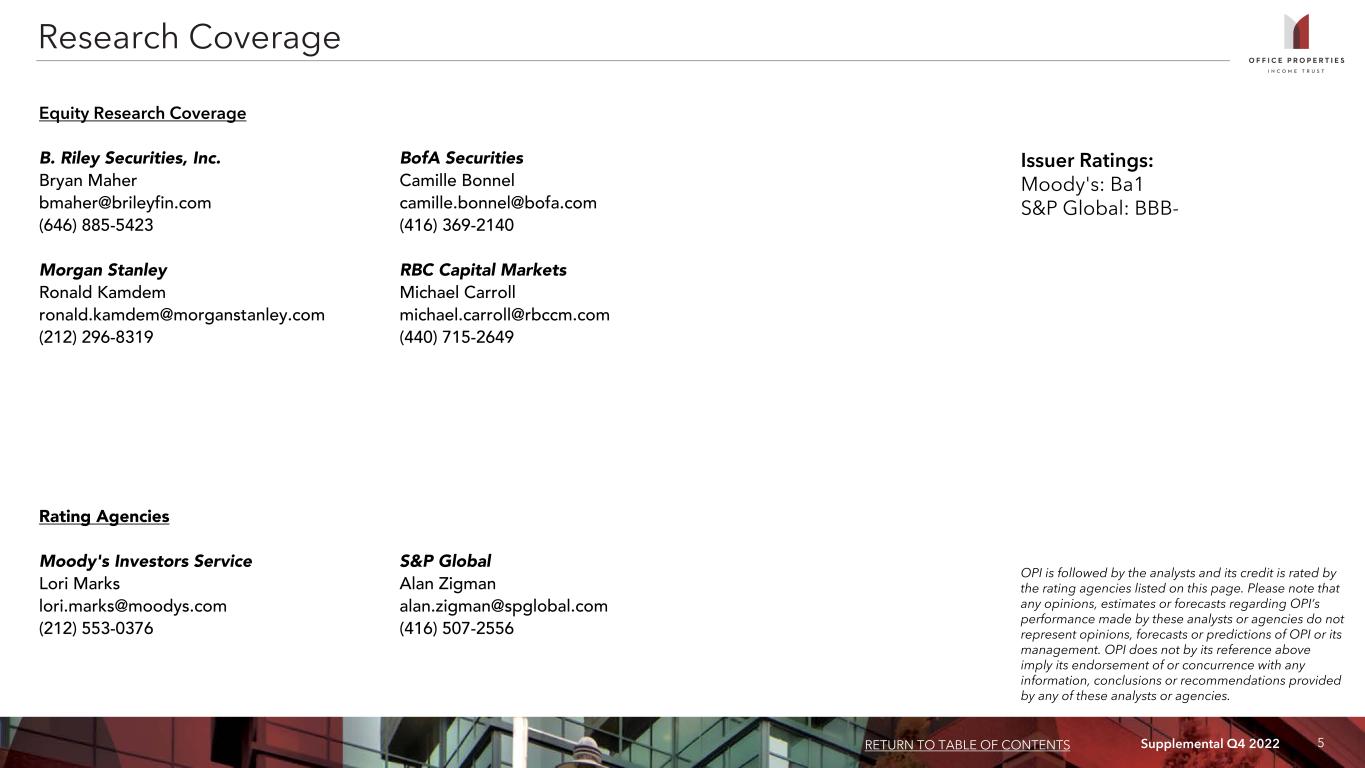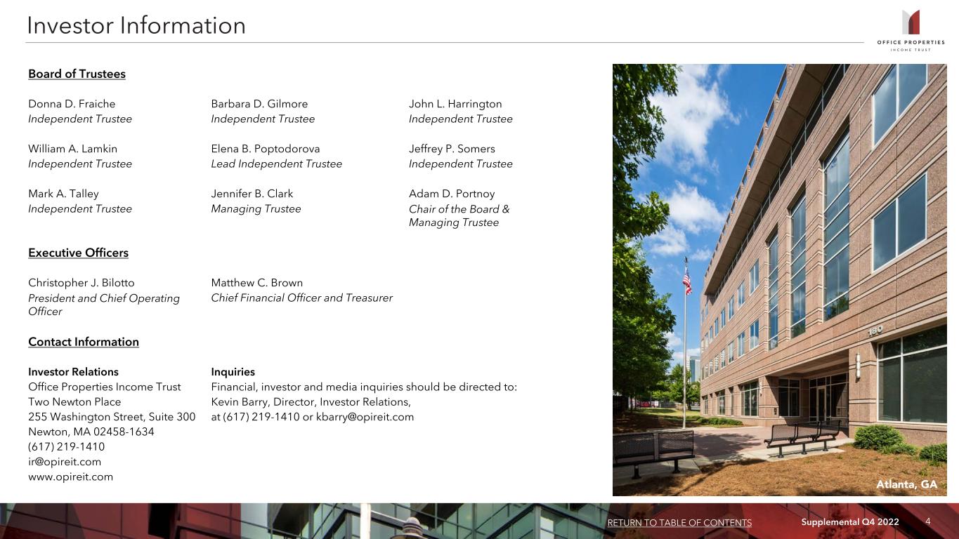 Supplemental Q4 2022 4 Board of Trustees Donna D. Fraiche Barbara D. Gilmore John L. Harrington Independent Trustee Independent Trustee Independent Trustee William A. Lamkin Elena B. Poptodorova Jeffrey P. Somers Independent Trustee Lead Independent Trustee Independent Trustee Mark A. Talley Jennifer B. Clark Adam D. Portnoy Independent Trustee Managing Trustee Chair of the Board & Managing Trustee Executive Officers Christopher J. Bilotto Matthew C. Brown President and Chief Operating Officer Chief Financial Officer and Treasurer Contact Information Investor Relations Inquiries Office Properties Income Trust Financial, investor and media inquiries should be directed to: Two Newton Place Kevin Barry, Director, Investor Relations, 255 Washington Street, Suite 300 at (617) 219-1410 or kbarry@opireit.com Newton, MA 02458-1634 (617) 219-1410 ir@opireit.com www.opireit.com Investor Information RETURN TO TABLE OF CONTENTS Atlanta, GA