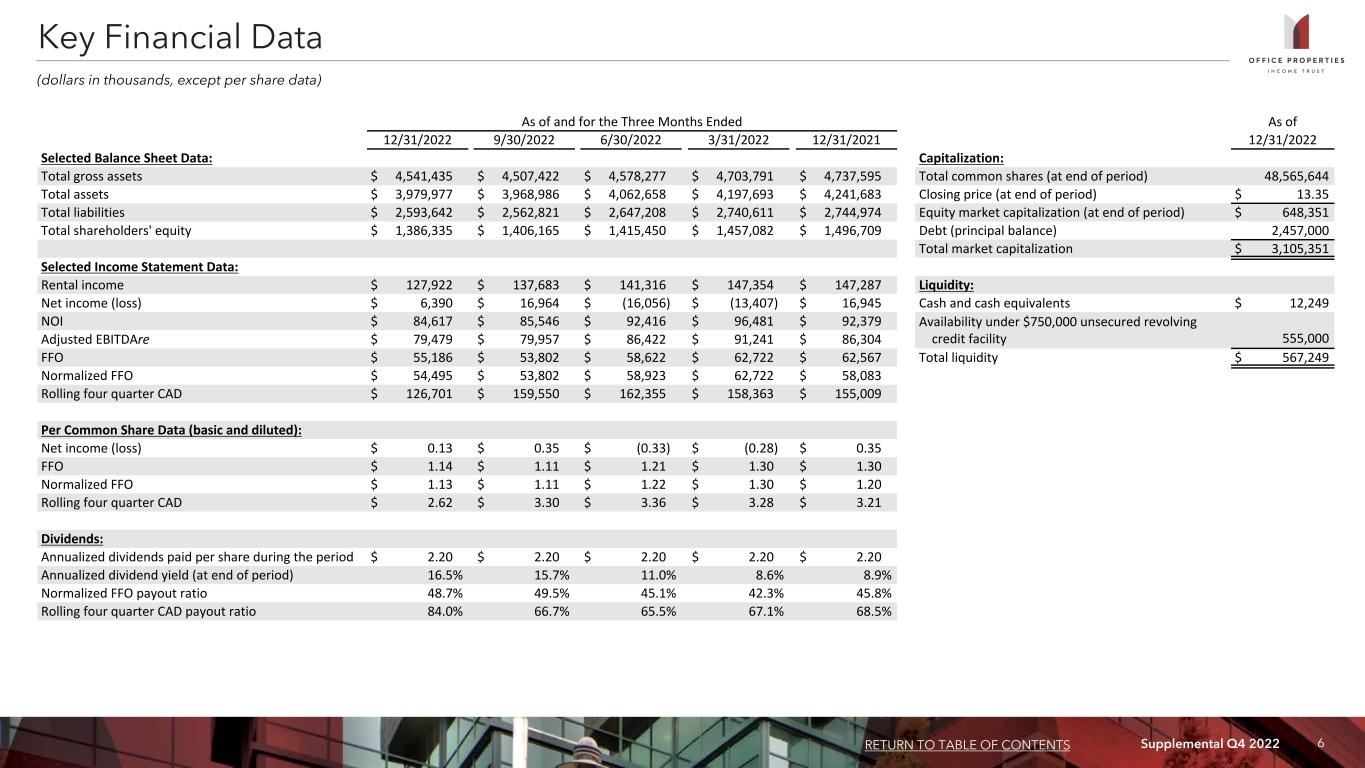 Supplemental Q4 2022 6 As of and for the Three Months Ended As of 12/31/2022 9/30/2022 6/30/2022 3/31/2022 12/31/2021 12/31/2022 Selected Balance Sheet Data: Capitalization: Total gross assets $ 4,541,435 $ 4,507,422 $ 4,578,277 $ 4,703,791 $ 4,737,595 Total common shares (at end of period) 48,565,644 Total assets $ 3,979,977 $ 3,968,986 $ 4,062,658 $ 4,197,693 $ 4,241,683 Closing price (at end of period) $ 13.35 Total liabilities $ 2,593,642 $ 2,562,821 $ 2,647,208 $ 2,740,611 $ 2,744,974 Equity market capitalization (at end of period) $ 648,351 Total shareholders' equity $ 1,386,335 $ 1,406,165 $ 1,415,450 $ 1,457,082 $ 1,496,709 Debt (principal balance) 2,457,000 Total market capitalization $ 3,105,351 Selected Income Statement Data: Rental income $ 127,922 $ 137,683 $ 141,316 $ 147,354 $ 147,287 Liquidity: Net income (loss) $ 6,390 $ 16,964 $ (16,056) $ (13,407) $ 16,945 Cash and cash equivalents $ 12,249 NOI $ 84,617 $ 85,546 $ 92,416 $ 96,481 $ 92,379 Availability under $750,000 unsecured revolving credit facility 555,000 Adjusted EBITDAre $ 79,479 $ 79,957 $ 86,422 $ 91,241 $ 86,304 FFO $ 55,186 $ 53,802 $ 58,622 $ 62,722 $ 62,567 Total liquidity $ 567,249 Normalized FFO $ 54,495 $ 53,802 $ 58,923 $ 62,722 $ 58,083 Rolling four quarter CAD $ 126,701 $ 159,550 $ 162,355 $ 158,363 $ 155,009 Per Common Share Data (basic and diluted): Net income (loss) $ 0.13 $ 0.35 $ (0.33) $ (0.28) $ 0.35 FFO $ 1.14 $ 1.11 $ 1.21 $ 1.30 $ 1.30 Normalized FFO $ 1.13 $ 1.11 $ 1.22 $ 1.30 $ 1.20 Rolling four quarter CAD $ 2.62 $ 3.30 $ 3.36 $ 3.28 $ 3.21 Dividends: Annualized dividends paid per share during the period $ 2.20 $ 2.20 $ 2.20 $ 2.20 $ 2.20 Annualized dividend yield (at end of period) 16.5% 15.7% 11.0% 8.6% 8.9% Normalized FFO payout ratio 48.7% 49.5% 45.1% 42.3% 45.8% Rolling four quarter CAD payout ratio 84.0% 66.7% 65.5% 67.1% 68.5% (dollars in thousands, except per share data) RETURN TO TABLE OF CONTENTS Key Financial Data
