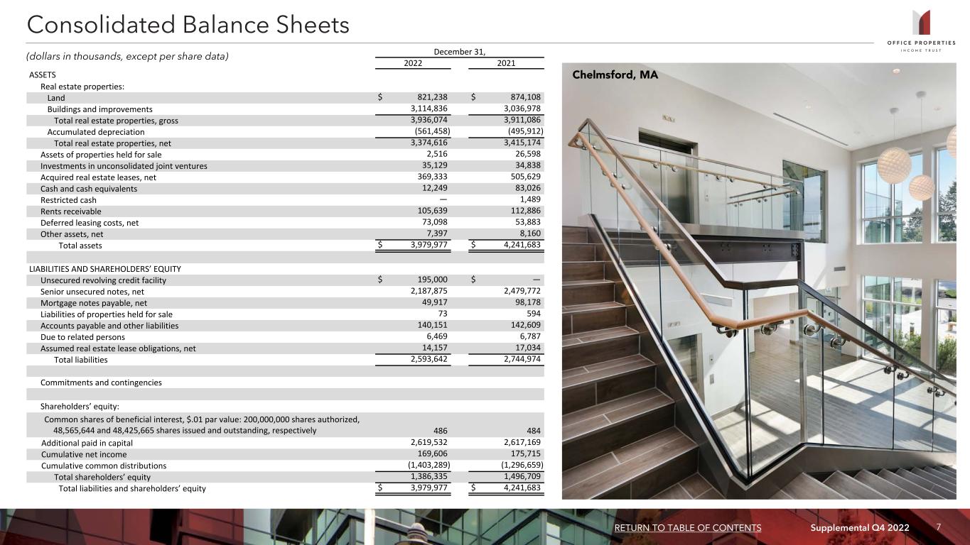 Supplemental Q4 2022 7 December 31, 2022 2021 ASSETS Real estate properties: Land $ 821,238 $ 874,108 Buildings and improvements 3,114,836 3,036,978 Total real estate properties, gross 3,936,074 3,911,086 Accumulated depreciation (561,458) (495,912) Total real estate properties, net 3,374,616 3,415,174 Assets of properties held for sale 2,516 26,598 Investments in unconsolidated joint ventures 35,129 34,838 Acquired real estate leases, net 369,333 505,629 Cash and cash equivalents 12,249 83,026 Restricted cash — 1,489 Rents receivable 105,639 112,886 Deferred leasing costs, net 73,098 53,883 Other assets, net 7,397 8,160 Total assets $ 3,979,977 $ 4,241,683 LIABILITIES AND SHAREHOLDERS’ EQUITY Unsecured revolving credit facility $ 195,000 $ — Senior unsecured notes, net 2,187,875 2,479,772 Mortgage notes payable, net 49,917 98,178 Liabilities of properties held for sale 73 594 Accounts payable and other liabilities 140,151 142,609 Due to related persons 6,469 6,787 Assumed real estate lease obligations, net 14,157 17,034 Total liabilities 2,593,642 2,744,974 Commitments and contingencies Shareholders’ equity: Common shares of beneficial interest, $.01 par value: 200,000,000 shares authorized, 48,565,644 and 48,425,665 shares issued and outstanding, respectively 486 484 Additional paid in capital 2,619,532 2,617,169 Cumulative net income 169,606 175,715 Cumulative common distributions (1,403,289) (1,296,659) Total shareholders’ equity 1,386,335 1,496,709 Total liabilities and shareholders’ equity $ 3,979,977 $ 4,241,683 Consolidated Balance Sheets (dollars in thousands, except per share data) RETURN TO TABLE OF CONTENTS Chelmsford, MA