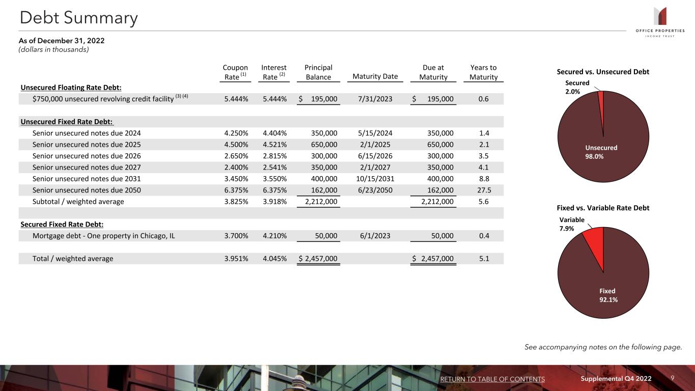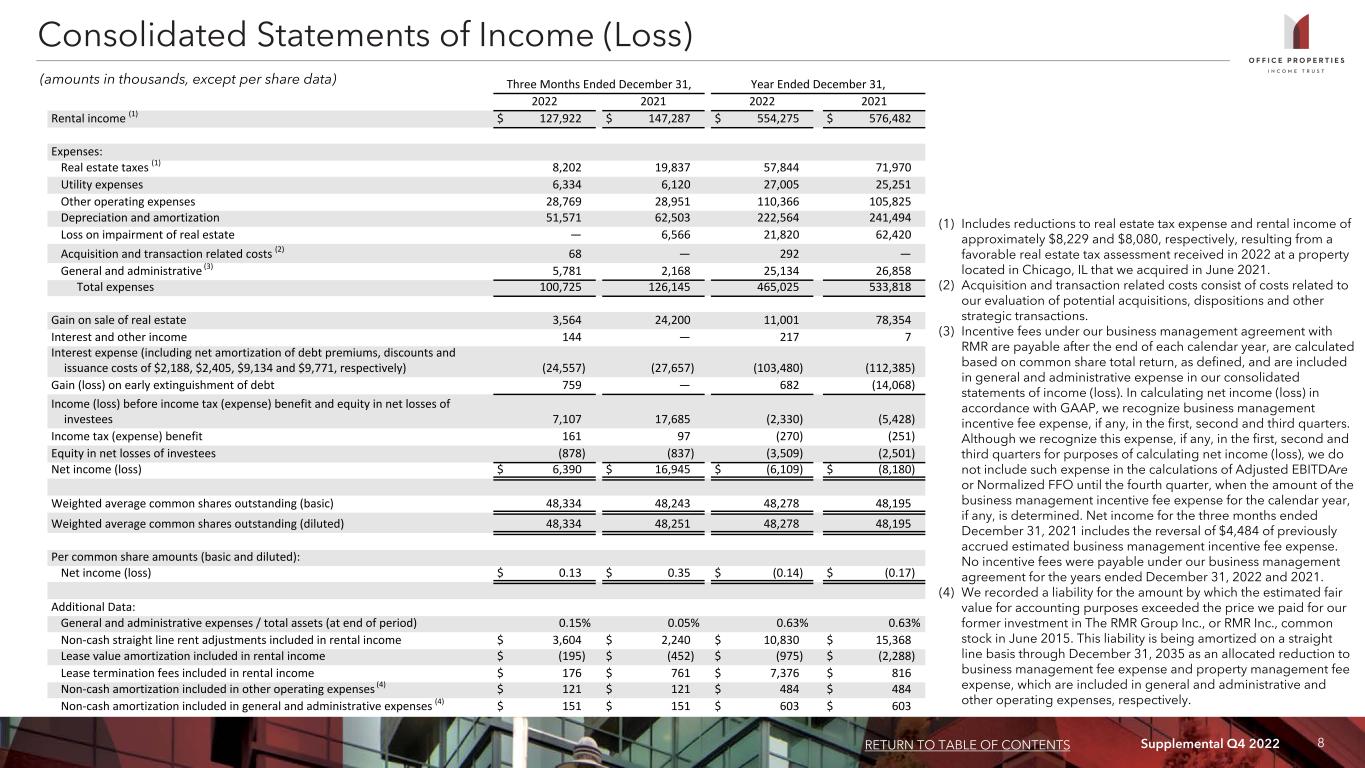 Supplemental Q4 2022 8 Three Months Ended December 31, Year Ended December 31, 2022 2021 2022 2021 Rental income (1) $ 127,922 $ 147,287 $ 554,275 $ 576,482 Expenses: Real estate taxes (1) 8,202 19,837 57,844 71,970 Utility expenses 6,334 6,120 27,005 25,251 Other operating expenses 28,769 28,951 110,366 105,825 Depreciation and amortization 51,571 62,503 222,564 241,494 Loss on impairment of real estate — 6,566 21,820 62,420 Acquisition and transaction related costs (2) 68 — 292 — General and administrative (3) 5,781 2,168 25,134 26,858 Total expenses 100,725 126,145 465,025 533,818 Gain on sale of real estate 3,564 24,200 11,001 78,354 Interest and other income 144 — 217 7 Interest expense (including net amortization of debt premiums, discounts and issuance costs of $2,188, $2,405, $9,134 and $9,771, respectively) (24,557) (27,657) (103,480) (112,385) Gain (loss) on early extinguishment of debt 759 — 682 (14,068) Income (loss) before income tax (expense) benefit and equity in net losses of investees 7,107 17,685 (2,330) (5,428) Income tax (expense) benefit 161 97 (270) (251) Equity in net losses of investees (878) (837) (3,509) (2,501) Net income (loss) $ 6,390 $ 16,945 $ (6,109) $ (8,180) Weighted average common shares outstanding (basic) 48,334 48,243 48,278 48,195 Weighted average common shares outstanding (diluted) 48,334 48,251 48,278 48,195 Per common share amounts (basic and diluted): Net income (loss) $ 0.13 $ 0.35 $ (0.14) $ (0.17) Additional Data: General and administrative expenses / total assets (at end of period) 0.15% 0.05% 0.63% 0.63% Non-cash straight line rent adjustments included in rental income $ 3,604 $ 2,240 $ 10,830 $ 15,368 Lease value amortization included in rental income $ (195) $ (452) $ (975) $ (2,288) Lease termination fees included in rental income $ 176 $ 761 $ 7,376 $ 816 Non-cash amortization included in other operating expenses (4) $ 121 $ 121 $ 484 $ 484 Non-cash amortization included in general and administrative expenses (4) $ 151 $ 151 $ 603 $ 603 (amounts in thousands, except per share data) RETURN TO TABLE OF CONTENTS (1) Includes reductions to real estate tax expense and rental income of approximately $8,229 and $8,080, respectively, resulting from a favorable real estate tax assessment received in 2022 at a property located in Chicago, IL that we acquired in June 2021. (2) Acquisition and transaction related costs consist of costs related to our evaluation of potential acquisitions, dispositions and other strategic transactions. (3) Incentive fees under our business management agreement with RMR are payable after the end of each calendar year, are calculated based on common share total return, as defined, and are included in general and administrative expense in our consolidated statements of income (loss). In calculating net income (loss) in accordance with GAAP, we recognize business management incentive fee expense, if any, in the first, second and third quarters. Although we recognize this expense, if any, in the first, second and third quarters for purposes of calculating net income (loss), we do not include such expense in the calculations of Adjusted EBITDAre or Normalized FFO until the fourth quarter, when the amount of the business management incentive fee expense for the calendar year, if any, is determined. Net income for the three months ended December 31, 2021 includes the reversal of $4,484 of previously accrued estimated business management incentive fee expense. No incentive fees were payable under our business management agreement for the years ended December 31, 2022 and 2021. (4) We recorded a liability for the amount by which the estimated fair value for accounting purposes exceeded the price we paid for our former investment in The RMR Group Inc., or RMR Inc., common stock in June 2015. This liability is being amortized on a straight line basis through December 31, 2035 as an allocated reduction to business management fee expense and property management fee expense, which are included in general and administrative and other operating expenses, respectively. Consolidated Statements of Income (Loss)