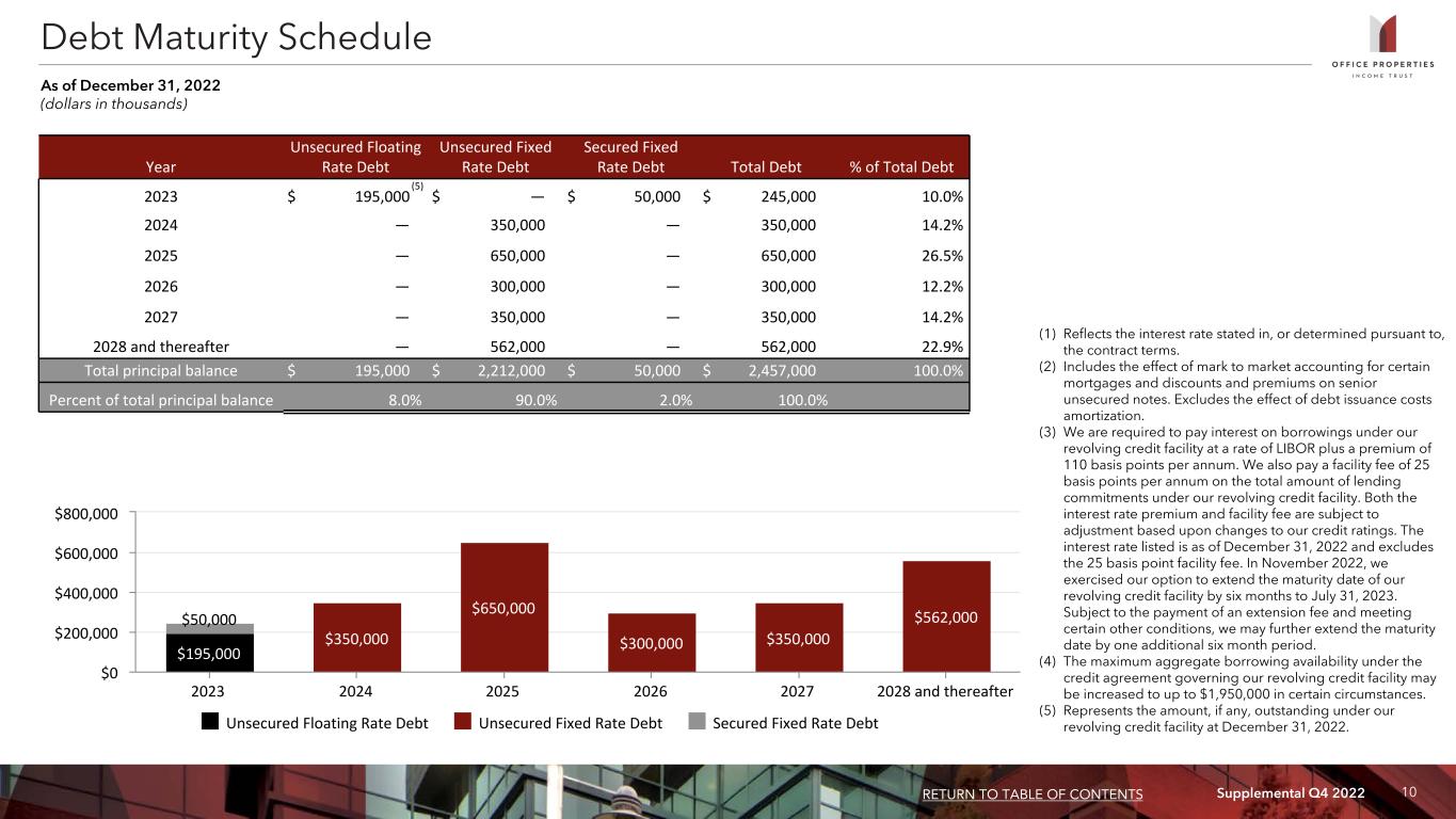 Supplemental Q4 2022 9 Fixed vs. Variable Rate Debt Fixed 92.1% Variable 7.9% Coupon Rate (1) Interest Rate (2) Principal Balance Maturity Date Due at Maturity Years to Maturity Unsecured Floating Rate Debt: $750,000 unsecured revolving credit facility (3) (4) 5.444% 5.444% $ 195,000 7/31/2023 $ 195,000 0.6 Unsecured Fixed Rate Debt: Senior unsecured notes due 2024 4.250% 4.404% 350,000 5/15/2024 350,000 1.4 Senior unsecured notes due 2025 4.500% 4.521% 650,000 2/1/2025 650,000 2.1 Senior unsecured notes due 2026 2.650% 2.815% 300,000 6/15/2026 300,000 3.5 Senior unsecured notes due 2027 2.400% 2.541% 350,000 2/1/2027 350,000 4.1 Senior unsecured notes due 2031 3.450% 3.550% 400,000 10/15/2031 400,000 8.8 Senior unsecured notes due 2050 6.375% 6.375% 162,000 6/23/2050 162,000 27.5 Subtotal / weighted average 3.825% 3.918% 2,212,000 2,212,000 5.6 Secured Fixed Rate Debt: Mortgage debt - One property in Chicago, IL 3.700% 4.210% 50,000 6/1/2023 50,000 0.4 Total / weighted average 3.951% 4.045% $ 2,457,000 $ 2,457,000 5.1 See accompanying notes on the following page. Secured vs. Unsecured Debt Unsecured 98.0% Secured 2.0% Debt Summary As of December 31, 2022 (dollars in thousands) RETURN TO TABLE OF CONTENTS