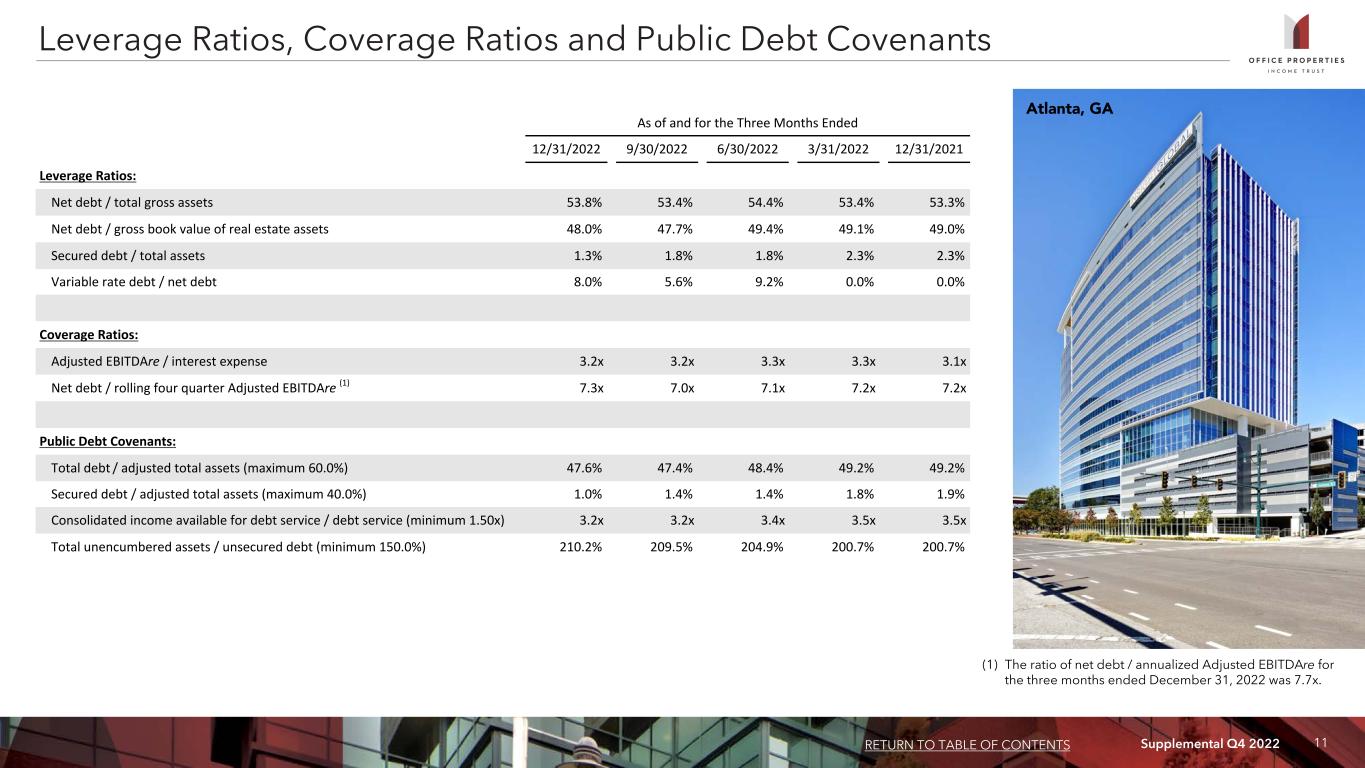 Supplemental Q4 2022 11 Leverage Ratios, Coverage Ratios and Public Debt Covenants RETURN TO TABLE OF CONTENTS As of and for the Three Months Ended 12/31/2022 9/30/2022 6/30/2022 3/31/2022 12/31/2021 Leverage Ratios: Net debt / total gross assets 53.8% 53.4% 54.4% 53.4% 53.3% Net debt / gross book value of real estate assets 48.0% 47.7% 49.4% 49.1% 49.0% Secured debt / total assets 1.3% 1.8% 1.8% 2.3% 2.3% Variable rate debt / net debt 8.0% 5.6% 9.2% 0.0% 0.0% Coverage Ratios: Adjusted EBITDAre / interest expense 3.2x 3.2x 3.3x 3.3x 3.1x Net debt / rolling four quarter Adjusted EBITDAre (1) 7.3x 7.0x 7.1x 7.2x 7.2x Public Debt Covenants: Total debt / adjusted total assets (maximum 60.0%) 47.6% 47.4% 48.4% 49.2% 49.2% Secured debt / adjusted total assets (maximum 40.0%) 1.0% 1.4% 1.4% 1.8% 1.9% Consolidated income available for debt service / debt service (minimum 1.50x) 3.2x 3.2x 3.4x 3.5x 3.5x Total unencumbered assets / unsecured debt (minimum 150.0%) 210.2% 209.5% 204.9% 200.7% 200.7% (1) The ratio of net debt / annualized Adjusted EBITDAre for the three months ended December 31, 2022 was 7.7x. Atlanta, GA