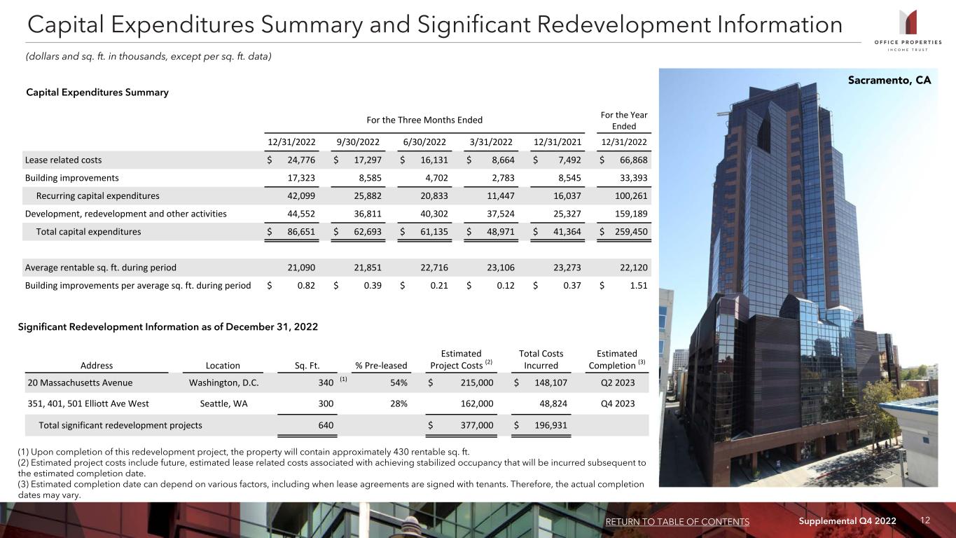 Supplemental Q4 2022 12 For the Three Months Ended For the Year Ended 12/31/2022 9/30/2022 6/30/2022 3/31/2022 12/31/2021 12/31/2022 Lease related costs $ 24,776 $ 17,297 $ 16,131 $ 8,664 $ 7,492 $ 66,868 Building improvements 17,323 8,585 4,702 2,783 8,545 33,393 Recurring capital expenditures 42,099 25,882 20,833 11,447 16,037 100,261 Development, redevelopment and other activities 44,552 36,811 40,302 37,524 25,327 159,189 Total capital expenditures $ 86,651 $ 62,693 $ 61,135 $ 48,971 $ 41,364 $ 259,450 Average rentable sq. ft. during period 21,090 21,851 22,716 23,106 23,273 22,120 Building improvements per average sq. ft. during period $ 0.82 $ 0.39 $ 0.21 $ 0.12 $ 0.37 $ 1.51 Capital Expenditures Summary and Significant Redevelopment Information (dollars and sq. ft. in thousands, except per sq. ft. data) RETURN TO TABLE OF CONTENTS Address Location Sq. Ft. % Pre-leased Estimated Project Costs (2) Total Costs Incurred Estimated Completion (3) 20 Massachusetts Avenue Washington, D.C. 340 (1) 54% $ 215,000 $ 148,107 Q2 2023 351, 401, 501 Elliott Ave West Seattle, WA 300 28% 162,000 48,824 Q4 2023 Total significant redevelopment projects 640 $ 377,000 $ 196,931 Significant Redevelopment Information as of December 31, 2022 (1) Upon completion of this redevelopment project, the property will contain approximately 430 rentable sq. ft. (2) Estimated project costs include future, estimated lease related costs associated with achieving stabilized occupancy that will be incurred subsequent to the estimated completion date. (3) Estimated completion date can depend on various factors, including when lease agreements are signed with tenants. Therefore, the actual completion dates may vary. Capital Expenditures Summary Sacramento, CA