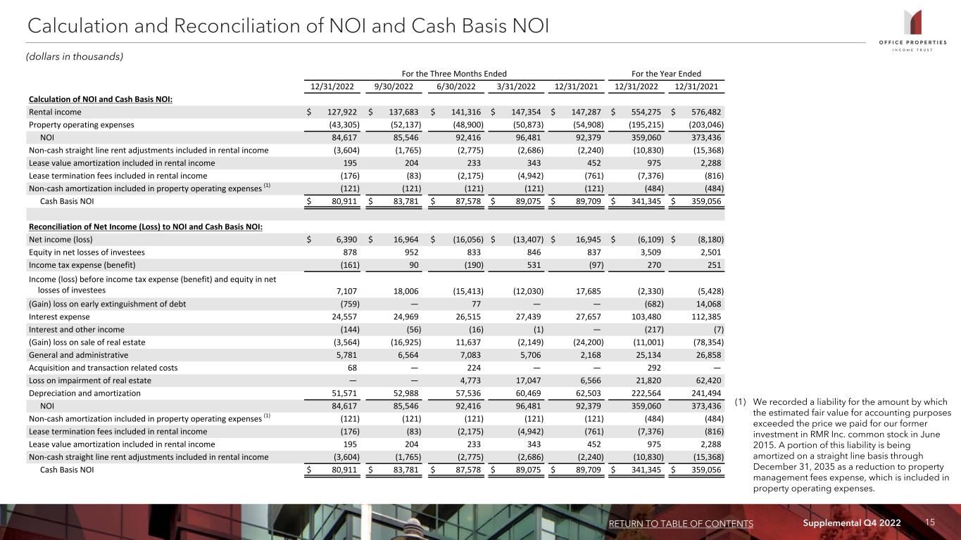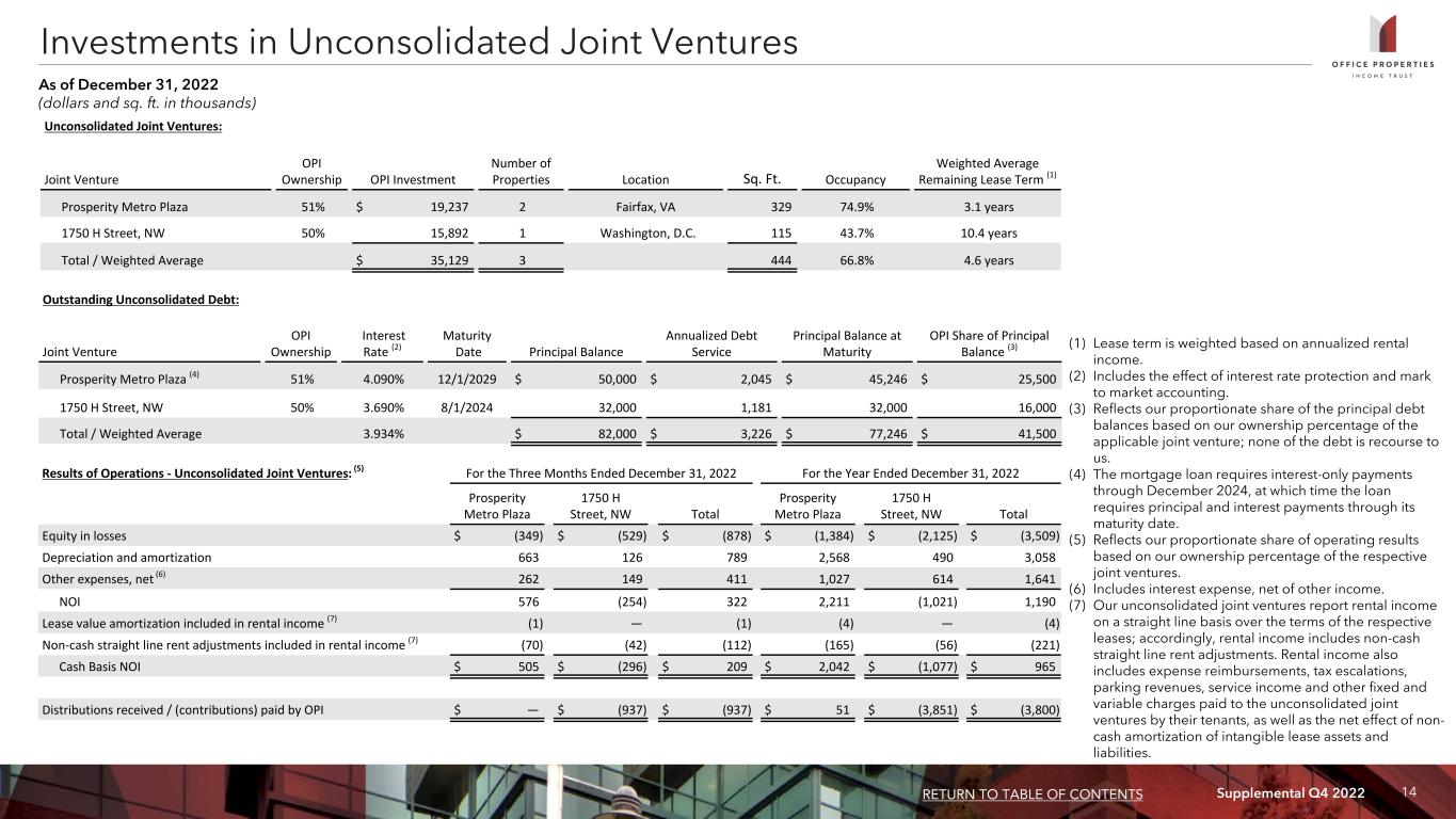 Supplemental Q4 2022 14 Unconsolidated Joint Ventures: Joint Venture OPI Ownership OPI Investment Number of Properties Location Sq. Ft. Occupancy Weighted Average Remaining Lease Term (1) Prosperity Metro Plaza 51% $ 19,237 2 Fairfax, VA 329 74.9% 3.1 years 1750 H Street, NW 50% 15,892 1 Washington, D.C. 115 43.7% 10.4 years Total / Weighted Average $ 35,129 3 444 66.8% 4.6 years (1) Lease term is weighted based on annualized rental income. (2) Includes the effect of interest rate protection and mark to market accounting. (3) Reflects our proportionate share of the principal debt balances based on our ownership percentage of the applicable joint venture; none of the debt is recourse to us. (4) The mortgage loan requires interest-only payments through December 2024, at which time the loan requires principal and interest payments through its maturity date. (5) Reflects our proportionate share of operating results based on our ownership percentage of the respective joint ventures. (6) Includes interest expense, net of other income. (7) Our unconsolidated joint ventures report rental income on a straight line basis over the terms of the respective leases; accordingly, rental income includes non-cash straight line rent adjustments. Rental income also includes expense reimbursements, tax escalations, parking revenues, service income and other fixed and variable charges paid to the unconsolidated joint ventures by their tenants, as well as the net effect of non- cash amortization of intangible lease assets and liabilities. Investments in Unconsolidated Joint Ventures As of December 31, 2022 (dollars and sq. ft. in thousands) RETURN TO TABLE OF CONTENTS Results of Operations - Unconsolidated Joint Ventures: (5) For the Three Months Ended December 31, 2022 For the Year Ended December 31, 2022 Prosperity Metro Plaza 1750 H Street, NW Total Prosperity Metro Plaza 1750 H Street, NW Total Equity in losses $ (349) $ (529) $ (878) $ (1,384) $ (2,125) $ (3,509) Depreciation and amortization 663 126 789 2,568 490 3,058 Other expenses, net (6) 262 149 411 1,027 614 1,641 NOI 576 (254) 322 2,211 (1,021) 1,190 Lease value amortization included in rental income (7) (1) — (1) (4) — (4) Non-cash straight line rent adjustments included in rental income (7) (70) (42) (112) (165) (56) (221) Cash Basis NOI $ 505 $ (296) $ 209 $ 2,042 $ (1,077) $ 965 Distributions received / (contributions) paid by OPI $ — $ (937) $ (937) $ 51 $ (3,851) $ (3,800) Outstanding Unconsolidated Debt: Joint Venture OPI Ownership Interest Rate (2) Maturity Date Principal Balance Annualized Debt Service Principal Balance at Maturity OPI Share of Principal Balance (3) Prosperity Metro Plaza (4) 51% 4.090% 12/1/2029 $ 50,000 $ 2,045 $ 45,246 $ 25,500 1750 H Street, NW 50% 3.690% 8/1/2024 32,000 1,181 32,000 16,000 Total / Weighted Average 3.934% $ 82,000 $ 3,226 $ 77,246 $ 41,500