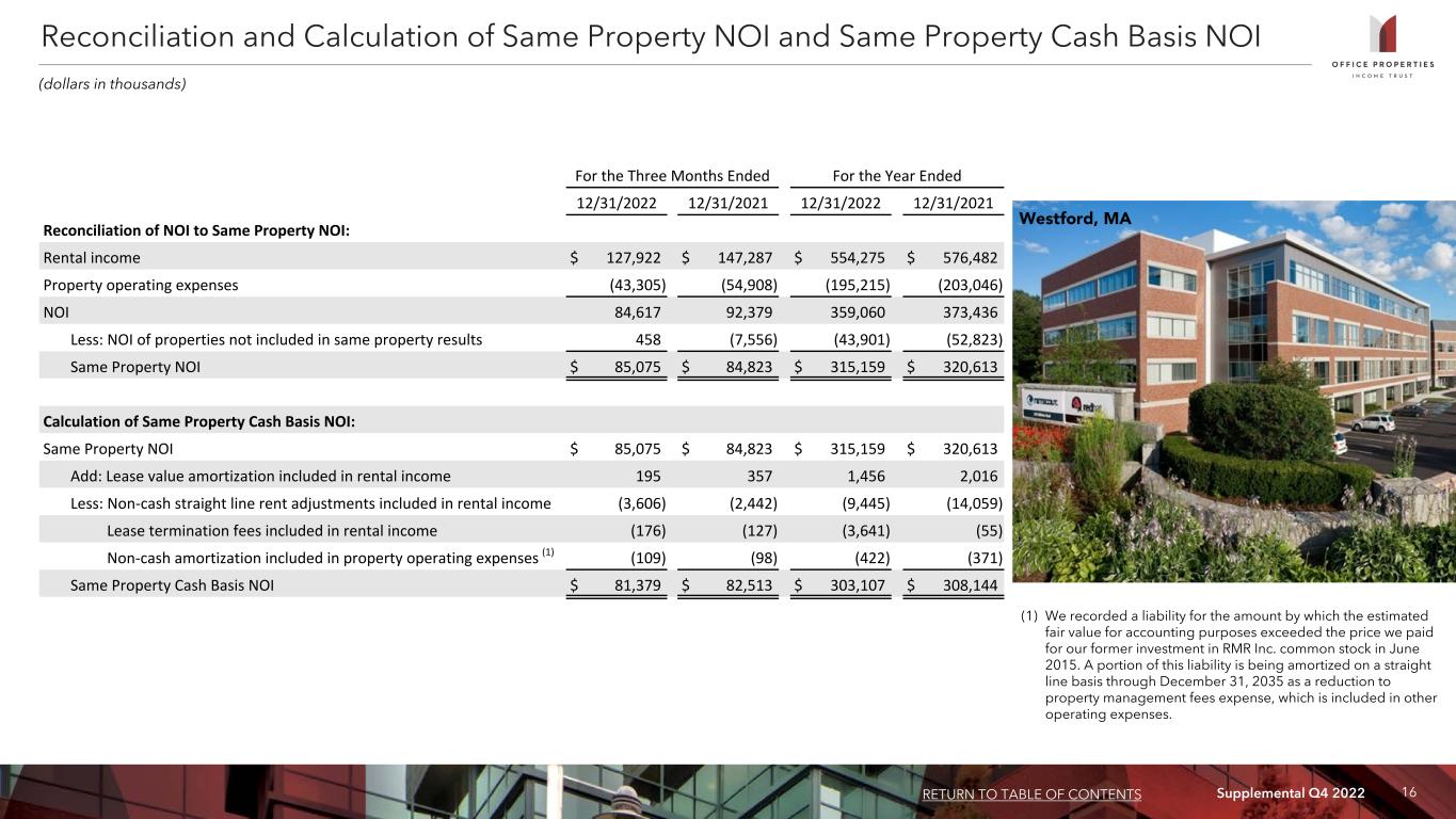 Supplemental Q4 2022 16 For the Three Months Ended For the Year Ended 12/31/2022 12/31/2021 12/31/2022 12/31/2021 Reconciliation of NOI to Same Property NOI: Rental income $ 127,922 $ 147,287 $ 554,275 $ 576,482 Property operating expenses (43,305) (54,908) (195,215) (203,046) NOI 84,617 92,379 359,060 373,436 Less: NOI of properties not included in same property results 458 (7,556) (43,901) (52,823) Same Property NOI $ 85,075 $ 84,823 $ 315,159 $ 320,613 Calculation of Same Property Cash Basis NOI: Same Property NOI $ 85,075 $ 84,823 $ 315,159 $ 320,613 Add: Lease value amortization included in rental income 195 357 1,456 2,016 Less: Non-cash straight line rent adjustments included in rental income (3,606) (2,442) (9,445) (14,059) Lease termination fees included in rental income (176) (127) (3,641) (55) Non-cash amortization included in property operating expenses (1) (109) (98) (422) (371) Same Property Cash Basis NOI $ 81,379 $ 82,513 $ 303,107 $ 308,144 (1) We recorded a liability for the amount by which the estimated fair value for accounting purposes exceeded the price we paid for our former investment in RMR Inc. common stock in June 2015. A portion of this liability is being amortized on a straight line basis through December 31, 2035 as a reduction to property management fees expense, which is included in other operating expenses. Reconciliation and Calculation of Same Property NOI and Same Property Cash Basis NOI (dollars in thousands) RETURN TO TABLE OF CONTENTS Westford, MA