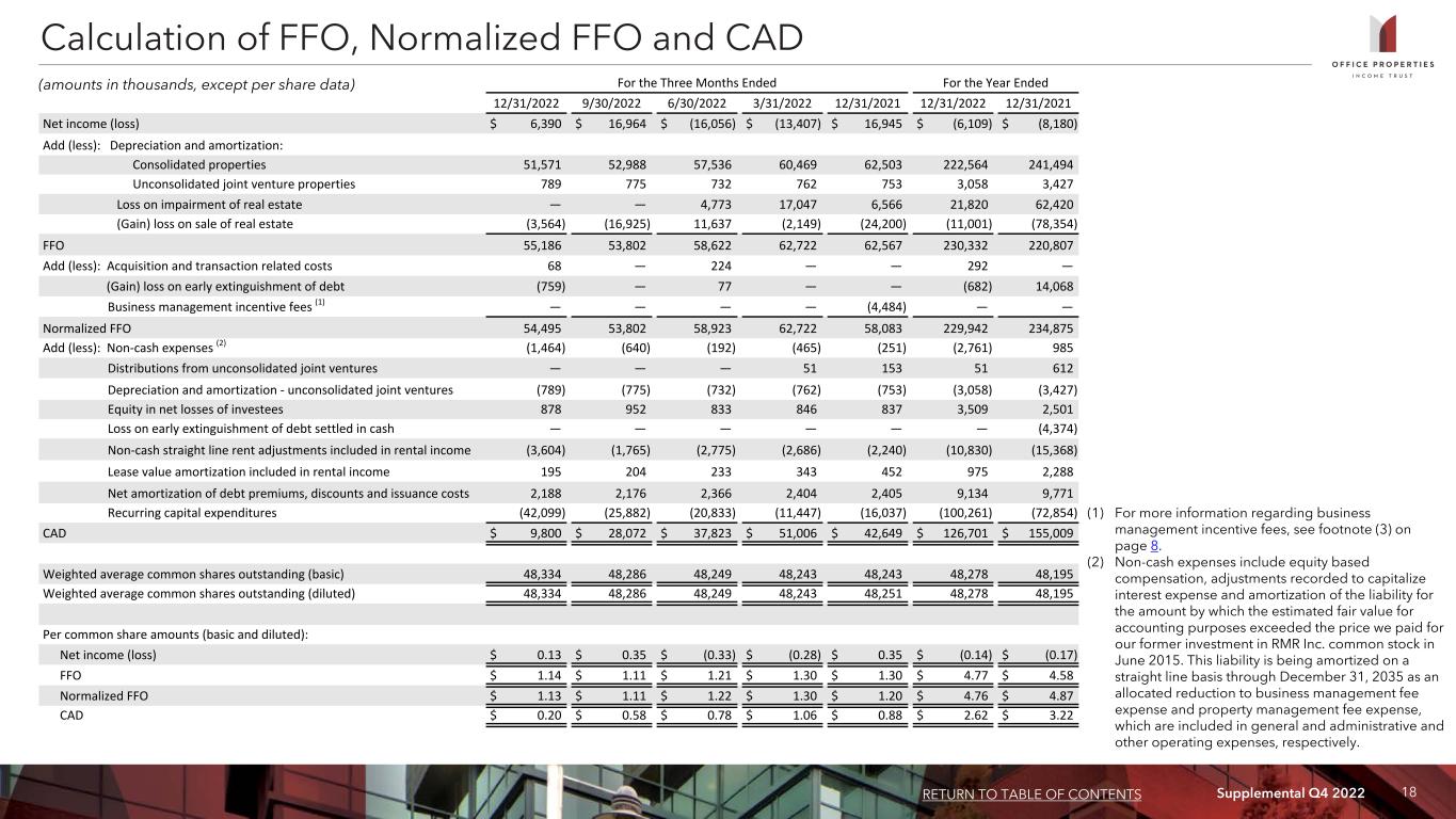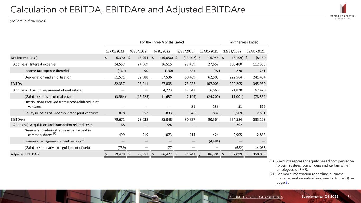 Supplemental Q4 2022 17 For the Three Months Ended For the Year Ended 12/31/2022 9/30/2022 6/30/2022 3/31/2022 12/31/2021 12/31/2022 12/31/2021 Net income (loss) $ 6,390 $ 16,964 $ (16,056) $ (13,407) $ 16,945 $ (6,109) $ (8,180) Add (less): Interest expense 24,557 24,969 26,515 27,439 27,657 103,480 112,385 Income tax expense (benefit) (161) 90 (190) 531 (97) 270 251 Depreciation and amortization 51,571 52,988 57,536 60,469 62,503 222,564 241,494 EBITDA 82,357 95,011 67,805 75,032 107,008 320,205 345,950 Add (less): Loss on impairment of real estate — — 4,773 17,047 6,566 21,820 62,420 (Gain) loss on sale of real estate (3,564) (16,925) 11,637 (2,149) (24,200) (11,001) (78,354) Distributions received from unconsolidated joint ventures — — — 51 153 51 612 Equity in losses of unconsolidated joint ventures 878 952 833 846 837 3,509 2,501 EBITDAre 79,671 79,038 85,048 90,827 90,364 334,584 333,129 Add (less): Acquisition and transaction related costs 68 — 224 — — 292 — General and administrative expense paid in common shares (1) 499 919 1,073 414 424 2,905 2,868 Business management incentive fees (2) — — — — (4,484) — — (Gain) loss on early extinguishment of debt (759) — 77 — — (682) 14,068 Adjusted EBITDAre $ 79,479 $ 79,957 $ 86,422 $ 91,241 $ 86,304 $ 337,099 $ 350,065 Calculation of EBITDA, EBITDAre and Adjusted EBITDAre (dollars in thousands) (1) Amounts represent equity based compensation to our Trustees, our officers and certain other employees of RMR. (2) For more information regarding business management incentive fees, see footnote (3) on page 8. RETURN TO TABLE OF CONTENTS