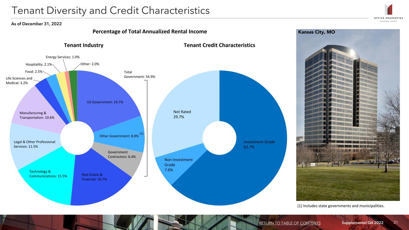 Supplemental Q4 2022 21 Investment Grade 62.7% Non-Investment Grade 7.6% Not Rated 29.7% Percentage of Total Annualized Rental Income Tenant Credit Characteristics ( 4 ) (3) Tenant Industry Tenant Diversity and Credit Characteristics As of December 31, 2022 RETURN TO TABLE OF CONTENTS (1) Total Government: 34.9% (1) (1) Includes state governments and municipalities. Kansas City, MO US Government: 19.7% Other Government: 8.8% Government Contractors: 6.4% Real Estate & Financial: 16.7% Technology & Communications: 15.5% Legal & Other Professional Services: 11.5% Manufacturing & Transportation: 10.6% Life Sciences and Medical: 3.2% Food: 2.5% Hospitality: 2.1% Energy Services: 1.0% Other: 2.0% (1)