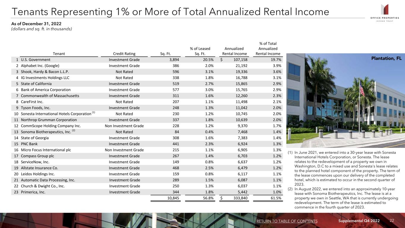Supplemental Q4 2022 22 Tenant Credit Rating Sq. Ft. % of Leased Sq. Ft. Annualized Rental Income % of Total Annualized Rental Income 1 U.S. Government Investment Grade 3,894 20.5% $ 107,158 19.7% 2 Alphabet Inc. (Google) Investment Grade 386 2.0% 21,192 3.9% 3 Shook, Hardy & Bacon L.L.P. Not Rated 596 3.1% 19,336 3.6% 4 IG Investments Holdings LLC Not Rated 338 1.8% 16,788 3.1% 5 State of California Investment Grade 519 2.7% 15,865 2.9% 6 Bank of America Corporation Investment Grade 577 3.0% 15,765 2.9% 7 Commonwealth of Massachusetts Investment Grade 311 1.6% 12,260 2.3% 8 CareFirst Inc. Not Rated 207 1.1% 11,498 2.1% 9 Tyson Foods, Inc. Investment Grade 248 1.3% 11,042 2.0% 10 Sonesta International Hotels Corporation (1) Not Rated 230 1.2% 10,745 2.0% 11 Northrop Grumman Corporation Investment Grade 337 1.8% 10,639 2.0% 12 CommScope Holding Company Inc. Non Investment Grade 228 1.2% 9,370 1.7% 13 Sonoma Biotherapeutics, Inc. (2) Not Rated 84 0.4% 7,468 1.4% 14 State of Georgia Investment Grade 308 1.6% 7,383 1.4% 15 PNC Bank Investment Grade 441 2.3% 6,924 1.3% 16 Micro Focus International plc Non Investment Grade 215 1.1% 6,905 1.3% 17 Compass Group plc Investment Grade 267 1.4% 6,703 1.2% 18 ServiceNow, Inc. Investment Grade 149 0.8% 6,637 1.2% 19 Allstate Insurance Co. Investment Grade 468 2.5% 6,479 1.2% 20 Leidos Holdings Inc. Investment Grade 159 0.8% 6,117 1.1% 21 Automatic Data Processing, Inc. Investment Grade 289 1.5% 6,087 1.1% 22 Church & Dwight Co., Inc. Investment Grade 250 1.3% 6,037 1.1% 23 Primerica, Inc. Investment Grade 344 1.8% 5,442 1.0% 10,845 56.8% $ 333,840 61.5% Tenants Representing 1% or More of Total Annualized Rental Income As of December 31, 2022 (dollars and sq. ft. in thousands) RETURN TO TABLE OF CONTENTS Houston, TX (1) In June 2021, we entered into a 30-year lease with Sonesta International Hotels Corporation, or Sonesta. The lease relates to the redevelopment of a property we own in Washington, D.C to a mixed use and Sonesta's lease relates to the planned hotel component of the property. The term of the lease commences upon our delivery of the completed hotel, which is estimated to occur in the second quarter of 2023. (2) In August 2022, we entered into an approximately 10-year lease with Sonoma Biotherapeutics, Inc. The lease is at a property we own in Seattle, WA that is currently undergoing redevelopment. The term of the lease is estimated to commence in the fourth quarter of 2023. Plantation, FL
