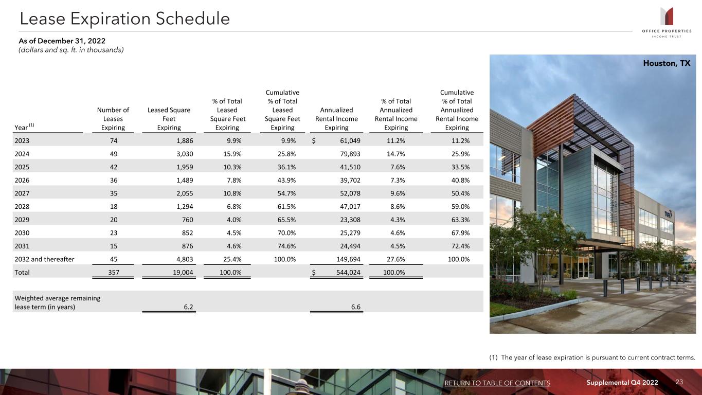 Supplemental Q4 2022 23 Year (1) Number of Leases Expiring Leased Square Feet Expiring % of Total Leased Square Feet Expiring Cumulative % of Total Leased Square Feet Expiring Annualized Rental Income Expiring % of Total Annualized Rental Income Expiring Cumulative % of Total Annualized Rental Income Expiring 2023 74 1,886 9.9% 9.9% $ 61,049 11.2% 11.2% 2024 49 3,030 15.9% 25.8% 79,893 14.7% 25.9% 2025 42 1,959 10.3% 36.1% 41,510 7.6% 33.5% 2026 36 1,489 7.8% 43.9% 39,702 7.3% 40.8% 2027 35 2,055 10.8% 54.7% 52,078 9.6% 50.4% 2028 18 1,294 6.8% 61.5% 47,017 8.6% 59.0% 2029 20 760 4.0% 65.5% 23,308 4.3% 63.3% 2030 23 852 4.5% 70.0% 25,279 4.6% 67.9% 2031 15 876 4.6% 74.6% 24,494 4.5% 72.4% 2032 and thereafter 45 4,803 25.4% 100.0% 149,694 27.6% 100.0% Total 357 19,004 100.0% $ 544,024 100.0% Weighted average remaining lease term (in years) 6.2 6.6 (1) The year of lease expiration is pursuant to current contract terms. Lease Expiration Schedule As of December 31, 2022 (dollars and sq. ft. in thousands) RETURN TO TABLE OF CONTENTS Houston, TX