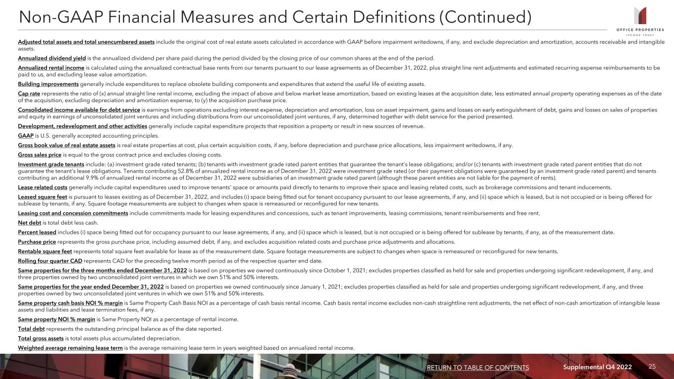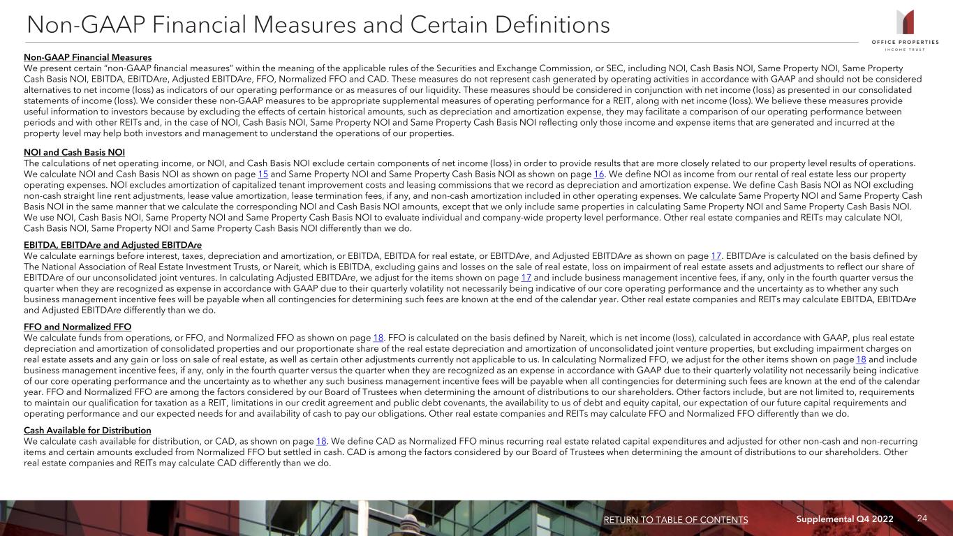 Supplemental Q4 2022 24 Non-GAAP Financial Measures We present certain “non-GAAP financial measures” within the meaning of the applicable rules of the Securities and Exchange Commission, or SEC, including NOI, Cash Basis NOI, Same Property NOI, Same Property Cash Basis NOI, EBITDA, EBITDAre, Adjusted EBITDAre, FFO, Normalized FFO and CAD. These measures do not represent cash generated by operating activities in accordance with GAAP and should not be considered alternatives to net income (loss) as indicators of our operating performance or as measures of our liquidity. These measures should be considered in conjunction with net income (loss) as presented in our consolidated statements of income (loss). We consider these non-GAAP measures to be appropriate supplemental measures of operating performance for a REIT, along with net income (loss). We believe these measures provide useful information to investors because by excluding the effects of certain historical amounts, such as depreciation and amortization expense, they may facilitate a comparison of our operating performance between periods and with other REITs and, in the case of NOI, Cash Basis NOI, Same Property NOI and Same Property Cash Basis NOI reflecting only those income and expense items that are generated and incurred at the property level may help both investors and management to understand the operations of our properties. NOI and Cash Basis NOI The calculations of net operating income, or NOI, and Cash Basis NOI exclude certain components of net income (loss) in order to provide results that are more closely related to our property level results of operations. We calculate NOI and Cash Basis NOI as shown on page 15 and Same Property NOI and Same Property Cash Basis NOI as shown on page 16. We define NOI as income from our rental of real estate less our property operating expenses. NOI excludes amortization of capitalized tenant improvement costs and leasing commissions that we record as depreciation and amortization expense. We define Cash Basis NOI as NOI excluding non-cash straight line rent adjustments, lease value amortization, lease termination fees, if any, and non-cash amortization included in other operating expenses. We calculate Same Property NOI and Same Property Cash Basis NOI in the same manner that we calculate the corresponding NOI and Cash Basis NOI amounts, except that we only include same properties in calculating Same Property NOI and Same Property Cash Basis NOI. We use NOI, Cash Basis NOI, Same Property NOI and Same Property Cash Basis NOI to evaluate individual and company-wide property level performance. Other real estate companies and REITs may calculate NOI, Cash Basis NOI, Same Property NOI and Same Property Cash Basis NOI differently than we do. EBITDA, EBITDAre and Adjusted EBITDAre We calculate earnings before interest, taxes, depreciation and amortization, or EBITDA, EBITDA for real estate, or EBITDAre, and Adjusted EBITDAre as shown on page 17. EBITDAre is calculated on the basis defined by The National Association of Real Estate Investment Trusts, or Nareit, which is EBITDA, excluding gains and losses on the sale of real estate, loss on impairment of real estate assets and adjustments to reflect our share of EBITDAre of our unconsolidated joint ventures. In calculating Adjusted EBITDAre, we adjust for the items shown on page 17 and include business management incentive fees, if any, only in the fourth quarter versus the quarter when they are recognized as expense in accordance with GAAP due to their quarterly volatility not necessarily being indicative of our core operating performance and the uncertainty as to whether any such business management incentive fees will be payable when all contingencies for determining such fees are known at the end of the calendar year. Other real estate companies and REITs may calculate EBITDA, EBITDAre and Adjusted EBITDAre differently than we do. FFO and Normalized FFO We calculate funds from operations, or FFO, and Normalized FFO as shown on page 18. FFO is calculated on the basis defined by Nareit, which is net income (loss), calculated in accordance with GAAP, plus real estate depreciation and amortization of consolidated properties and our proportionate share of the real estate depreciation and amortization of unconsolidated joint venture properties, but excluding impairment charges on real estate assets and any gain or loss on sale of real estate, as well as certain other adjustments currently not applicable to us. In calculating Normalized FFO, we adjust for the other items shown on page 18 and include business management incentive fees, if any, only in the fourth quarter versus the quarter when they are recognized as an expense in accordance with GAAP due to their quarterly volatility not necessarily being indicative of our core operating performance and the uncertainty as to whether any such business management incentive fees will be payable when all contingencies for determining such fees are known at the end of the calendar year. FFO and Normalized FFO are among the factors considered by our Board of Trustees when determining the amount of distributions to our shareholders. Other factors include, but are not limited to, requirements to maintain our qualification for taxation as a REIT, limitations in our credit agreement and public debt covenants, the availability to us of debt and equity capital, our expectation of our future capital requirements and operating performance and our expected needs for and availability of cash to pay our obligations. Other real estate companies and REITs may calculate FFO and Normalized FFO differently than we do. Cash Available for Distribution We calculate cash available for distribution, or CAD, as shown on page 18. We define CAD as Normalized FFO minus recurring real estate related capital expenditures and adjusted for other non-cash and non-recurring items and certain amounts excluded from Normalized FFO but