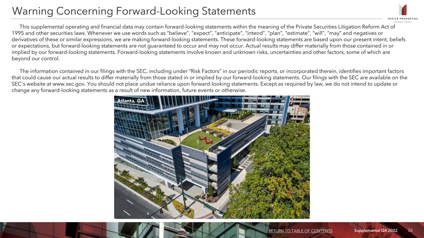 Supplemental Q4 2022 25 Adjusted total assets and total unencumbered assets include the original cost of real estate assets calculated in accordance with GAAP before impairment writedowns, if any, and exclude depreciation and amortization, accounts receivable and intangible assets. Annualized dividend yield is the annualized dividend per share paid during the period divided by the closing price of our common shares at the end of the period. Annualized rental income is calculated using the annualized contractual base rents from our tenants pursuant to our lease agreements as of December 31, 2022, plus straight line rent adjustments and estimated recurring expense reimbursements to be paid to us, and excluding lease value amortization. Building improvements generally include expenditures to replace obsolete building components and expenditures that extend the useful life of existing assets. Cap rate represents the ratio of (x) annual straight line rental income, excluding the impact of above and below market lease amortization, based on existing leases at the acquisition date, less estimated annual property operating expenses as of the date of the acquisition, excluding depreciation and amortization expense, to (y) the acquisition purchase price. Consolidated income available for debt service is earnings from operations excluding interest expense, depreciation and amortization, loss on asset impairment, gains and losses on early extinguishment of debt, gains and losses on sales of properties and equity in earnings of unconsolidated joint ventures and including distributions from our unconsolidated joint ventures, if any, determined together with debt service for the period presented. Development, redevelopment and other activities generally include capital expenditure projects that reposition a property or result in new sources of revenue. GAAP is U.S. generally accepted accounting principles. Gross book value of real estate assets is real estate properties at cost, plus certain acquisition costs, if any, before depreciation and purchase price allocations, less impairment writedowns, if any. Gross sales price is equal to the gross contract price and excludes closing costs. Investment grade tenants include: (a) investment grade rated tenants; (b) tenants with investment grade rated parent entities that guarantee the tenant's lease obligations; and/or (c) tenants with investment grade rated parent entities that do not guarantee the tenant's lease obligations. Tenants contributing 52.8% of annualized rental income as of December 31, 2022 were investment grade rated (or their payment obligations were guaranteed by an investment grade rated parent) and tenants contributing an additional 9.9% of annualized rental income as of December 31, 2022 were subsidiaries of an investment grade rated parent (although these parent entities are not liable for the payment of rents). Lease related costs generally include capital expenditures used to improve tenants' space or amounts paid directly to tenants to improve their space and leasing related costs, such as brokerage commissions and tenant inducements. Leased square feet is pursuant to leases existing as of December 31, 2022, and includes (i) space being fitted out for tenant occupancy pursuant to our lease agreements, if any, and (ii) space which is leased, but is not occupied or is being offered for sublease by tenants, if any. Square footage measurements are subject to changes when space is remeasured or reconfigured for new tenants. Leasing cost and concession commitments include commitments made for leasing expenditures and concessions, such as tenant improvements, leasing commissions, tenant reimbursements and free rent. Net debt is total debt less cash. Percent leased includes (i) space being fitted out for occupancy pursuant to our lease agreements, if any, and (ii) space which is leased, but is not occupied or is being offered for sublease by tenants, if any, as of the measurement date. Purchase price represents the gross purchase price, including assumed debt, if any, and excludes acquisition related costs and purchase price adjustments and allocations. Rentable square feet represents total square feet available for lease as of the measurement date. Square footage measurements are subject to changes when space is remeasured or reconfigured for new tenants. Rolling four quarter CAD represents CAD for the preceding twelve month period as of the respective quarter end date. Same properties for the three months ended December 31, 2022 is based on properties we owned continuously since October 1, 2021; excludes properties classified as held for sale and properties undergoing significant redevelopment, if any, and three properties owned by two unconsolidated joint ventures in which we own 51% and 50% interests. Same properties for the year ended December 31, 2022 is based on properties we owned continuously since January 1, 2021; excludes properties classified as held for sale and properties undergoing significant redevelopment, if any, and three properties owned by two unconsolidated joint ventures in which we own 51% and 50% interests. Same property cash basis NOI % margin is Same Property Cash Basis NOI as a percentage of cash basis rental income. Cash basis rental income excludes non-cash straightline rent adjustments, the net effect of non-cash amortization of intangible lease assets and liabilities and lease termination fees, if any. Same property NOI % margin is Same Property NOI as a percentage of rental income. Total debt represents the outstanding principal balance as of the date reported. Total gross assets is total assets plus accumulated depreciation. Weighted average remaining lease term is the average remaining lease term in years weighted based on annualized rental income. Non-GAAP Financial Measures and Certain Definitions (Continued) RETURN TO TABLE OF CONTENTS
