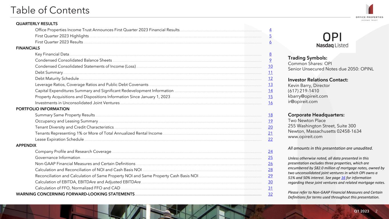 Q1 2023 2 Table of Contents QUARTERLY RESULTS Office Properties Income Trust Announces First Quarter 2023 Financial Results ................................................................................. 4 First Quarter 2023 Highlights .......................................................................................................................................................................... 5 First Quarter 2023 Results ................................................................................................................................................................................ 6 FINANCIALS Key Financial Data.............................................................................................................................................................................................. 8 Condensed Consolidated Balance Sheets ................................................................................................................................................... 9 Condensed Consolidated Statements of Income (Loss) ............................................................................................................................ 10 Debt Summary .................................................................................................................................................................................................... 11 Debt Maturity Schedule .................................................................................................................................................................................... 12 Leverage Ratios, Coverage Ratios and Public Debt Covenants ............................................................................................................... 13 Capital Expenditures Summary and Significant Redevelopment Information ...................................................................................... 14 Property Acquisitions and Dispositions Information Since January 1, 2023 .......................................................................................... 15 Investments in Unconsolidated Joint Ventures ............................................................................................................................................ 16 PORTFOLIO INFORMATION Summary Same Property Results .................................................................................................................................................................... 18 Occupancy and Leasing Summary ................................................................................................................................................................. 19 Tenant Diversity and Credit Characteristics.................................................................................................................................................. 20 Tenants Representing 1% or More of Total Annualized Rental Income .................................................................................................. 21 Lease Expiration Schedule ............................................................................................................................................................................... 22 APPENDIX Company Profile and Research Coverage .................................................................................................................................................... 24 Governance Information ................................................................................................................................................................................... 25 Non-GAAP Financial Measures and Certain Definitions ............................................................................................................................ 26 Calculation and Reconciliation of NOI and Cash Basis NOI ...................................................................................................................... 28 Reconciliation and Calculation of Same Property NOI and Same Property Cash Basis NOI .............................................................. 29 Calculation of EBITDA, EBITDAre and Adjusted EBITDAre ....................................................................................................................... 30 Calculation of FFO, Normalized FFO and CAD ........................................................................................................................................... 31 WARNING CONCERNING FORWARD-LOOKING STATEMENTS ............................................................................................................................. 32 Trading Symbols: Common Shares: OPI Senior Unsecured Notes due 2050: OPINL Investor Relations Contact: Kevin Barry, Director (617) 219-1410 kbarry@opireit.com ir@opireit.com Corporate Headquarters: Two Newton Place 255 Washington Street, Suite 300 Newton, Massachusetts 02458-1634 www.opireit.com All amounts in this presentation are unaudited. Unless otherwise noted, all data presented in this presentation excludes three properties, which are encumbered by $82.0 million of mortgage notes, owned by two unconsolidated joint ventures in which OPI owns a 51% and 50% interest. See page 16 for information regarding these joint ventures and related mortgage notes. Please refer to Non-GAAP Financial Measures and Certain Definitions for terms used throughout this presentation.