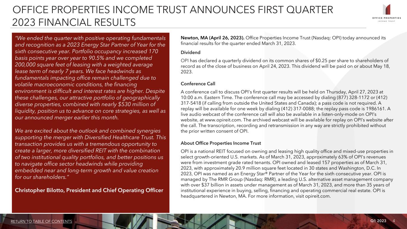 Q1 2023 32RETURN TO TABLE OF CONTENTS Warning Concerning Forward-Looking Statements This presentation contains forward-looking statements within the meaning of the Private Securities Litigation Reform Act of 1995 and other securities laws that are subject to risks and uncertainties. These statements may include words such as “believe”, “expect”, “anticipate”, “intend”, “plan”, “estimate”, “will”, “may” and negatives or derivatives of these or similar expressions. Forward-looking statements reflect management's current expectations, are based on judgments and assumptions, are inherently uncertain and are subject to risks, uncertainties and other factors, which could cause OPI's actual results, performance or achievements to differ materially from expected future results, performance or achievements expressed or implied in those forward-looking statements. Examples of these forward-looking statements and the related risks, uncertainties and other factors include, but are not limited to, the following: the likelihood that OPI will complete its pending Merger, and related transactions with DHC, including OPI's and DHC's ability to obtain shareholder approval, OPI's ability to obtain an amendment or replacement of its credit agreement and obtaining other financing, consents or approvals required in connection with the Merger, expected synergies from the Merger and that OPI's shareholders will benefit from the Merger; the impact of increasing or sustained high interest rates, inflation, labor market challenges, dislocation and volatility in the public equity and debt markets, conditions in the commercial real estate industry generally and in the sectors we operate, geopolitical instability and economic downturns or recessions on OPI and its tenants; the extent to which changes in office space utilization and needs, including due to remote work arrangements, may impact demand for office space at OPI's properties; the financial strength of OPI's tenants; risks and uncertainties regarding the costs and timing of development, redevelopment and repositioning activities, including as a result of inflation, cost overruns, supply chain challenges, labor shortages, construction delays or inability to obtain necessary permits; whether OPI's tenants will renew or extend their leases and not exercise early termination options pursuant to their leases or that OPI will obtain replacement tenants on terms as favorable to OPI as its prior leases; OPI's ability to successfully recycle and deploy capital; the likelihood that OPI's tenants will pay rent or be negatively affected by cyclical economic conditions or government budget constraints; OPI's ability to pay distributions to its shareholders and to maintain or increase the amount of such distributions; OPI's ability to increase or maintain occupancy at its properties on terms desirable to it; OPI's ability to increase rents when its leases expire or renew; OPI's ability to manage its capital expenditures and other operating costs effectively and to maintain and enhance its properties and their appeal to tenants; OPI's ability to acquire properties that realize its targeted returns; OPI's ability to sell properties at prices it targets; OPI's ability to cost effectively raise and balance its use of debt and equity capital; OPI's ability to make required payments on debt; OPI's ability to maintain sufficient liquidity, including the availability of borrowings under its revolving credit facility and otherwise manage leverage; OPI's credit ratings; the ability of OPI's manager, RMR, to successfully manage OPI; OPI's qualification for taxation as a REIT; changes in federal or state tax laws; competition within the commercial real estate industry, particularly in those markets in which OPI's properties are located; compliance with, and changes to, federal, state and local laws and regulations, accounting rules, tax laws and similar matters; the impact of any U.S. government shutdown or failure to increase the government debt ceiling on OPI's ability to collect rents and pay its operating expenses, debt obligations and distributions to shareholders on a timely basis; actual and potential conflicts of interest with OPI's related parties, including its Managing Trustees, RMR, Sonesta and others affiliated with them; limitations imposed by and OPI's ability to satisfy complex rules to maintain OPI's qualification for taxation as a REIT for U.S. federal income tax purposes; acts of terrorism, outbreaks or continuation of pandemics or other public health safety events or conditions, war or other hostilities, material or prolonged disruption to supply chains, climate change, or other manmade or natural disasters beyond OPI's control; and other matters. These risks, uncertainties and other factors are not exhaustive and should be read in conjunction with other cautionary statements that are included in OPI's periodic filings. The information contained in OPI's filings with the SEC, including under the caption "Risk Factors" in its periodic reports, or incorporated therein, identifies important factors that could cause differences from the forward-looking statements in this presentation. OPI's filings with the SEC are available on the SEC's website at www.sec.gov. You should not place undue reliance on forward-looking statements. Except as required by law, OPI undertakes no obligation to update any forward-looking statement, whether as a result of new information, future events or otherwise.