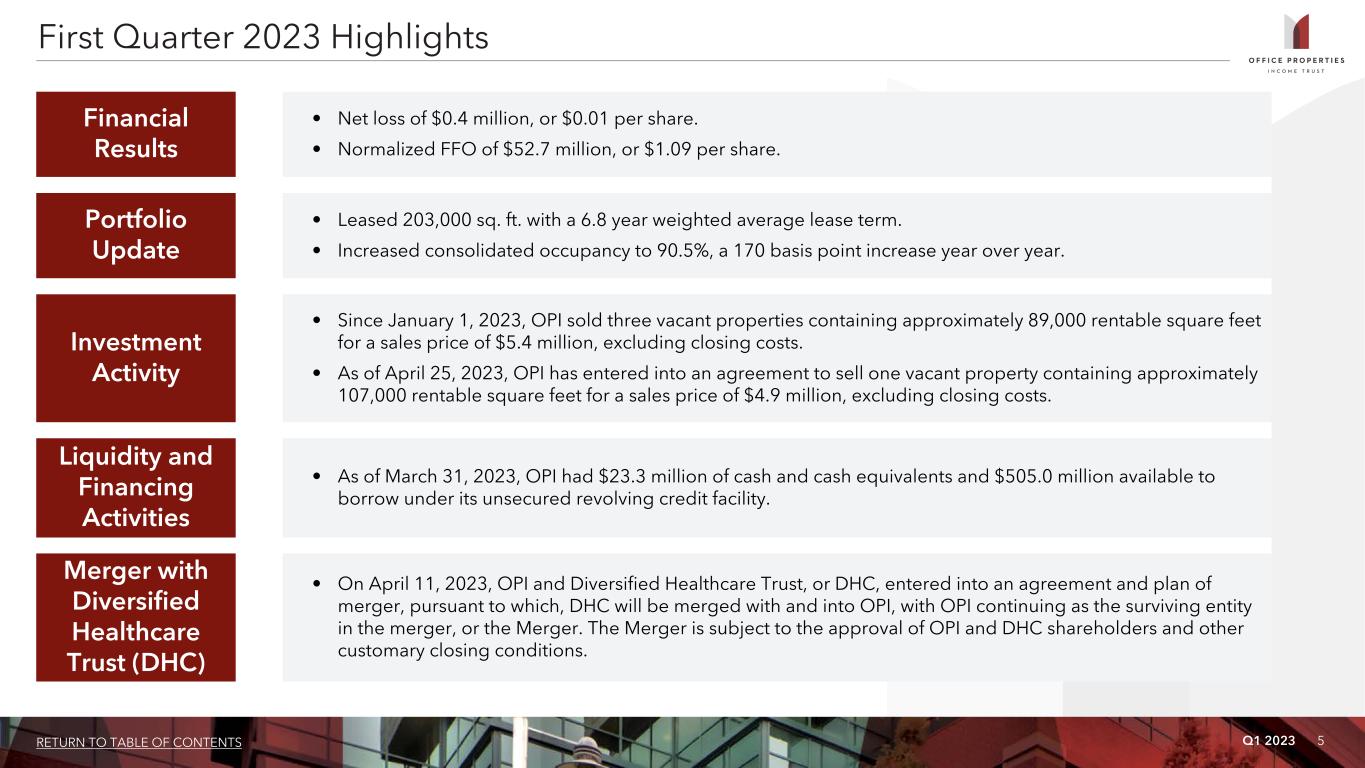 Q1 2023 32RETURN TO TABLE OF CONTENTS Warning Concerning Forward-Looking Statements This presentation contains forward-looking statements within the meaning of the Private Securities Litigation Reform Act of 1995 and other securities laws that are subject to risks and uncertainties. These statements may include words such as “believe”, “expect”, “anticipate”, “intend”, “plan”, “estimate”, “will”, “may” and negatives or derivatives of these or similar expressions. Forward-looking statements reflect management's current expectations, are based on judgments and assumptions, are inherently uncertain and are subject to risks, uncertainties and other factors, which could cause OPI's actual results, performance or achievements to differ materially from expected future results, performance or achievements expressed or implied in those forward-looking statements. Examples of these forward-looking statements and the related risks, uncertainties and other factors include, but are not limited to, the following: the likelihood that OPI will complete its pending Merger, and related transactions with DHC, including OPI's and DHC's ability to obtain shareholder approval, OPI's ability to obtain an amendment or replacement of its credit agreement and obtaining other financing, consents or approvals required in connection with the Merger, expected synergies from the Merger and that OPI's shareholders will benefit from the Merger; the impact of increasing or sustained high interest rates, inflation, labor market challenges, dislocation and volatility in the public equity and debt markets, conditions in the commercial real estate industry generally and in the sectors we operate, geopolitical instability and economic downturns or recessions on OPI and its tenants; the extent to which changes in office space utilization and needs, including due to remote work arrangements, may impact demand for office space at OPI's properties; the financial strength of OPI's tenants; risks and uncertainties regarding the costs and timing of development, redevelopment and repositioning activities, including as a result of inflation, cost overruns, supply chain challenges, labor shortages, construction delays or inability to obtain necessary permits; whether OPI's tenants will renew or extend their leases and not exercise early termination options pursuant to their leases or that OPI will obtain replacement tenants on terms as favorable to OPI as its prior leases; OPI's ability to successfully recycle and deploy capital; the likelihood that OPI's tenants will pay rent or be negatively affected by cyclical economic conditions or government budget constraints; OPI's ability to pay distributions to its shareholders and to maintain or increase the amount of such distributions; OPI's ability to increase or maintain occupancy at its properties on terms desirable to it; OPI's ability to increase rents when its leases expire or renew; OPI's ability to manage its capital expenditures and other operating costs effectively and to maintain and enhance its properties and their appeal to tenants; OPI's ability to acquire properties that realize its targeted returns; OPI's ability to sell properties at prices it targets; OPI's ability to cost effectively raise and balance its use of debt and equity capital; OPI's ability to make required payments on debt; OPI's ability to maintain sufficient liquidity, including the availability of borrowings under its revolving credit facility and otherwise manage leverage; OPI's credit ratings; the ability of OPI's manager, RMR, to successfully manage OPI; OPI's qualification for taxation as a REIT; changes in federal or state tax laws; competition within the commercial real estate industry, particularly in those markets in which OPI's properties are located; compliance with, and changes to, federal, state and local laws and regulations, accounting rules, tax laws and similar matters; the impact of any U.S. government shutdown or failure to increase the government debt ceiling on OPI's ability to collect rents and pay its operating expenses, debt obligations and distributions to shareholders on a timely basis; actual and potential conflicts of interest with OPI's related parties, including its Managing Trustees, RMR, Sonesta and others affiliated with them; limitations imposed by and OPI's ability to satisfy complex rules to maintain OPI's qualification for taxation as a REIT for U.S. federal income tax purposes; acts of terrorism, outbreaks or continuation of pandemics or other public health safety events or conditions, war or other hostilities, material or prolonged disruption to supply chains, climate change, or other manmade or natural disasters beyond OPI's control; and other matters. These risks, uncertainties and other factors are not exhaustive and should be read in conjunction with other cautionary statements that are included in OPI's periodic filings. The information contained in OPI's filings with the SEC, including under the caption "Risk Factors" in its periodic reports, or incorporated therein, identifies important factors that could cause differences from the forward-looking statements in this presentation. OPI's filings with the SEC are available on the SEC's website at www.sec.gov. You should not place undue reliance on forward-looking statements. Except as required by law, OPI undertakes no obligation to update any forward-looking statement, whether as a result of new information, future events or otherwise.