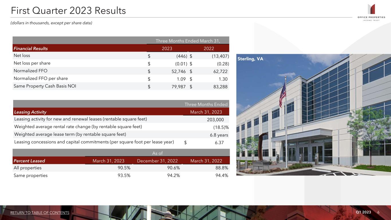Q1 2023 5RETURN TO TABLE OF CONTENTS First Quarter 2023 Highlights Financial Results • Net loss of $0.4 million, or $0.01 per share. • Normalized FFO of $52.7 million, or $1.09 per share. Portfolio Update • Leased 203,000 sq. ft. with a 6.8 year weighted average lease term. • Increased consolidated occupancy to 90.5%, a 170 basis point increase year over year. Investment Activity • Since January 1, 2023, OPI sold three vacant properties containing approximately 89,000 rentable square feet for a sales price of $5.4 million, excluding closing costs. • As of April 25, 2023, OPI has entered into an agreement to sell one vacant property containing approximately 107,000 rentable square feet for a sales price of $4.9 million, excluding closing costs. Liquidity and Financing Activities • As of March 31, 2023, OPI had $23.3 million of cash and cash equivalents and $505.0 million available to borrow under its unsecured revolving credit facility. Merger with Diversified Healthcare Trust (DHC) • On April 11, 2023, OPI and Diversified Healthcare Trust, or DHC, entered into an agreement and plan of merger, pursuant to which, DHC will be merged with and into OPI, with OPI continuing as the surviving entity in the merger, or the Merger. The Merger is subject to the approval of OPI and DHC shareholders and other customary closing conditions.