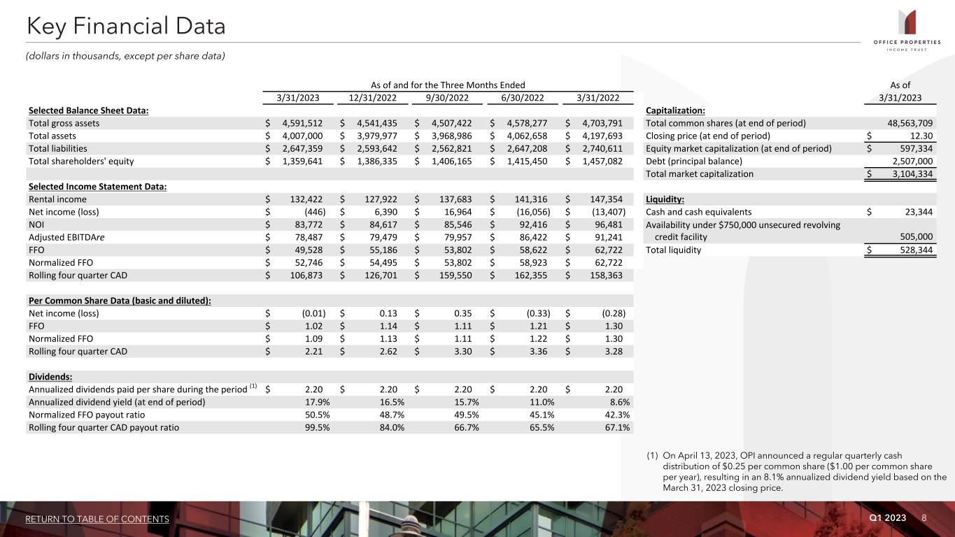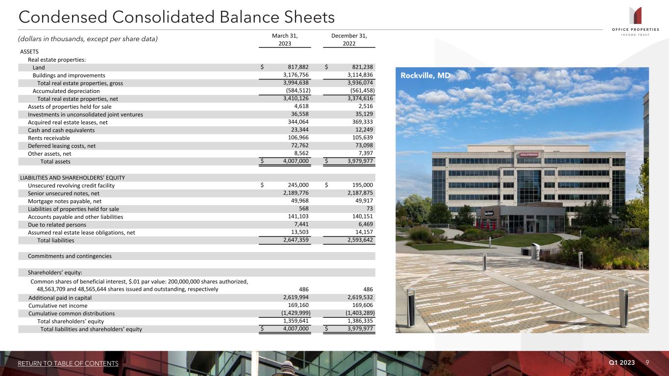 Q1 2023 8RETURN TO TABLE OF CONTENTS As of and for the Three Months Ended As of 3/31/2023 12/31/2022 9/30/2022 6/30/2022 3/31/2022 3/31/2023 Selected Balance Sheet Data: Capitalization: Total gross assets $ 4,591,512 $ 4,541,435 $ 4,507,422 $ 4,578,277 $ 4,703,791 Total common shares (at end of period) 48,563,709 Total assets $ 4,007,000 $ 3,979,977 $ 3,968,986 $ 4,062,658 $ 4,197,693 Closing price (at end of period) $ 12.30 Total liabilities $ 2,647,359 $ 2,593,642 $ 2,562,821 $ 2,647,208 $ 2,740,611 Equity market capitalization (at end of period) $ 597,334 Total shareholders' equity $ 1,359,641 $ 1,386,335 $ 1,406,165 $ 1,415,450 $ 1,457,082 Debt (principal balance) 2,507,000 Total market capitalization $ 3,104,334 Selected Income Statement Data: Rental income $ 132,422 $ 127,922 $ 137,683 $ 141,316 $ 147,354 Liquidity: Net income (loss) $ (446) $ 6,390 $ 16,964 $ (16,056) $ (13,407) Cash and cash equivalents $ 23,344 NOI $ 83,772 $ 84,617 $ 85,546 $ 92,416 $ 96,481 Availability under $750,000 unsecured revolving credit facility 505,000 Adjusted EBITDAre $ 78,487 $ 79,479 $ 79,957 $ 86,422 $ 91,241 FFO $ 49,528 $ 55,186 $ 53,802 $ 58,622 $ 62,722 Total liquidity $ 528,344 Normalized FFO $ 52,746 $ 54,495 $ 53,802 $ 58,923 $ 62,722 Rolling four quarter CAD $ 106,873 $ 126,701 $ 159,550 $ 162,355 $ 158,363 Per Common Share Data (basic and diluted): Net income (loss) $ (0.01) $ 0.13 $ 0.35 $ (0.33) $ (0.28) FFO $ 1.02 $ 1.14 $ 1.11 $ 1.21 $ 1.30 Normalized FFO $ 1.09 $ 1.13 $ 1.11 $ 1.22 $ 1.30 Rolling four quarter CAD $ 2.21 $ 2.62 $ 3.30 $ 3.36 $ 3.28 Dividends: Annualized dividends paid per share during the period (1) $ 2.20 $ 2.20 $ 2.20 $ 2.20 $ 2.20 Annualized dividend yield (at end of period) 17.9% 16.5% 15.7% 11.0% 8.6% Normalized FFO payout ratio 50.5% 48.7% 49.5% 45.1% 42.3% Rolling four quarter CAD payout ratio 99.5% 84.0% 66.7% 65.5% 67.1% (dollars in thousands, except per share data) Key Financial Data (1) On April 13, 2023, OPI announced a regular quarterly cash distribution of $0.25 per common share ($1.00 per common share per year), resulting in an 8.1% annualized dividend yield based on the March 31, 2023 closing price.