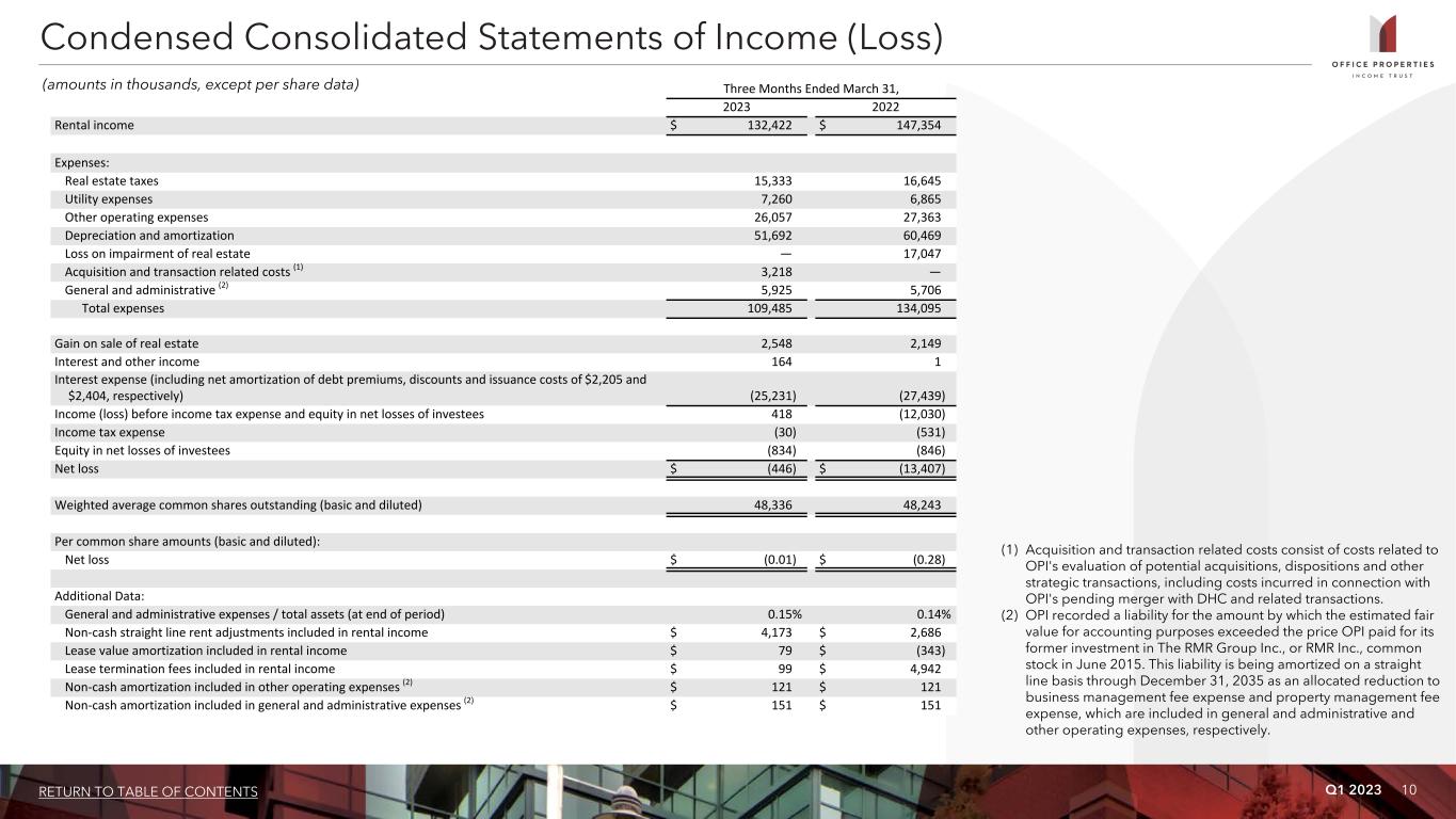 Q1 2023 10RETURN TO TABLE OF CONTENTS Three Months Ended March 31, 2023 2022 Rental income $ 132,422 $ 147,354 Expenses: Real estate taxes 15,333 16,645 Utility expenses 7,260 6,865 Other operating expenses 26,057 27,363 Depreciation and amortization 51,692 60,469 Loss on impairment of real estate — 17,047 Acquisition and transaction related costs (1) 3,218 — General and administrative (2) 5,925 5,706 Total expenses 109,485 134,095 Gain on sale of real estate 2,548 2,149 Interest and other income 164 1 Interest expense (including net amortization of debt premiums, discounts and issuance costs of $2,205 and $2,404, respectively) (25,231) (27,439) Income (loss) before income tax expense and equity in net losses of investees 418 (12,030) Income tax expense (30) (531) Equity in net losses of investees (834) (846) Net loss $ (446) $ (13,407) Weighted average common shares outstanding (basic and diluted) 48,336 48,243 Per common share amounts (basic and diluted): Net loss $ (0.01) $ (0.28) Additional Data: General and administrative expenses / total assets (at end of period) 0.15% 0.14% Non-cash straight line rent adjustments included in rental income $ 4,173 $ 2,686 Lease value amortization included in rental income $ 79 $ (343) Lease termination fees included in rental income $ 99 $ 4,942 Non-cash amortization included in other operating expenses (2) $ 121 $ 121 Non-cash amortization included in general and administrative expenses (2) $ 151 $ 151 (amounts in thousands, except per share data) (1) Acquisition and transaction related costs consist of costs related to OPI's evaluation of potential acquisitions, dispositions and other strategic transactions, including costs incurred in connection with OPI's pending merger with DHC and related transactions. (2) OPI recorded a liability for the amount by which the estimated fair value for accounting purposes exceeded the price OPI paid for its former investment in The RMR Group Inc., or RMR Inc., common stock in June 2015. This liability is being amortized on a straight line basis through December 31, 2035 as an allocated reduction to business management fee expense and property management fee expense, which are included in general and administrative and other operating expenses, respectively. Condensed Consolidated Statements of Income (Loss)