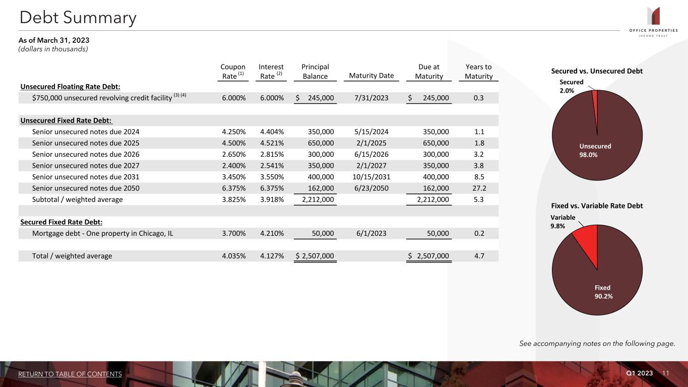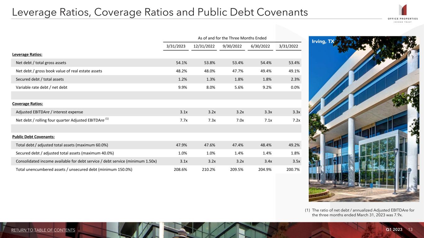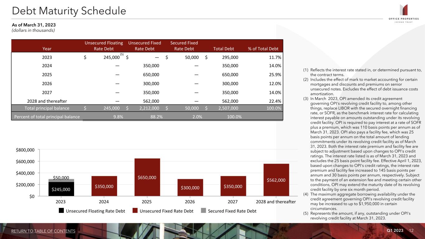 Q1 2023 12RETURN TO TABLE OF CONTENTS $245,000 $350,000 $650,000 $300,000 $350,000 $562,000$50,000 Unsecured Floating Rate Debt Unsecured Fixed Rate Debt Secured Fixed Rate Debt 2023 2024 2025 2026 2027 2028 and thereafter $0 $200,000 $400,000 $600,000 $800,000 Year Unsecured Floating Rate Debt Unsecured Fixed Rate Debt Secured Fixed Rate Debt Total Debt % of Total Debt 2023 $ 245,000 $ — $ 50,000 $ 295,000 11.7% 2024 — 350,000 — 350,000 14.0% 2025 — 650,000 — 650,000 25.9% 2026 — 300,000 — 300,000 12.0% 2027 — 350,000 — 350,000 14.0% 2028 and thereafter — 562,000 — 562,000 22.4% Total principal balance $ 245,000 $ 2,212,000 $ 50,000 $ 2,507,000 100.0% Percent of total principal balance 9.8% 88.2% 2.0% 100.0% Debt Maturity Schedule As of March 31, 2023 (dollars in thousands) (1) Reflects the interest rate stated in, or determined pursuant to, the contract terms. (2) Includes the effect of mark to market accounting for certain mortgages and discounts and premiums on senior unsecured notes. Excludes the effect of debt issuance costs amortization. (3) In March 2023, OPI amended its credit agreement governing OPI's revolving credit facility to, among other things, replace LIBOR with the secured overnight financing rate, or SOFR, as the benchmark interest rate for calculating interest payable on amounts outstanding under its revolving credit facility. OPI is required to pay interest at a rate of SOFR plus a premium, which was 110 basis points per annum as of March 31, 2023. OPI also pays a facility fee, which was 25 basis points per annum on the total amount of lending commitments under its revolving credit facility as of March 31, 2023. Both the interest rate premium and facility fee are subject to adjustment based upon changes to OPI's credit ratings. The interest rate listed is as of March 31, 2023 and excludes the 25 basis point facility fee. Effective April 1, 2023, based upon changes to OPI's credit ratings, the interest rate premium and facility fee increased to 145 basis points per annum and 30 basis points per annum, respectively. Subject to the payment of an extension fee and meeting certain other conditions, OPI may extend the maturity date of its revolving credit facility by one six month period. (4) The maximum aggregate borrowing availability under the credit agreement governing OPI's revolving credit facility may be increased to up to $1,950,000 in certain circumstances. (5) Represents the amount, if any, outstanding under OPI's revolving credit facility at March 31, 2023. (5)