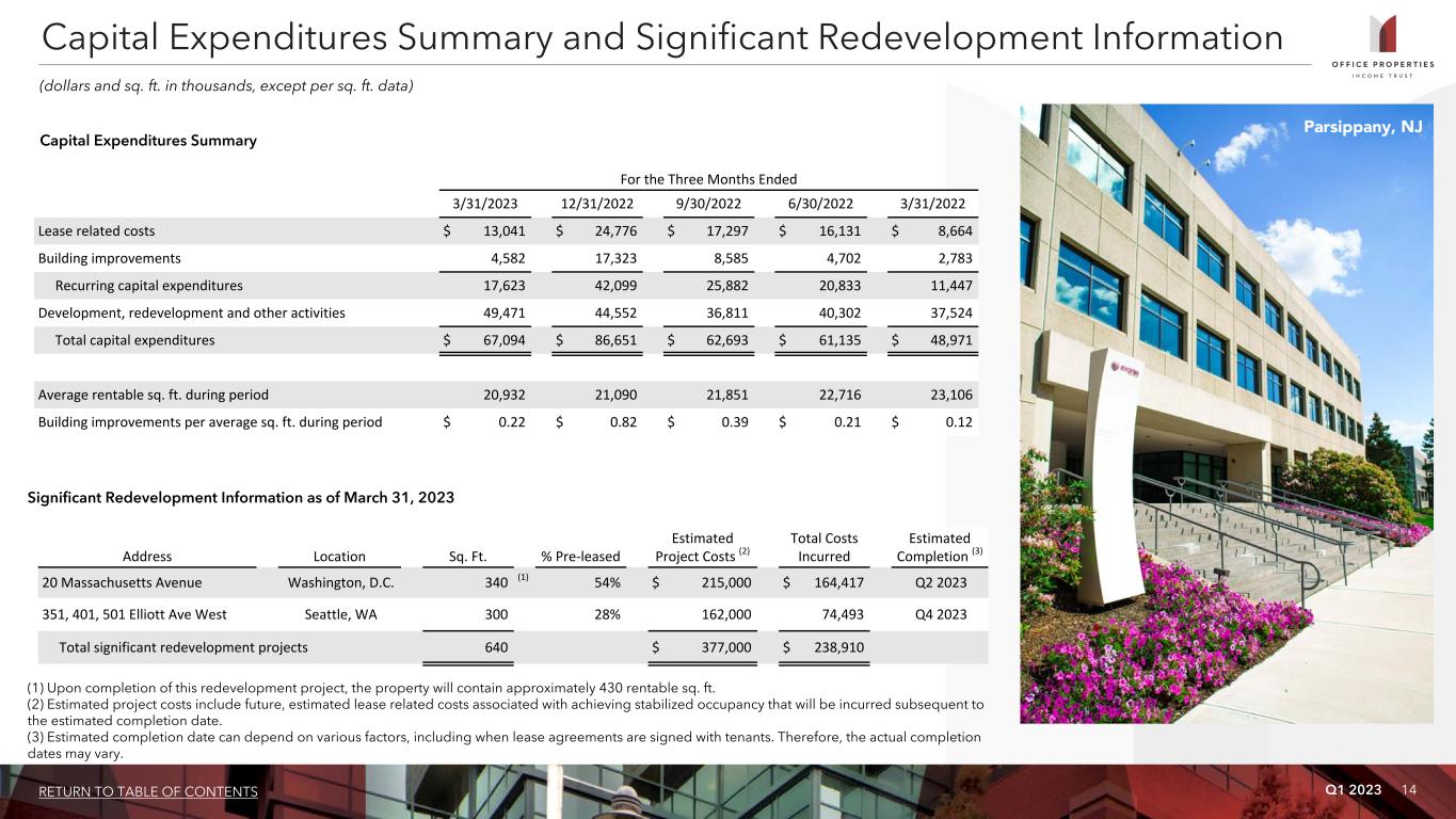 Q1 2023 14RETURN TO TABLE OF CONTENTS For the Three Months Ended 3/31/2023 12/31/2022 9/30/2022 6/30/2022 3/31/2022 Lease related costs $ 13,041 $ 24,776 $ 17,297 $ 16,131 $ 8,664 Building improvements 4,582 17,323 8,585 4,702 2,783 Recurring capital expenditures 17,623 42,099 25,882 20,833 11,447 Development, redevelopment and other activities 49,471 44,552 36,811 40,302 37,524 Total capital expenditures $ 67,094 $ 86,651 $ 62,693 $ 61,135 $ 48,971 Average rentable sq. ft. during period 20,932 21,090 21,851 22,716 23,106 Building improvements per average sq. ft. during period $ 0.22 $ 0.82 $ 0.39 $ 0.21 $ 0.12 Capital Expenditures Summary and Significant Redevelopment Information (dollars and sq. ft. in thousands, except per sq. ft. data) Address Location Sq. Ft. % Pre-leased Estimated Project Costs (2) Total Costs Incurred Estimated Completion (3) 20 Massachusetts Avenue Washington, D.C. 340 (1) 54% $ 215,000 $ 164,417 Q2 2023 351, 401, 501 Elliott Ave West Seattle, WA 300 28% 162,000 74,493 Q4 2023 Total significant redevelopment projects 640 $ 377,000 $ 238,910 Significant Redevelopment Information as of March 31, 2023 (1) Upon completion of this redevelopment project, the property will contain approximately 430 rentable sq. ft. (2) Estimated project costs include future, estimated lease related costs associated with achieving stabilized occupancy that will be incurred subsequent to the estimated completion date. (3) Estimated completion date can depend on various factors, including when lease agreements are signed with tenants. Therefore, the actual completion dates may vary. Capital Expenditures Summary Parsippany, NJ