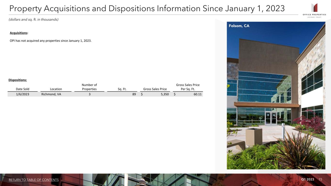 Q1 2023 15RETURN TO TABLE OF CONTENTS Acquisitions: OPI has not acquired any properties since January 1, 2023. Dispositions: Date Sold Location Number of Properties Sq. Ft. Gross Sales Price Gross Sales Price Per Sq. Ft. 1/6/2023 Richmond, VA 3 89 $ 5,350 $ 60.11 Property Acquisitions and Dispositions Information Since January 1, 2023 (dollars and sq. ft. in thousands) Folsom, CA