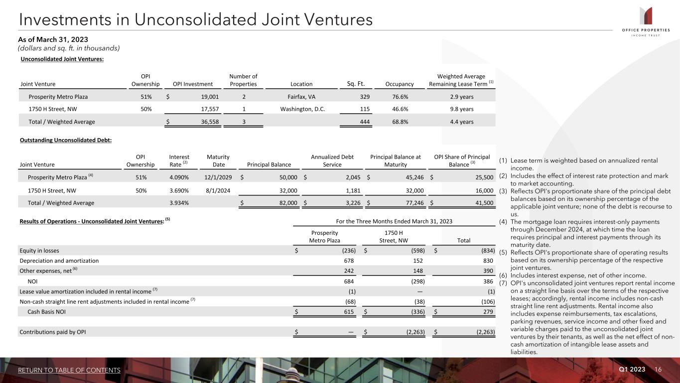 Q1 2023 16RETURN TO TABLE OF CONTENTS Unconsolidated Joint Ventures: Joint Venture OPI Ownership OPI Investment Number of Properties Location Sq. Ft. Occupancy Weighted Average Remaining Lease Term (1) Prosperity Metro Plaza 51% $ 19,001 2 Fairfax, VA 329 76.6% 2.9 years 1750 H Street, NW 50% 17,557 1 Washington, D.C. 115 46.6% 9.8 years Total / Weighted Average $ 36,558 3 444 68.8% 4.4 years (1) Lease term is weighted based on annualized rental income. (2) Includes the effect of interest rate protection and mark to market accounting. (3) Reflects OPI's proportionate share of the principal debt balances based on its ownership percentage of the applicable joint venture; none of the debt is recourse to us. (4) The mortgage loan requires interest-only payments through December 2024, at which time the loan requires principal and interest payments through its maturity date. (5) Reflects OPI's proportionate share of operating results based on its ownership percentage of the respective joint ventures. (6) Includes interest expense, net of other income. (7) OPI's unconsolidated joint ventures report rental income on a straight line basis over the terms of the respective leases; accordingly, rental income includes non-cash straight line rent adjustments. Rental income also includes expense reimbursements, tax escalations, parking revenues, service income and other fixed and variable charges paid to the unconsolidated joint ventures by their tenants, as well as the net effect of non- cash amortization of intangible lease assets and liabilities. Investments in Unconsolidated Joint Ventures As of March 31, 2023 (dollars and sq. ft. in thousands) Results of Operations - Unconsolidated Joint Ventures: (5) For the Three Months Ended March 31, 2023 Prosperity Metro Plaza 1750 H Street, NW Total Equity in losses $ (236) $ (598) $ (834) Depreciation and amortization 678 152 830 Other expenses, net (6) 242 148 390 NOI 684 (298) 386 Lease value amortization included in rental income (7) (1) — (1) Non-cash straight line rent adjustments included in rental income (7) (68) (38) (106) Cash Basis NOI $ 615 $ (336) $ 279 Contributions paid by OPI $ — $ (2,263) $ (2,263) Outstanding Unconsolidated Debt: Joint Venture OPI Ownership Interest Rate (2) Maturity Date Principal Balance Annualized Debt Service Principal Balance at Maturity OPI Share of Principal Balance (3) Prosperity Metro Plaza (4) 51% 4.090% 12/1/2029 $ 50,000 $ 2,045 $ 45,246 $ 25,500 1750 H Street, NW 50% 3.690% 8/1/2024 32,000 1,181 32,000 16,000 Total / Weighted Average 3.934% $ 82,000 $ 3,226 $ 77,246 $ 41,500