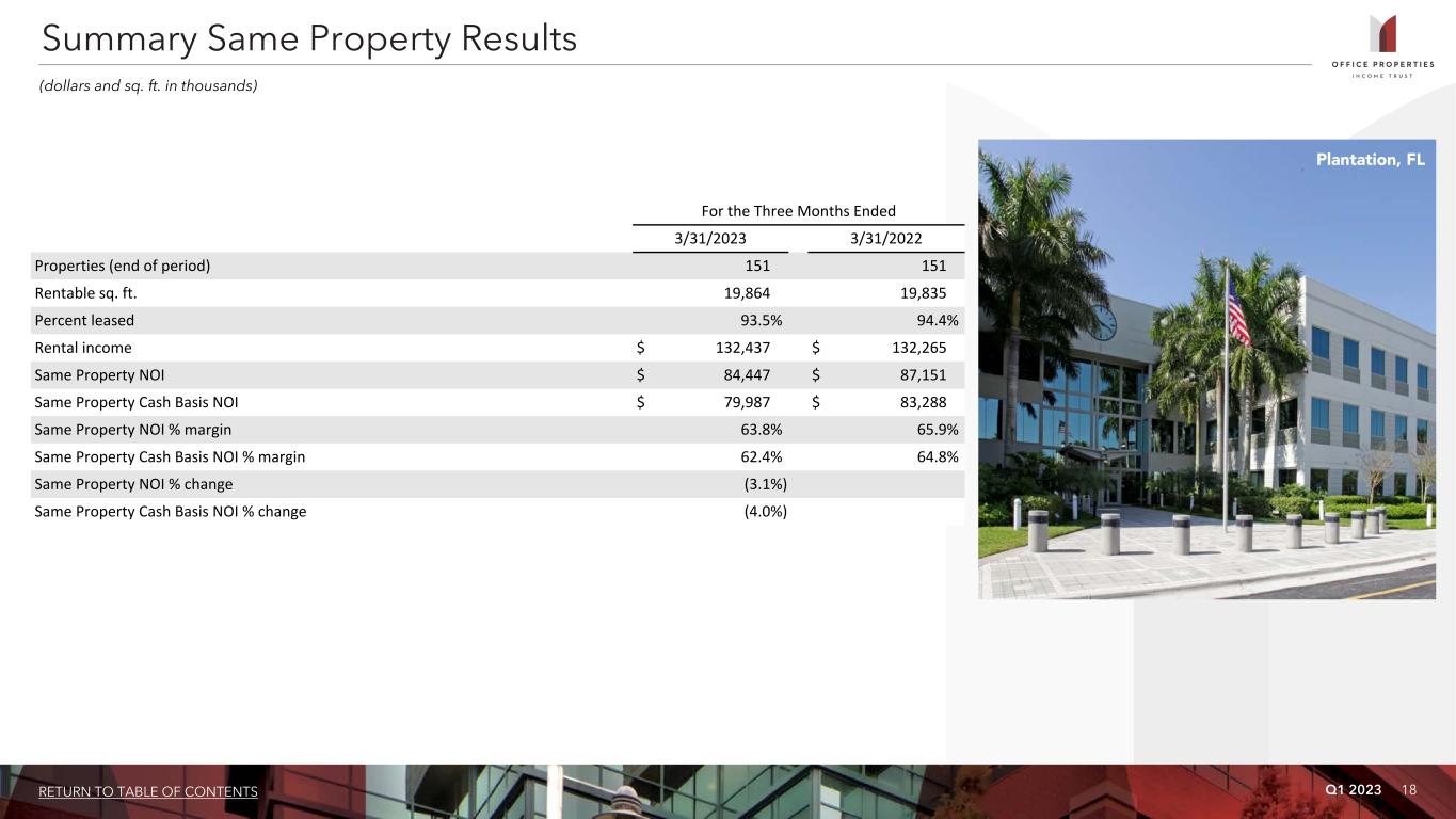 Q1 2023 18RETURN TO TABLE OF CONTENTS For the Three Months Ended 3/31/2023 3/31/2022 Properties (end of period) 151 151 Rentable sq. ft. 19,864 19,835 Percent leased 93.5% 94.4% Rental income $ 132,437 $ 132,265 Same Property NOI $ 84,447 $ 87,151 Same Property Cash Basis NOI $ 79,987 $ 83,288 Same Property NOI % margin 63.8% 65.9% Same Property Cash Basis NOI % margin 62.4% 64.8% Same Property NOI % change (3.1%) Same Property Cash Basis NOI % change (4.0%) Summary Same Property Results (dollars and sq. ft. in thousands) Plantation, FL