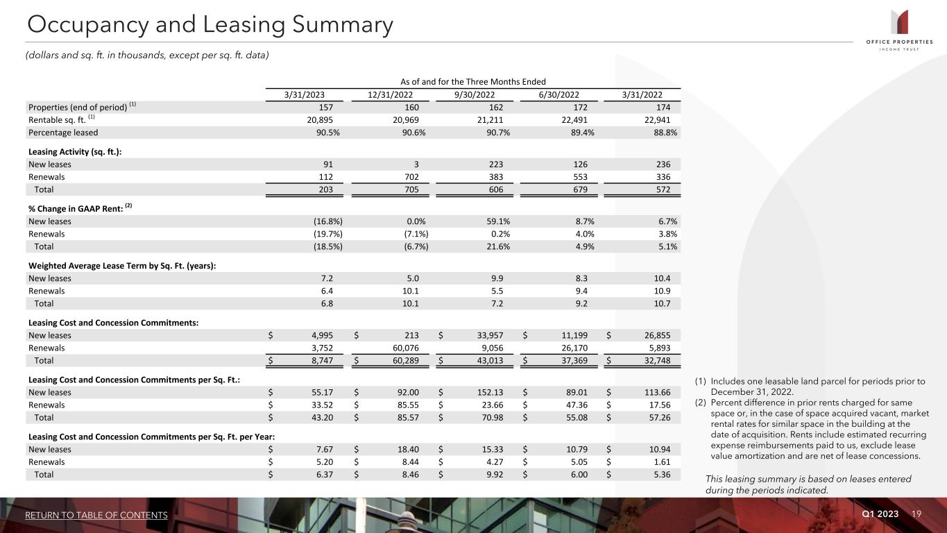 Q1 2023 32RETURN TO TABLE OF CONTENTS Warning Concerning Forward-Looking Statements This presentation contains forward-looking statements within the meaning of the Private Securities Litigation Reform Act of 1995 and other securities laws that are subject to risks and uncertainties. These statements may include words such as “believe”, “expect”, “anticipate”, “intend”, “plan”, “estimate”, “will”, “may” and negatives or derivatives of these or similar expressions. Forward-looking statements reflect management's current expectations, are based on judgments and assumptions, are inherently uncertain and are subject to risks, uncertainties and other factors, which could cause OPI's actual results, performance or achievements to differ materially from expected future results, performance or achievements expressed or implied in those forward-looking statements. Examples of these forward-looking statements and the related risks, uncertainties and other factors include, but are not limited to, the following: the likelihood that OPI will complete its pending Merger, and related transactions with DHC, including OPI's and DHC's ability to obtain shareholder approval, OPI's ability to obtain an amendment or replacement of its credit agreement and obtaining other financing, consents or approvals required in connection with the Merger, expected synergies from the Merger and that OPI's shareholders will benefit from the Merger; the impact of increasing or sustained high interest rates, inflation, labor market challenges, dislocation and volatility in the public equity and debt markets, conditions in the commercial real estate industry generally and in the sectors we operate, geopolitical instability and economic downturns or recessions on OPI and its tenants; the extent to which changes in office space utilization and needs, including due to remote work arrangements, may impact demand for office space at OPI's properties; the financial strength of OPI's tenants; risks and uncertainties regarding the costs and timing of development, redevelopment and repositioning activities, including as a result of inflation, cost overruns, supply chain challenges, labor shortages, construction delays or inability to obtain necessary permits; whether OPI's tenants will renew or extend their leases and not exercise early termination options pursuant to their leases or that OPI will obtain replacement tenants on terms as favorable to OPI as its prior leases; OPI's ability to successfully recycle and deploy capital; the likelihood that OPI's tenants will pay rent or be negatively affected by cyclical economic conditions or government budget constraints; OPI's ability to pay distributions to its shareholders and to maintain or increase the amount of such distributions; OPI's ability to increase or maintain occupancy at its properties on terms desirable to it; OPI's ability to increase rents when its leases expire or renew; OPI's ability to manage its capital expenditures and other operating costs effectively and to maintain and enhance its properties and their appeal to tenants; OPI's ability to acquire properties that realize its targeted returns; OPI's ability to sell properties at prices it targets; OPI's ability to cost effectively raise and balance its use of debt and equity capital; OPI's ability to make required payments on debt; OPI's ability to maintain sufficient liquidity, including the availability of borrowings under its revolving credit facility and otherwise manage leverage; OPI's credit ratings; the ability of OPI's manager, RMR, to successfully manage OPI; OPI's qualification for taxation as a REIT; changes in federal or state tax laws; competition within the commercial real estate industry, particularly in those markets in which OPI's properties are located; compliance with, and changes to, federal, state and local laws and regulations, accounting rules, tax laws and similar matters; the impact of any U.S. government shutdown or failure to increase the government debt ceiling on OPI's ability to collect rents and pay its operating expenses, debt obligations and distributions to shareholders on a timely basis; actual and potential conflicts of interest with OPI's related parties, including its Managing Trustees, RMR, Sonesta and others affiliated with them; limitations imposed by and OPI's ability to satisfy complex rules to maintain OPI's qualification for taxation as a REIT for U.S. federal income tax purposes; acts of terrorism, outbreaks or continuation of pandemics or other public health safety events or conditions, war or other hostilities, material or prolonged disruption to supply chains, climate change, or other manmade or natural disasters beyond OPI's control; and other matters. These risks, uncertainties and other factors are not exhaustive and should be read in conjunction with other cautionary statements that are included in OPI's periodic filings. The information contained in OPI's filings with the SEC, including under the caption "Risk Factors" in its periodic reports, or incorporated therein, identifies important factors that could cause differences from the forward-looking statements in this presentation. OPI's filings with the SEC are available on the SEC's website at www.sec.gov. You should not place undue reliance on forward-looking statements. Except as required by law, OPI undertakes no obligation to update any forward-looking statement, whether as a result of new information, future events or otherwise.