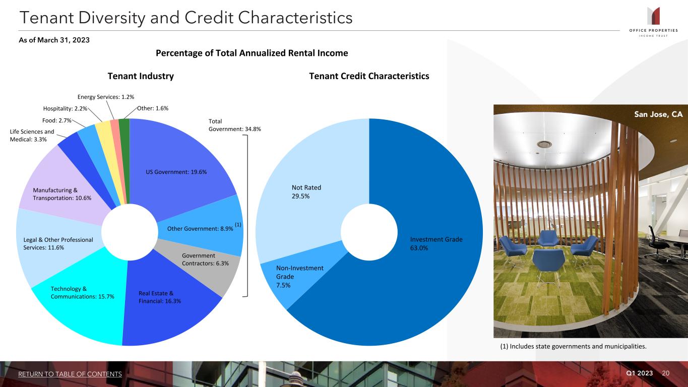 Q1 2023 20RETURN TO TABLE OF CONTENTS Investment Grade 63.0% Non-Investment Grade 7.5% Not Rated 29.5% Percentage of Total Annualized Rental Income Tenant Credit Characteristics ( 4 ) (3) Tenant Industry Tenant Diversity and Credit Characteristics As of March 31, 2023 (1) Total Government: 34.8% (1) (1) Includes state governments and municipalities. US Government: 19.6% Other Government: 8.9% Government Contractors: 6.3% Real Estate & Financial: 16.3% Technology & Communications: 15.7% Legal & Other Professional Services: 11.6% Manufacturing & Transportation: 10.6% Life Sciences and Medical: 3.3% Food: 2.7% Hospitality: 2.2% Energy Services: 1.2% Other: 1.6% (1) San Jose, CA