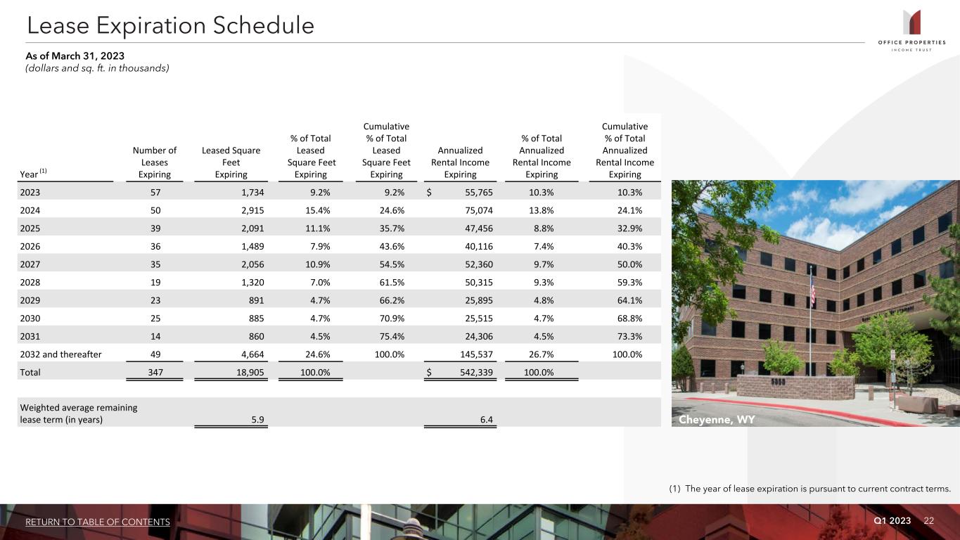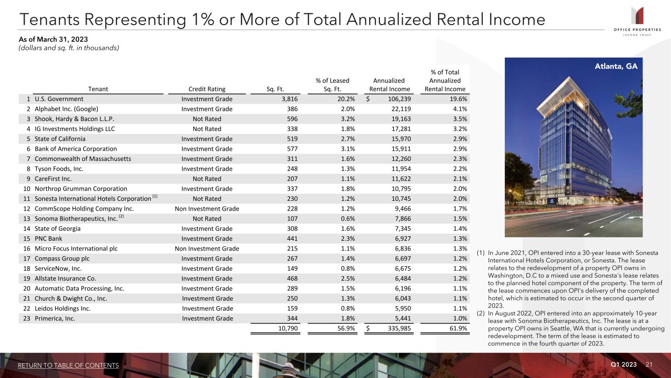 Q1 2023 21RETURN TO TABLE OF CONTENTS Tenant Credit Rating Sq. Ft. % of Leased Sq. Ft. Annualized Rental Income % of Total Annualized Rental Income 1 U.S. Government Investment Grade 3,816 20.2% $ 106,239 19.6% 2 Alphabet Inc. (Google) Investment Grade 386 2.0% 22,119 4.1% 3 Shook, Hardy & Bacon L.L.P. Not Rated 596 3.2% 19,163 3.5% 4 IG Investments Holdings LLC Not Rated 338 1.8% 17,281 3.2% 5 State of California Investment Grade 519 2.7% 15,970 2.9% 6 Bank of America Corporation Investment Grade 577 3.1% 15,911 2.9% 7 Commonwealth of Massachusetts Investment Grade 311 1.6% 12,260 2.3% 8 Tyson Foods, Inc. Investment Grade 248 1.3% 11,954 2.2% 9 CareFirst Inc. Not Rated 207 1.1% 11,622 2.1% 10 Northrop Grumman Corporation Investment Grade 337 1.8% 10,795 2.0% 11 Sonesta International Hotels Corporation (1) Not Rated 230 1.2% 10,745 2.0% 12 CommScope Holding Company Inc. Non Investment Grade 228 1.2% 9,466 1.7% 13 Sonoma Biotherapeutics, Inc. (2) Not Rated 107 0.6% 7,866 1.5% 14 State of Georgia Investment Grade 308 1.6% 7,345 1.4% 15 PNC Bank Investment Grade 441 2.3% 6,927 1.3% 16 Micro Focus International plc Non Investment Grade 215 1.1% 6,836 1.3% 17 Compass Group plc Investment Grade 267 1.4% 6,697 1.2% 18 ServiceNow, Inc. Investment Grade 149 0.8% 6,675 1.2% 19 Allstate Insurance Co. Investment Grade 468 2.5% 6,484 1.2% 20 Automatic Data Processing, Inc. Investment Grade 289 1.5% 6,196 1.1% 21 Church & Dwight Co., Inc. Investment Grade 250 1.3% 6,043 1.1% 22 Leidos Holdings Inc. Investment Grade 159 0.8% 5,950 1.1% 23 Primerica, Inc. Investment Grade 344 1.8% 5,441 1.0% 10,790 56.9% $ 335,985 61.9% Tenants Representing 1% or More of Total Annualized Rental Income As of March 31, 2023 (dollars and sq. ft. in thousands) (1) In June 2021, OPI entered into a 30-year lease with Sonesta International Hotels Corporation, or Sonesta. The lease relates to the redevelopment of a property OPI owns in Washington, D.C to a mixed use and Sonesta's lease relates to the planned hotel component of the property. The term of the lease commences upon OPI's delivery of the completed hotel, which is estimated to occur in the second quarter of 2023. (2) In August 2022, OPI entered into an approximately 10-year lease with Sonoma Biotherapeutics, Inc. The lease is at a property OPI owns in Seattle, WA that is currently undergoing redevelopment. The term of the lease is estimated to commence in the fourth quarter of 2023. Atlanta, GA