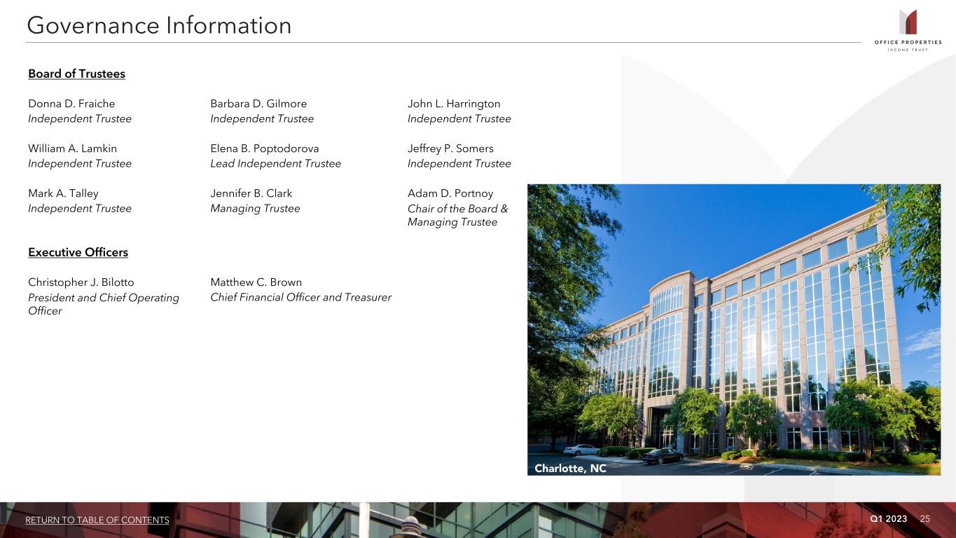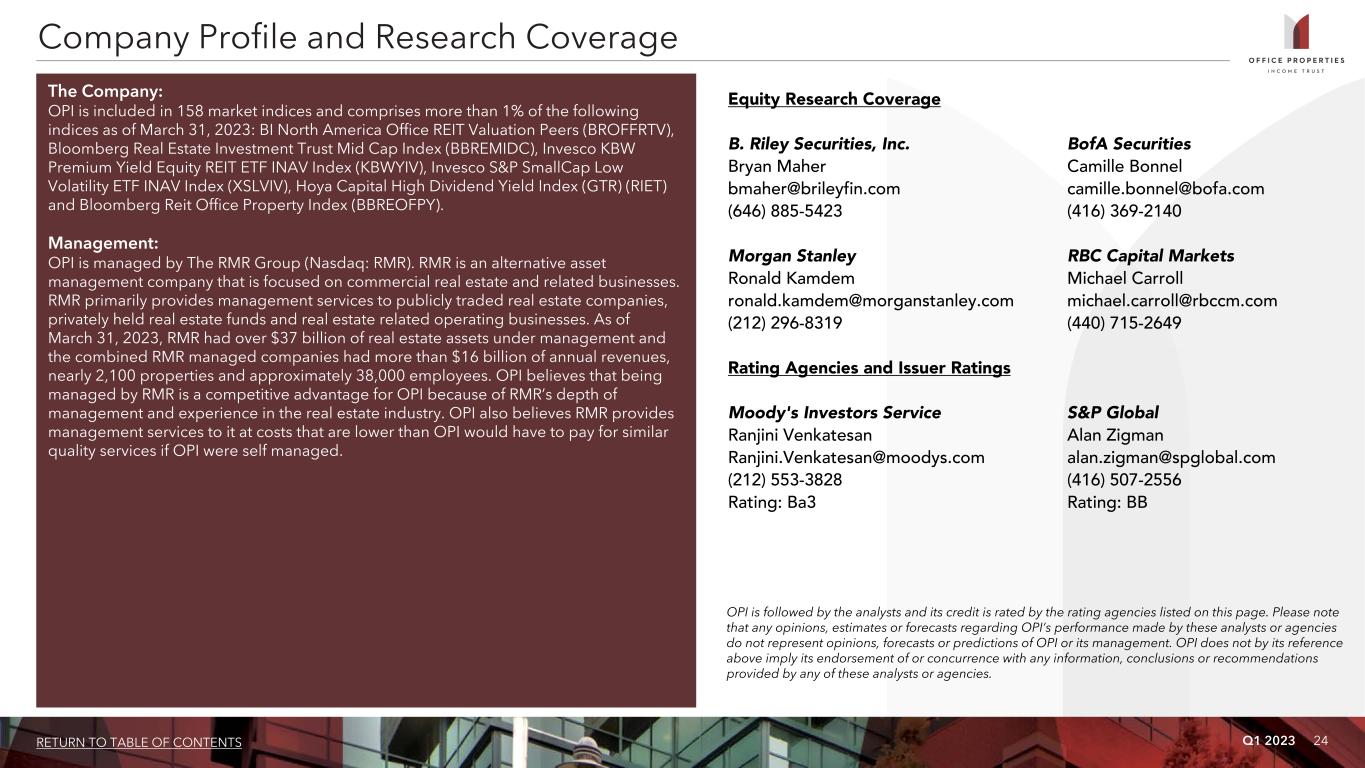 Q1 2023 24RETURN TO TABLE OF CONTENTS The Company: OPI is included in 158 market indices and comprises more than 1% of the following indices as of March 31, 2023: BI North America Office REIT Valuation Peers (BROFFRTV), Bloomberg Real Estate Investment Trust Mid Cap Index (BBREMIDC), Invesco KBW Premium Yield Equity REIT ETF INAV Index (KBWYIV), Invesco S&P SmallCap Low Volatility ETF INAV Index (XSLVIV), Hoya Capital High Dividend Yield Index (GTR) (RIET) and Bloomberg Reit Office Property Index (BBREOFPY). Management: OPI is managed by The RMR Group (Nasdaq: RMR). RMR is an alternative asset management company that is focused on commercial real estate and related businesses. RMR primarily provides management services to publicly traded real estate companies, privately held real estate funds and real estate related operating businesses. As of March 31, 2023, RMR had over $37 billion of real estate assets under management and the combined RMR managed companies had more than $16 billion of annual revenues, nearly 2,100 properties and approximately 38,000 employees. OPI believes that being managed by RMR is a competitive advantage for OPI because of RMR’s depth of management and experience in the real estate industry. OPI also believes RMR provides management services to it at costs that are lower than OPI would have to pay for similar quality services if OPI were self managed. Company Profile and Research Coverage Equity Research Coverage B. Riley Securities, Inc. BofA Securities Bryan Maher Camille Bonnel bmaher@brileyfin.com camille.bonnel@bofa.com (646) 885-5423 (416) 369-2140 Morgan Stanley RBC Capital Markets Ronald Kamdem Michael Carroll ronald.kamdem@morganstanley.com michael.carroll@rbccm.com (212) 296-8319 (440) 715-2649 Rating Agencies and Issuer Ratings Moody's Investors Service S&P Global Ranjini Venkatesan Alan Zigman Ranjini.Venkatesan@moodys.com alan.zigman@spglobal.com (212) 553-3828 (416) 507-2556 Rating: Ba3 Rating: BB OPI is followed by the analysts and its credit is rated by the rating agencies listed on this page. Please note that any opinions, estimates or forecasts regarding OPI’s performance made by these analysts or agencies do not represent opinions, forecasts or predictions of OPI or its management. OPI does not by its reference above imply its endorsement of or concurrence with any information, conclusions or recommendations provided by any of these analysts or agencies.
