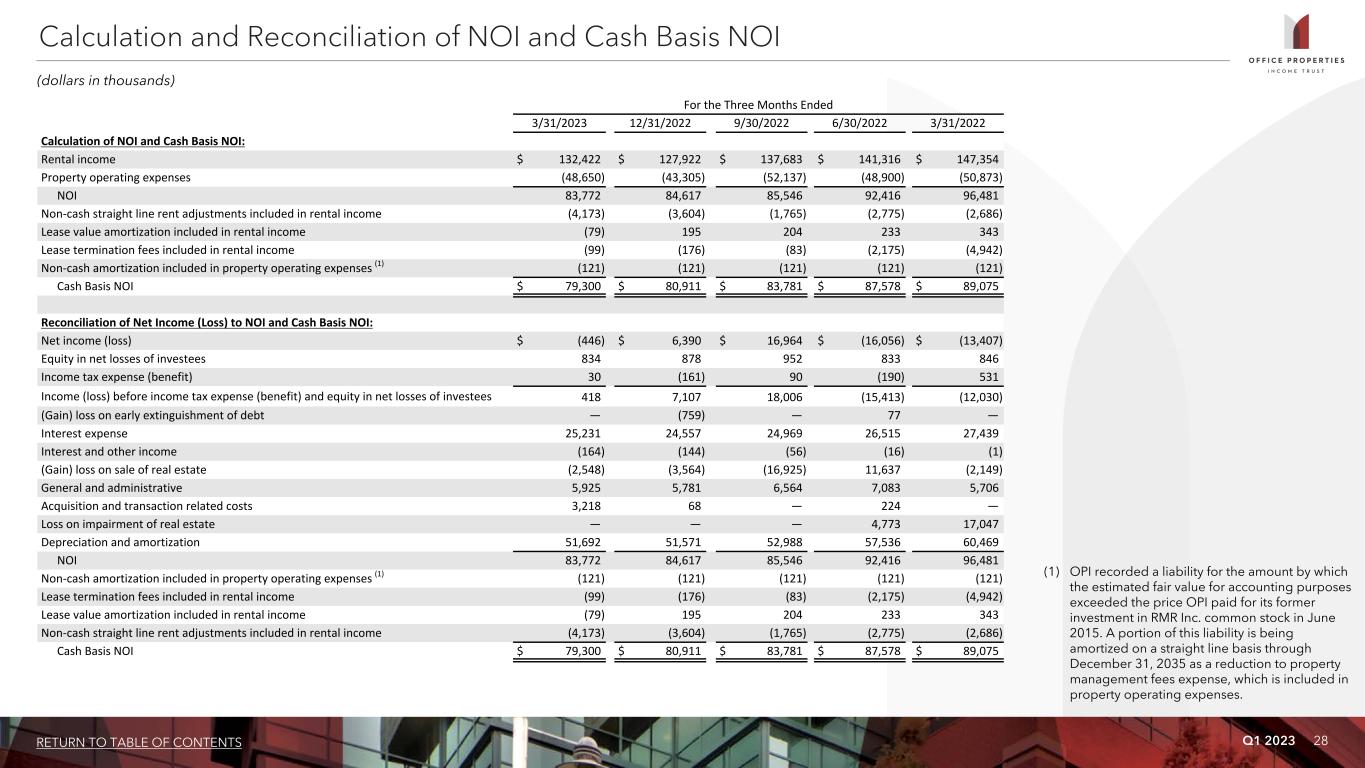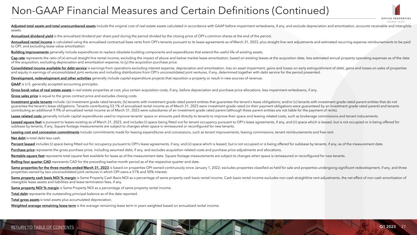 Q1 2023 26RETURN TO TABLE OF CONTENTS Non-GAAP Financial Measures OPI presents certain “non-GAAP financial measures” within the meaning of the applicable rules of the Securities and Exchange Commission (SEC), including NOI, Cash Basis NOI, Same Property NOI, Same Property Cash Basis NOI, EBITDA, EBITDAre, Adjusted EBITDAre, FFO, Normalized FFO and CAD. These measures do not represent cash generated by operating activities in accordance with GAAP and should not be considered alternatives to net income (loss) as indicators of OPI's operating performance or as measures of OPI's liquidity. These measures should be considered in conjunction with net income (loss) as presented in OPI's condensed consolidated statements of income (loss). OPI considers these non-GAAP measures to be appropriate supplemental measures of operating performance for a REIT, along with net income (loss). OPI believes these measures provide useful information to investors because by excluding the effects of certain historical amounts, such as depreciation and amortization expense, they may facilitate a comparison of OPI's operating performance between periods and with other REITs and, in the case of NOI, Cash Basis NOI, Same Property NOI and Same Property Cash Basis NOI reflecting only those income and expense items that are generated and incurred at the property level may help both investors and management to understand the operations of OPI's properties. NOI and Cash Basis NOI The calculations of net operating income, or NOI, and Cash Basis NOI exclude certain components of net income (loss) in order to provide results that are more closely related to OPI's property level results of operations. OPI calculates NOI and Cash Basis NOI as shown on page 28 and Same Property NOI and Same Property Cash Basis NOI as shown on page 29. OPI defines NOI as income from OPI's rental of real estate less OPI's property operating expenses. NOI excludes amortization of capitalized tenant improvement costs and leasing commissions that OPI records as depreciation and amortization expense. OPI defines Cash Basis NOI as NOI excluding non-cash straight line rent adjustments, lease value amortization, lease termination fees, if any, and non-cash amortization included in other operating expenses. OPI calculates Same Property NOI and Same Property Cash Basis NOI in the same manner that OPI calculates the corresponding NOI and Cash Basis NOI amounts, except that OPI only includes same properties in calculating Same Property NOI and Same Property Cash Basis NOI. OPI uses NOI, Cash Basis NOI, Same Property NOI and Same Property Cash Basis NOI to evaluate individual and company-wide property level performance. Other real estate companies and REITs may calculate NOI, Cash Basis NOI, Same Property NOI and Same Property Cash Basis NOI differently than OPI does. EBITDA, EBITDAre and Adjusted EBITDAre OPI calculates earnings before interest, taxes, depreciation and amortization, or EBITDA, EBITDA for real estate, or EBITDAre, and Adjusted EBITDAre as shown on page 30. EBITDAre is calculated on the basis defined by The National Association of Real Estate Investment Trusts, or Nareit, which is EBITDA, excluding gains and losses on the sale of real estate, loss on impairment of real estate assets and adjustments to reflect OPI's share of EBITDAre of its unconsolidated joint ventures. In calculating Adjusted EBITDAre, OPI adjusts for the items shown on page 30 and include business management incentive fees, if any, only in the fourth quarter versus the quarter when they are recognized as expense in accordance with GAAP due to their quarterly volatility not necessarily being indicative of OPI's core operating performance and the uncertainty as to whether any such business management incentive fees will be payable when all contingencies for determining such fees are known at the end of the calendar year. Other real estate companies and REITs may calculate EBITDA, EBITDAre and Adjusted EBITDAre differently than OPI does. FFO and Normalized FFO OPI calculates funds from operations, or FFO, and Normalized FFO as shown on page 31. FFO is calculated on the basis defined by Nareit, which is net income (loss), calculated in accordance with GAAP, plus real estate depreciation and amortization of consolidated properties and OPI's proportionate share of the real estate depreciation and amortization of unconsolidated joint venture properties, but excluding impairment charges on real estate assets and any gain or loss on sale of real estate, as well as certain other adjustments currently not applicable to us. In calculating Normalized FFO, OPI adjusts for the other items shown on page 31 and includes business management incentive fees, if any, only in the fourth quarter versus the quarter when they are recognized as an expense in accordance with GAAP due to their quarterly volatility not necessarily being indicative of OPI's core operating performance and the uncertainty as to whether any such business management incentive fees will be payable when all contingencies for determining such fees are known at the end of the calendar year. FFO and Normalized FFO are among the factors considered by OPI's Board of Trustees when determining the amount of distributions to OPI's shareholders. Other factors include, but are not limited to, requirements to maintain OPI's qualification for taxation as a REIT, limitations in OPI's credit agreement and public debt covenants, the availability to OPI of debt and equity capital, OPI's expectation of its future capital requirements and operating performance and OPI's expected needs for and availability of cash to pay its obligations. Other real estate companies and REITs may calculate FFO and Normalized FFO differently than OPI does. Cash Available for Distribution OPI calculates cash available for distribution, or CAD, as shown on page 31. OPI defines CAD as Normalized FFO minus recurring real estate related capital expenditures and a