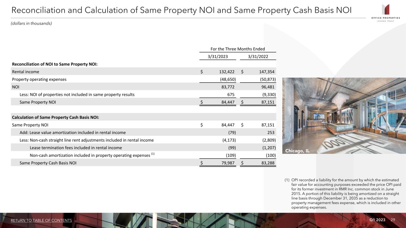 Q1 2023 29RETURN TO TABLE OF CONTENTS For the Three Months Ended 3/31/2023 3/31/2022 Reconciliation of NOI to Same Property NOI: Rental income $ 132,422 $ 147,354 Property operating expenses (48,650) (50,873) NOI 83,772 96,481 Less: NOI of properties not included in same property results 675 (9,330) Same Property NOI $ 84,447 $ 87,151 Calculation of Same Property Cash Basis NOI: Same Property NOI $ 84,447 $ 87,151 Add: Lease value amortization included in rental income (79) 253 Less: Non-cash straight line rent adjustments included in rental income (4,173) (2,809) Lease termination fees included in rental income (99) (1,207) Non-cash amortization included in property operating expenses (1) (109) (100) Same Property Cash Basis NOI $ 79,987 $ 83,288 (1) OPI recorded a liability for the amount by which the estimated fair value for accounting purposes exceeded the price OPI paid for its former investment in RMR Inc. common stock in June 2015. A portion of this liability is being amortized on a straight line basis through December 31, 2035 as a reduction to property management fees expense, which is included in other operating expenses. Reconciliation and Calculation of Same Property NOI and Same Property Cash Basis NOI (dollars in thousands) Chicago, IL