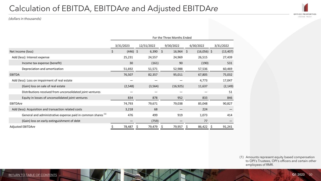 Q1 2023 30RETURN TO TABLE OF CONTENTS For the Three Months Ended 3/31/2023 12/31/2022 9/30/2022 6/30/2022 3/31/2022 Net income (loss) $ (446) $ 6,390 $ 16,964 $ (16,056) $ (13,407) Add (less): Interest expense 25,231 24,557 24,969 26,515 27,439 Income tax expense (benefit) 30 (161) 90 (190) 531 Depreciation and amortization 51,692 51,571 52,988 57,536 60,469 EBITDA 76,507 82,357 95,011 67,805 75,032 Add (less): Loss on impairment of real estate — — — 4,773 17,047 (Gain) loss on sale of real estate (2,548) (3,564) (16,925) 11,637 (2,149) Distributions received from unconsolidated joint ventures — — — — 51 Equity in losses of unconsolidated joint ventures 834 878 952 833 846 EBITDAre 74,793 79,671 79,038 85,048 90,827 Add (less): Acquisition and transaction related costs 3,218 68 — 224 — General and administrative expense paid in common shares (1) 476 499 919 1,073 414 (Gain) loss on early extinguishment of debt — (759) — 77 — Adjusted EBITDAre $ 78,487 $ 79,479 $ 79,957 $ 86,422 $ 91,241 Calculation of EBITDA, EBITDAre and Adjusted EBITDAre (dollars in thousands) (1) Amounts represent equity based compensation to OPI's Trustees, OPI's officers and certain other employees of RMR.