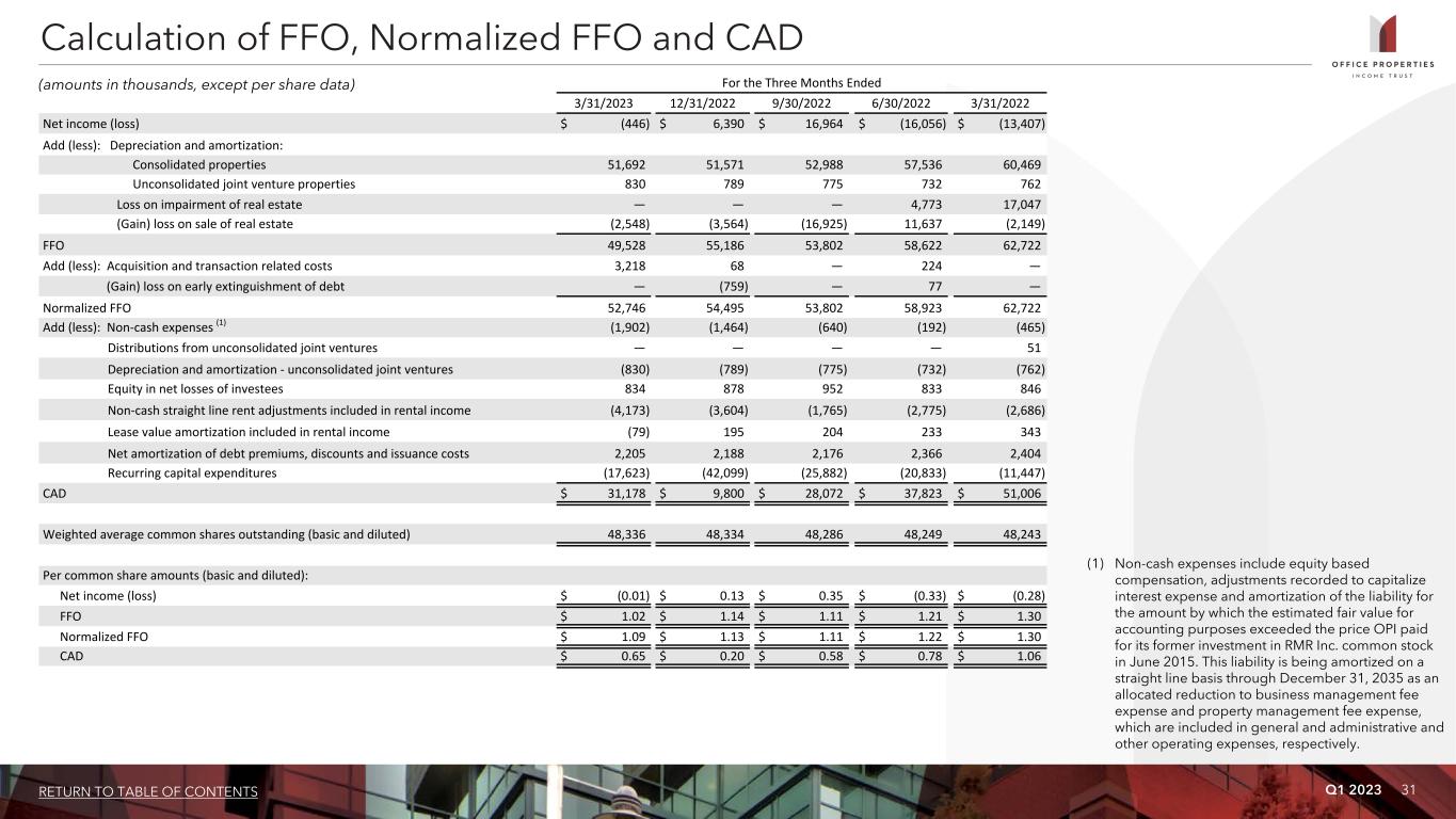 Q1 2023 31RETURN TO TABLE OF CONTENTS For the Three Months Ended 3/31/2023 12/31/2022 9/30/2022 6/30/2022 3/31/2022 Net income (loss) $ (446) $ 6,390 $ 16,964 $ (16,056) $ (13,407) Add (less): Depreciation and amortization: Consolidated properties 51,692 51,571 52,988 57,536 60,469 Unconsolidated joint venture properties 830 789 775 732 762 Loss on impairment of real estate — — — 4,773 17,047 (Gain) loss on sale of real estate (2,548) (3,564) (16,925) 11,637 (2,149) FFO 49,528 55,186 53,802 58,622 62,722 Add (less): Acquisition and transaction related costs 3,218 68 — 224 — (Gain) loss on early extinguishment of debt — (759) — 77 — Normalized FFO 52,746 54,495 53,802 58,923 62,722 Add (less): Non-cash expenses (1) (1,902) (1,464) (640) (192) (465) Distributions from unconsolidated joint ventures — — — — 51 Depreciation and amortization - unconsolidated joint ventures (830) (789) (775) (732) (762) Equity in net losses of investees 834 878 952 833 846 Non-cash straight line rent adjustments included in rental income (4,173) (3,604) (1,765) (2,775) (2,686) Lease value amortization included in rental income (79) 195 204 233 343 Net amortization of debt premiums, discounts and issuance costs 2,205 2,188 2,176 2,366 2,404 Recurring capital expenditures (17,623) (42,099) (25,882) (20,833) (11,447) CAD $ 31,178 $ 9,800 $ 28,072 $ 37,823 $ 51,006 Weighted average common shares outstanding (basic and diluted) 48,336 48,334 48,286 48,249 48,243 Per common share amounts (basic and diluted): Net income (loss) $ (0.01) $ 0.13 $ 0.35 $ (0.33) $ (0.28) FFO $ 1.02 $ 1.14 $ 1.11 $ 1.21 $ 1.30 Normalized FFO $ 1.09 $ 1.13 $ 1.11 $ 1.22 $ 1.30 CAD $ 0.65 $ 0.20 $ 0.58 $ 0.78 $ 1.06 (1) Non-cash expenses include equity based compensation, adjustments recorded to capitalize interest expense and amortization of the liability for the amount by which the estimated fair value for accounting purposes exceeded the price OPI paid for its former investment in RMR Inc. common stock in June 2015. This liability is being amortized on a straight line basis through December 31, 2035 as an allocated reduction to business management fee expense and property management fee expense, which are included in general and administrative and other operating expenses, respectively. Calculation of FFO, Normalized FFO and CAD (amounts in thousands, except per share data)