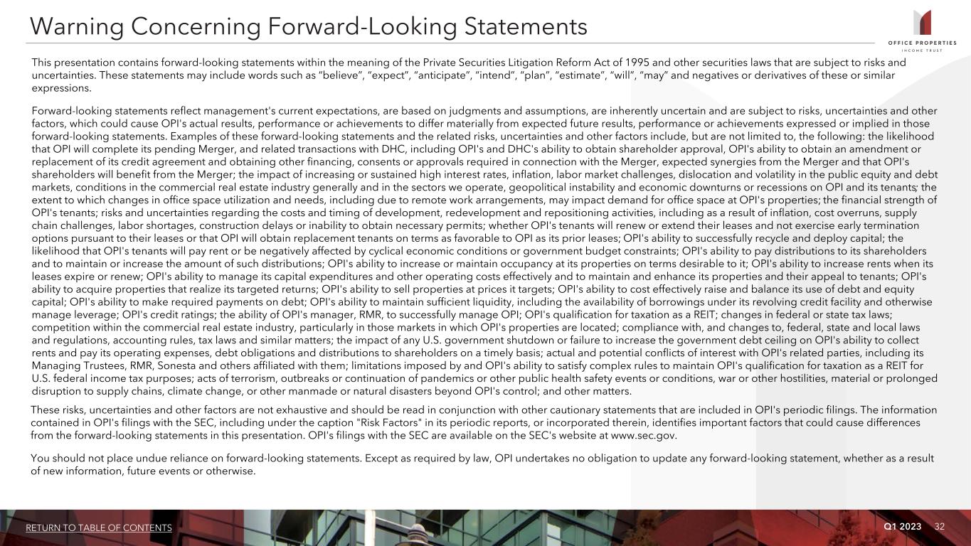 Q1 2023 33RETURN TO TABLE OF CONTENTS Important Additional Information About the Merger In connection with the Merger, OPI intends to file a registration statement on Form S-4 with the SEC, which will include a preliminary prospectus and related materials to register the common shares of beneficial interest of OPI, or the OPI Common Shares, to be issued in the Merger. OPI and DHC intend to file a joint proxy statement/prospectus and other documents concerning the Merger with the SEC. The proposed transaction involving OPI and DHC will be submitted to OPI’s and DHC’s shareholders for their consideration. BEFORE MAKING ANY VOTING OR INVESTMENT DECISION, INVESTORS ARE URGED TO CAREFULLY READ THE REGISTRATION STATEMENT, THE JOINT PROXY STATEMENT/PROSPECTUS AND ANY OTHER DOCUMENTS THAT ARE FILED OR WILL BE FILED WITH THE SEC IN CONNECTION WITH THE MERGER OR INCORPORATED BY REFERENCE IN THE REGISTRATION STATEMENT AND JOINT PROXY STATEMENT/PROSPECTUS BECAUSE THEY CONTAIN OR WILL CONTAIN IMPORTANT INFORMATION ABOUT OPI, DHC AND THE MERGER. When available, the relevant portions of the joint proxy statement/prospectus will be mailed to OPI’s and DHC’s shareholders. Investors will also be able to obtain copies of the registration statement and the joint proxy statement/prospectus and other relevant documents (when they become available) free of charge at the SEC’s website (www.sec.gov). Additional copies of documents filed by OPI with the SEC may be obtained for free on OPI’s Investor Relations website at www.opireit.com/investors/ or by contacting the OPI Investor Relations department at 1-617-219-1410. In addition to the registration statement and joint proxy statement/prospectus expected to be filed, OPI files annual, quarterly and current reports and other information with the SEC. OPI’s filings with the SEC are also available to the public from commercial document-retrieval services and at the website maintained by the SEC at www.sec.gov. No Offer or Solicitation This presentation shall not constitute an offer to sell or the solicitation of an offer to subscribe for or buy any securities or a solicitation of any vote or approval in any jurisdiction with respect to the Merger or otherwise, nor shall there be any sale, issuance or transfer of securities in any jurisdiction in which such offer, solicitation or sale would be unlawful prior to registration or qualification under the securities laws of any such jurisdiction. No offering of securities shall be made except by means of a prospectus meeting the requirements of Section 10 of the U.S. Securities Act of 1933, as amended. Participants in the Solicitation OPI and certain of its trustees and executive officers, DHC and certain of its trustees and executive officers, and RMR and its parent and certain of their respective directors, officers and employees may be deemed to be participants in the solicitation of proxies from OPI’s and DHC’s shareholders in connection with the Merger. Certain information regarding the persons who may, under the rules of the SEC, be deemed participants in the solicitation of OPI’s and DHC’s shareholders in connection with the Merger and a description of their direct and indirect interests will be set forth in the registration statement and the joint proxy statement/prospectus when filed with the SEC. Information about OPI’s trustees and executive officers is included in the proxy statement for OPI’s 2023 annual meeting of shareholders, which was filed with the SEC on April 6, 2023. Information about DHC’s trustees and executive officers is included in the proxy statement for DHC’s 2023 annual meeting of shareholders, which was filed with the SEC on April 20, 2023. Copies of the foregoing documents may be obtained as provided above. Additional information regarding the interests of such participants and other persons who may be deemed participants in the transaction will be included in the joint proxy statement/prospectus and the other relevant documents filed with the SEC when they become available. Warning Concerning Forward-Looking Statements (Continued)