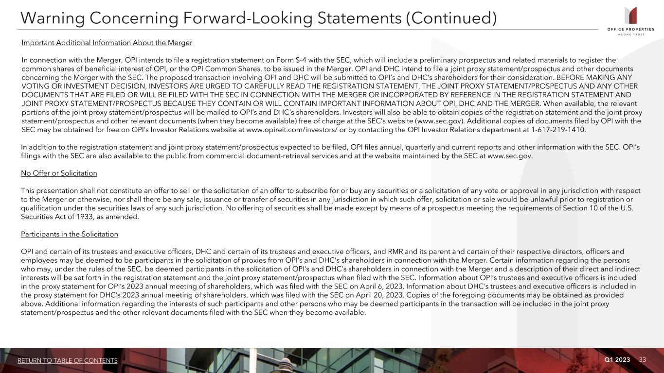 Q1 2023 32RETURN TO TABLE OF CONTENTS Warning Concerning Forward-Looking Statements This presentation contains forward-looking statements within the meaning of the Private Securities Litigation Reform Act of 1995 and other securities laws that are subject to risks and uncertainties. These statements may include words such as “believe”, “expect”, “anticipate”, “intend”, “plan”, “estimate”, “will”, “may” and negatives or derivatives of these or similar expressions. Forward-looking statements reflect management's current expectations, are based on judgments and assumptions, are inherently uncertain and are subject to risks, uncertainties and other factors, which could cause OPI's actual results, performance or achievements to differ materially from expected future results, performance or achievements expressed or implied in those forward-looking statements. Examples of these forward-looking statements and the related risks, uncertainties and other factors include, but are not limited to, the following: the likelihood that OPI will complete its pending Merger, and related transactions with DHC, including OPI's and DHC's ability to obtain shareholder approval, OPI's ability to obtain an amendment or replacement of its credit agreement and obtaining other financing, consents or approvals required in connection with the Merger, expected synergies from the Merger and that OPI's shareholders will benefit from the Merger; the impact of increasing or sustained high interest rates, inflation, labor market challenges, dislocation and volatility in the public equity and debt markets, conditions in the commercial real estate industry generally and in the sectors we operate, geopolitical instability and economic downturns or recessions on OPI and its tenants; the extent to which changes in office space utilization and needs, including due to remote work arrangements, may impact demand for office space at OPI's properties; the financial strength of OPI's tenants; risks and uncertainties regarding the costs and timing of development, redevelopment and repositioning activities, including as a result of inflation, cost overruns, supply chain challenges, labor shortages, construction delays or inability to obtain necessary permits; whether OPI's tenants will renew or extend their leases and not exercise early termination options pursuant to their leases or that OPI will obtain replacement tenants on terms as favorable to OPI as its prior leases; OPI's ability to successfully recycle and deploy capital; the likelihood that OPI's tenants will pay rent or be negatively affected by cyclical economic conditions or government budget constraints; OPI's ability to pay distributions to its shareholders and to maintain or increase the amount of such distributions; OPI's ability to increase or maintain occupancy at its properties on terms desirable to it; OPI's ability to increase rents when its leases expire or renew; OPI's ability to manage its capital expenditures and other operating costs effectively and to maintain and enhance its properties and their appeal to tenants; OPI's ability to acquire properties that realize its targeted returns; OPI's ability to sell properties at prices it targets; OPI's ability to cost effectively raise and balance its use of debt and equity capital; OPI's ability to make required payments on debt; OPI's ability to maintain sufficient liquidity, including the availability of borrowings under its revolving credit facility and otherwise manage leverage; OPI's credit ratings; the ability of OPI's manager, RMR, to successfully manage OPI; OPI's qualification for taxation as a REIT; changes in federal or state tax laws; competition within the commercial real estate industry, particularly in those markets in which OPI's properties are located; compliance with, and changes to, federal, state and local laws and regulations, accounting rules, tax laws and similar matters; the impact of any U.S. government shutdown or failure to increase the government debt ceiling on OPI's ability to collect rents and pay its operating expenses, debt obligations and distributions to shareholders on a timely basis; actual and potential conflicts of interest with OPI's related parties, including its Managing Trustees, RMR, Sonesta and others affiliated with them; limitations imposed by and OPI's ability to satisfy complex rules to maintain OPI's qualification for taxation as a REIT for U.S. federal income tax purposes; acts of terrorism, outbreaks or continuation of pandemics or other public health safety events or conditions, war or other hostilities, material or prolonged disruption to supply chains, climate change, or other manmade or natural disasters beyond OPI's control; and other matters. These risks, uncertainties and other factors are not exhaustive and should be read in conjunction with other cautionary statements that are included in OPI's periodic filings. The information contained in OPI's filings with the SEC, including under the caption "Risk Factors" in its periodic reports, or incorporated therein, identifies important factors that could cause differences from the forward-looking statements in this presentation. OPI's filings with the SEC are available on the SEC's website at www.sec.gov. You should not place undue reliance on forward-looking statements. Except as required by law, OPI undertakes no obligation to update any forward-looking statement, whether as a result of new information, future events or otherwise.
