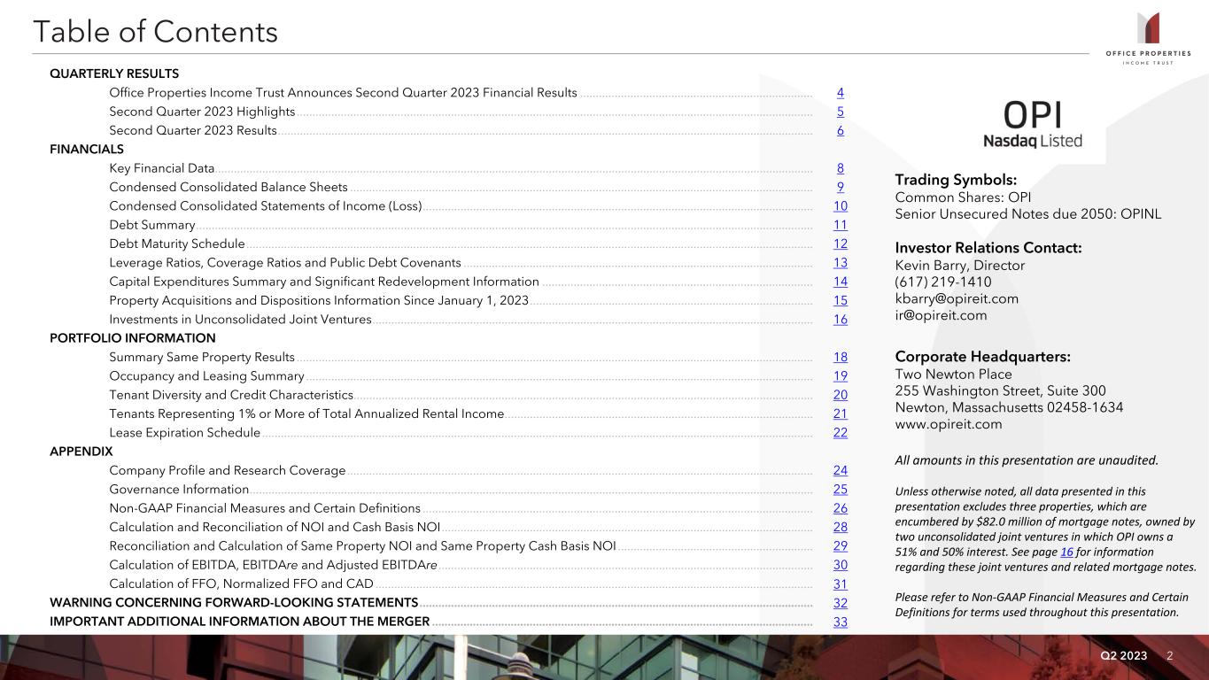 Q2 2023 2 Table of Contents QUARTERLY RESULTS Office Properties Income Trust Announces Second Quarter 2023 Financial Results .......................................................................... 4 Second Quarter 2023 Highlights .................................................................................................................................................................... 5 Second Quarter 2023 Results .......................................................................................................................................................................... 6 FINANCIALS Key Financial Data.............................................................................................................................................................................................. 8 Condensed Consolidated Balance Sheets ................................................................................................................................................... 9 Condensed Consolidated Statements of Income (Loss) ............................................................................................................................ 10 Debt Summary .................................................................................................................................................................................................... 11 Debt Maturity Schedule .................................................................................................................................................................................... 12 Leverage Ratios, Coverage Ratios and Public Debt Covenants ............................................................................................................... 13 Capital Expenditures Summary and Significant Redevelopment Information ...................................................................................... 14 Property Acquisitions and Dispositions Information Since January 1, 2023 .......................................................................................... 15 Investments in Unconsolidated Joint Ventures ............................................................................................................................................ 16 PORTFOLIO INFORMATION Summary Same Property Results .................................................................................................................................................................... 18 Occupancy and Leasing Summary ................................................................................................................................................................. 19 Tenant Diversity and Credit Characteristics.................................................................................................................................................. 20 Tenants Representing 1% or More of Total Annualized Rental Income .................................................................................................. 21 Lease Expiration Schedule ............................................................................................................................................................................... 22 APPENDIX Company Profile and Research Coverage .................................................................................................................................................... 24 Governance Information ................................................................................................................................................................................... 25 Non-GAAP Financial Measures and Certain Definitions ............................................................................................................................ 26 Calculation and Reconciliation of NOI and Cash Basis NOI ...................................................................................................................... 28 Reconciliation and Calculation of Same Property NOI and Same Property Cash Basis NOI .............................................................. 29 Calculation of EBITDA, EBITDAre and Adjusted EBITDAre ....................................................................................................................... 30 Calculation of FFO, Normalized FFO and CAD ........................................................................................................................................... 31 WARNING CONCERNING FORWARD-LOOKING STATEMENTS ............................................................................................................................. 32 IMPORTANT ADDITIONAL INFORMATION ABOUT THE MERGER ......................................................................................................................... 33 Trading Symbols: Common Shares: OPI Senior Unsecured Notes due 2050: OPINL Investor Relations Contact: Kevin Barry, Director (617) 219-1410 kbarry@opireit.com ir@opireit.com Corporate Headquarters: Two Newton Place 255 Washington Street, Suite 300 Newton, Massachusetts 02458-1634 www.opireit.com All amounts in this presentation are unaudited. Unless otherwise noted, all data presented in this presentation excludes three properties, which are encumbered by $82.0 million of mortgage notes, owned by two unconsolidated joint ventures in which OPI owns a 51% and 50% interest. See page 16 for information regarding these joint ventures and related mortgage notes. Please refer to Non-GAAP Financial Measures and Certain Definitions for terms used throughout this presentation.