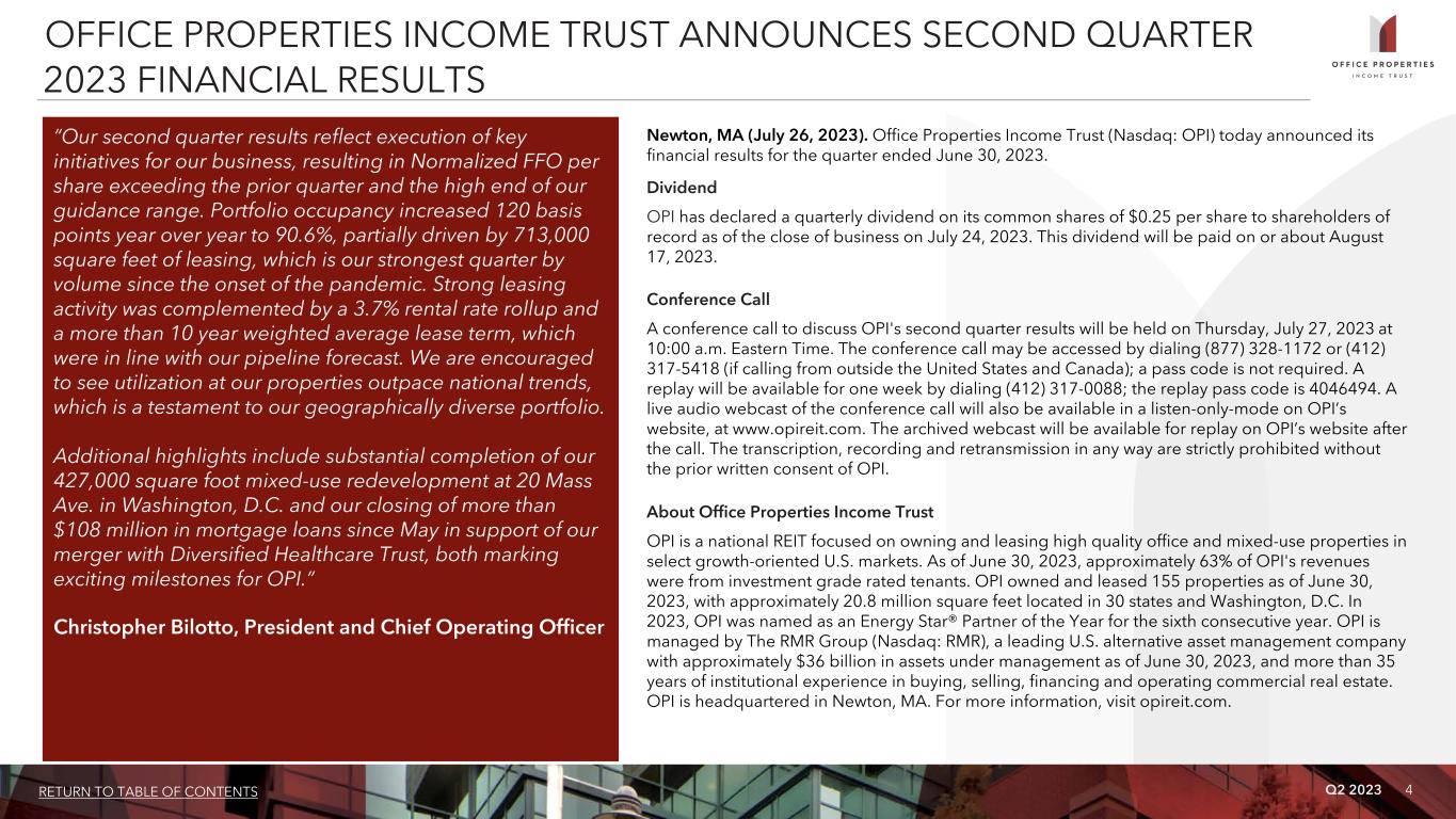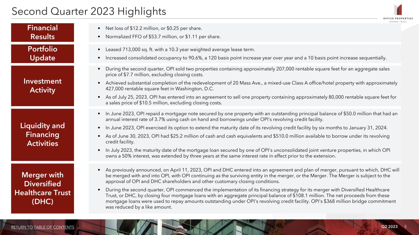 Q2 2023 4RETURN TO TABLE OF CONTENTS OFFICE PROPERTIES INCOME TRUST ANNOUNCES SECOND QUARTER 2023 FINANCIAL RESULTS “Our second quarter results reflect execution of key initiatives for our business, resulting in Normalized FFO per share exceeding the prior quarter and the high end of our guidance range. Portfolio occupancy increased 120 basis points year over year to 90.6%, partially driven by 713,000 square feet of leasing, which is our strongest quarter by volume since the onset of the pandemic. Strong leasing activity was complemented by a 3.7% rental rate rollup and a more than 10 year weighted average lease term, which were in line with our pipeline forecast. We are encouraged to see utilization at our properties outpace national trends, which is a testament to our geographically diverse portfolio. Additional highlights include substantial completion of our 427,000 square foot mixed-use redevelopment at 20 Mass Ave. in Washington, D.C. and our closing of more than $108 million in mortgage loans since May in support of our merger with Diversified Healthcare Trust, both marking exciting milestones for OPI.” Christopher Bilotto, President and Chief Operating Officer Newton, MA (July 26, 2023). Office Properties Income Trust (Nasdaq: OPI) today announced its financial results for the quarter ended June 30, 2023. Dividend OPI has declared a quarterly dividend on its common shares of $0.25 per share to shareholders of record as of the close of business on July 24, 2023. This dividend will be paid on or about August 17, 2023. Conference Call A conference call to discuss OPI's second quarter results will be held on Thursday, July 27, 2023 at 10:00 a.m. Eastern Time. The conference call may be accessed by dialing (877) 328-1172 or (412) 317-5418 (if calling from outside the United States and Canada); a pass code is not required. A replay will be available for one week by dialing (412) 317-0088; the replay pass code is 4046494. A live audio webcast of the conference call will also be available in a listen-only-mode on OPI’s website, at www.opireit.com. The archived webcast will be available for replay on OPI’s website after the call. The transcription, recording and retransmission in any way are strictly prohibited without the prior written consent of OPI. About Office Properties Income Trust OPI is a national REIT focused on owning and leasing high quality office and mixed-use properties in select growth-oriented U.S. markets. As of June 30, 2023, approximately 63% of OPI's revenues were from investment grade rated tenants. OPI owned and leased 155 properties as of June 30, 2023, with approximately 20.8 million square feet located in 30 states and Washington, D.C. In 2023, OPI was named as an Energy Star® Partner of the Year for the sixth consecutive year. OPI is managed by The RMR Group (Nasdaq: RMR), a leading U.S. alternative asset management company with approximately $36 billion in assets under management as of June 30, 2023, and more than 35 years of institutional experience in buying, selling, financing and operating commercial real estate. OPI is headquartered in Newton, MA. For more information, visit opireit.com.