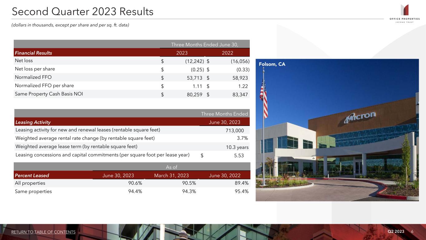 Q2 2023 5RETURN TO TABLE OF CONTENTS Second Quarter 2023 Highlights Financial Results • Net loss of $12.2 million, or $0.25 per share. • Normalized FFO of $53.7 million, or $1.11 per share. Portfolio Update • Leased 713,000 sq. ft. with a 10.3 year weighted average lease term. • Increased consolidated occupancy to 90.6%, a 120 basis point increase year over year and a 10 basis point increase sequentially. Investment Activity • During the second quarter, OPI sold two properties containing approximately 207,000 rentable square feet for an aggregate sales price of $7.7 million, excluding closing costs. • Achieved substantial completion of the redevelopment of 20 Mass Ave., a mixed-use Class A office/hotel property with approximately 427,000 rentable square feet in Washington, D.C. • As of July 25, 2023, OPI has entered into an agreement to sell one property containing approximately 80,000 rentable square feet for a sales price of $10.5 million, excluding closing costs. Liquidity and Financing Activities • In June 2023, OPI repaid a mortgage note secured by one property with an outstanding principal balance of $50.0 million that had an annual interest rate of 3.7% using cash on hand and borrowings under OPI's revolving credit facility. • In June 2023, OPI exercised its option to extend the maturity date of its revolving credit facility by six months to January 31, 2024. • As of June 30, 2023, OPI had $25.2 million of cash and cash equivalents and $510.0 million available to borrow under its revolving credit facility. • In July 2023, the maturity date of the mortgage loan secured by one of OPI's unconsolidated joint venture properties, in which OPI owns a 50% interest, was extended by three years at the same interest rate in effect prior to the extension. Merger with Diversified Healthcare Trust (DHC) • As previously announced, on April 11, 2023, OPI and DHC entered into an agreement and plan of merger, pursuant to which, DHC will be merged with and into OPI, with OPI continuing as the surviving entity in the merger, or the Merger. The Merger is subject to the approval of OPI and DHC shareholders and other customary closing conditions. • During the second quarter, OPI commenced the implementation of its financing strategy for its merger with Diversified Healthcare Trust, or DHC, by closing four mortgage loans with an aggregate principal balance of $108.1 million. The net proceeds from these mortgage loans were used to repay amounts outstanding under OPI's revolving credit facility. OPI's $368 million bridge commitment was reduced by a like amount.