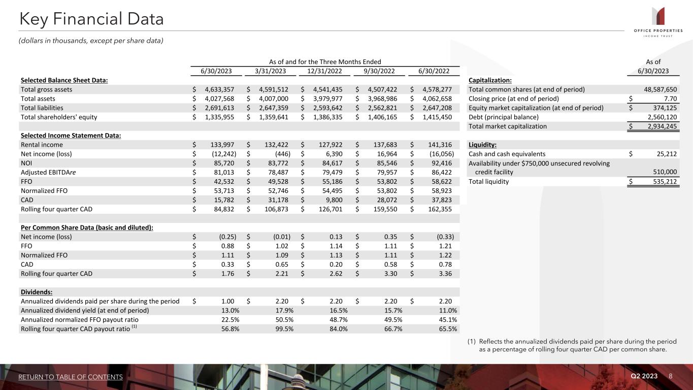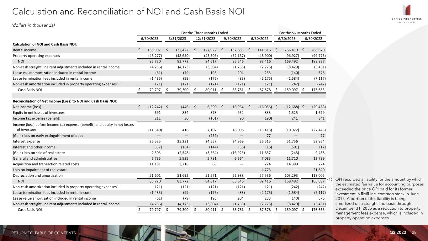 Q2 2023 27RETURN TO TABLE OF CONTENTS Adjusted total assets and total unencumbered assets include the original cost of real estate assets calculated in accordance with GAAP before impairment writedowns, if any, and exclude depreciation and amortization, accounts receivable and intangible assets. Annualized dividend yield is the annualized dividend per share paid during the period divided by the closing price of OPI's common shares at the end of the period. Annualized rental income is calculated using the annualized contractual base rents from OPI's tenants pursuant to its lease agreements as of June 30, 2023, plus straight line rent adjustments and estimated recurring expense reimbursements to be paid to OPI, and excluding lease value amortization. Building improvements generally include expenditures to replace obsolete building components and expenditures that extend the useful life of existing assets. Cap rate represents the ratio of (x) annual straight line rental income, excluding the impact of above and below market lease amortization, based on existing leases at the acquisition date, less estimated annual property operating expenses as of the date of the acquisition, excluding depreciation and amortization expense, to (y) the acquisition purchase price. Consolidated income available for debt service is earnings from operations excluding interest expense, depreciation and amortization, loss on asset impairment, gains and losses on early extinguishment of debt, gains and losses on sales of properties and equity in earnings of unconsolidated joint ventures and including distributions from OPI's unconsolidated joint ventures, if any, determined together with debt service for the period presented. Development, redevelopment and other activities generally include capital expenditure projects that reposition a property or result in new sources of revenue. GAAP is U.S. generally accepted accounting principles. Gross book value of real estate assets is real estate properties at cost, plus certain acquisition costs, if any, before depreciation and purchase price allocations, less impairment writedowns, if any. Gross sales price is equal to the gross contract price and excludes closing costs. Investment grade tenants include: (a) investment grade rated tenants; (b) tenants with investment grade rated parent entities that guarantee the tenant's lease obligations; and/or (c) tenants with investment grade rated parent entities that do not guarantee the tenant's lease obligations. Tenants contributing 53.1% of annualized rental income as of June 30, 2023 were investment grade rated (or their payment obligations were guaranteed by an investment grade rated parent) and tenants contributing an additional 9.8% of annualized rental income as of June 30, 2023 were subsidiaries of an investment grade rated parent (although these parent entities are not liable for the payment of rents). Lease related costs generally include capital expenditures used to improve tenants' space or amounts paid directly to tenants to improve their space and leasing related costs, such as brokerage commissions and tenant inducements. Leased square feet is pursuant to leases existing as of June 30, 2023, and includes (i) space being fitted out for tenant occupancy pursuant to OPI's lease agreements, if any, and (ii) space which is leased, but is not occupied or is being offered for sublease by tenants, if any. Square footage measurements are subject to changes when space is remeasured or reconfigured for new tenants. Leasing cost and concession commitments include commitments made for leasing expenditures and concessions, such as tenant improvements, leasing commissions, tenant reimbursements and free rent. Net debt is total debt less cash. Percent leased includes (i) space being fitted out for occupancy pursuant to OPI's lease agreements, if any, and (ii) space which is leased, but is not occupied or is being offered for sublease by tenants, if any, as of the measurement date. Purchase price represents the gross purchase price, including assumed debt, if any, and excludes acquisition related costs and purchase price adjustments and allocations. Rentable square feet represents total square feet available for lease as of the measurement date. Square footage measurements are subject to changes when space is remeasured or reconfigured for new tenants. Rolling four quarter CAD represents CAD for the preceding twelve month period as of the respective quarter end date. Same properties for the three months ended June 30, 2023 is based on properties OPI owned continuously since April 1, 2022; excludes properties classified as held for sale and properties undergoing significant redevelopment, if any, and three properties owned by two unconsolidated joint ventures in which OPI owns a 51% and 50% interest. Same properties for the six months ended June 30, 2023 is based on properties OPI owned continuously since January 1, 2022; excludes properties classified as held for sale and properties undergoing significant redevelopment, if any, and three properties owned by two unconsolidated joint ventures in which OPI owns a 51% and 50% interest. Same property cash basis NOI % margin is Same Property Cash Basis NOI as a percentage of same property cash basis rental income. Cash basis rental income excludes non-cash straightline rent adjustments, the net effect of non-cash amortization of intangible lease assets and liabilities and lease termination fees, if any. Same property NOI % margin is Same Property NOI as a percentage of same property rental income. Total debt represents the outstanding principal balance as of the date reported. Total gross assets is total assets plus accumulated depreciation. Weighted average remaining lease term is the average remaining lease term in years weighted based on annualized rental income. Non-GAAP Financial Measures and Certain Definitions (Continued)