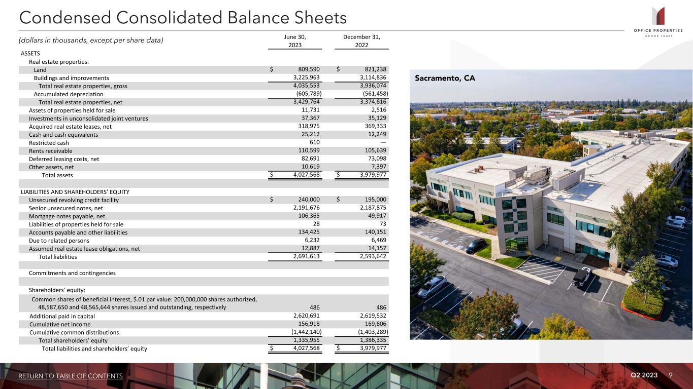 Q2 2023 8RETURN TO TABLE OF CONTENTS As of and for the Three Months Ended As of 6/30/2023 3/31/2023 12/31/2022 9/30/2022 6/30/2022 6/30/2023 Selected Balance Sheet Data: Capitalization: Total gross assets $ 4,633,357 $ 4,591,512 $ 4,541,435 $ 4,507,422 $ 4,578,277 Total common shares (at end of period) 48,587,650 Total assets $ 4,027,568 $ 4,007,000 $ 3,979,977 $ 3,968,986 $ 4,062,658 Closing price (at end of period) $ 7.70 Total liabilities $ 2,691,613 $ 2,647,359 $ 2,593,642 $ 2,562,821 $ 2,647,208 Equity market capitalization (at end of period) $ 374,125 Total shareholders' equity $ 1,335,955 $ 1,359,641 $ 1,386,335 $ 1,406,165 $ 1,415,450 Debt (principal balance) 2,560,120 Total market capitalization $ 2,934,245 Selected Income Statement Data: Rental income $ 133,997 $ 132,422 $ 127,922 $ 137,683 $ 141,316 Liquidity: Net income (loss) $ (12,242) $ (446) $ 6,390 $ 16,964 $ (16,056) Cash and cash equivalents $ 25,212 NOI $ 85,720 $ 83,772 $ 84,617 $ 85,546 $ 92,416 Availability under $750,000 unsecured revolving credit facility 510,000 Adjusted EBITDAre $ 81,013 $ 78,487 $ 79,479 $ 79,957 $ 86,422 FFO $ 42,532 $ 49,528 $ 55,186 $ 53,802 $ 58,622 Total liquidity $ 535,212 Normalized FFO $ 53,713 $ 52,746 $ 54,495 $ 53,802 $ 58,923 CAD $ 15,782 $ 31,178 $ 9,800 $ 28,072 $ 37,823 Rolling four quarter CAD $ 84,832 $ 106,873 $ 126,701 $ 159,550 $ 162,355 Per Common Share Data (basic and diluted): Net income (loss) $ (0.25) $ (0.01) $ 0.13 $ 0.35 $ (0.33) FFO $ 0.88 $ 1.02 $ 1.14 $ 1.11 $ 1.21 Normalized FFO $ 1.11 $ 1.09 $ 1.13 $ 1.11 $ 1.22 CAD $ 0.33 $ 0.65 $ 0.20 $ 0.58 $ 0.78 Rolling four quarter CAD $ 1.76 $ 2.21 $ 2.62 $ 3.30 $ 3.36 Dividends: Annualized dividends paid per share during the period $ 1.00 $ 2.20 $ 2.20 $ 2.20 $ 2.20 Annualized dividend yield (at end of period) 13.0% 17.9% 16.5% 15.7% 11.0% Annualized normalized FFO payout ratio 22.5% 50.5% 48.7% 49.5% 45.1% Rolling four quarter CAD payout ratio (1) 56.8% 99.5% 84.0% 66.7% 65.5% (dollars in thousands, except per share data) Key Financial Data (1) Reflects the annualized dividends paid per share during the period as a percentage of rolling four quarter CAD per common share.