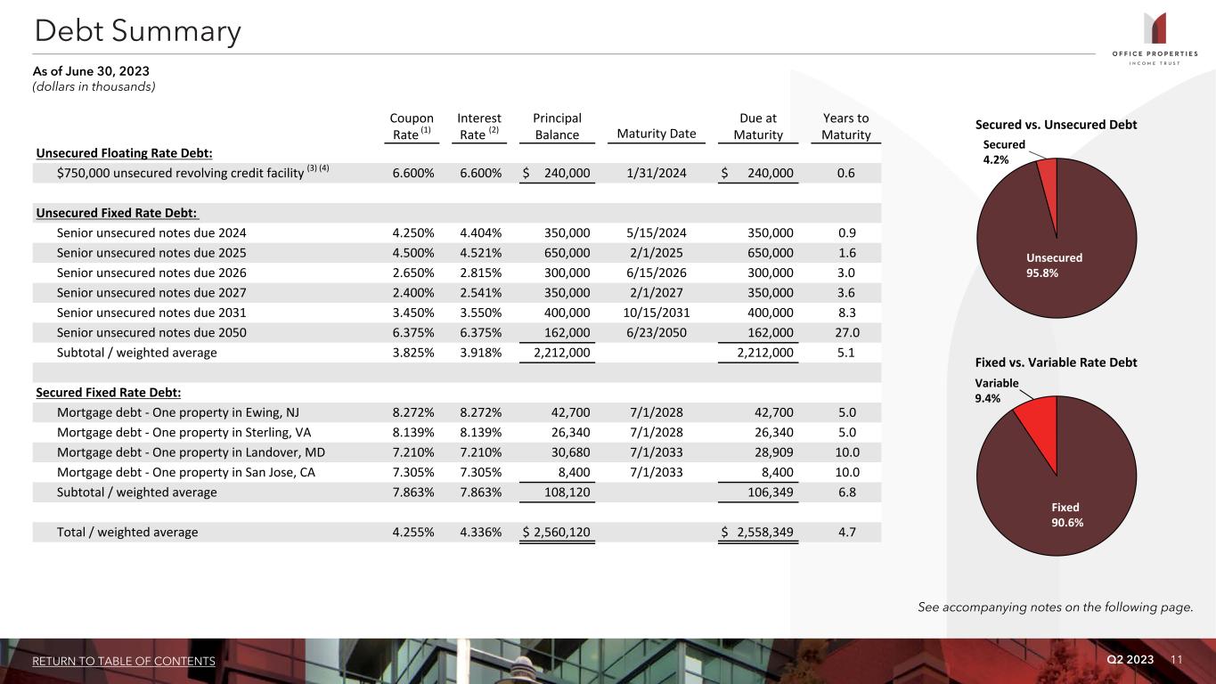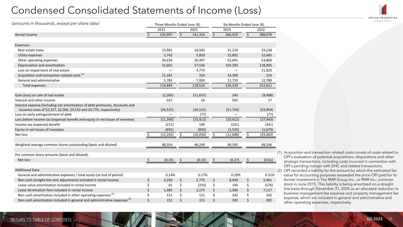 Q2 2023 10RETURN TO TABLE OF CONTENTS Three Months Ended June 30, Six Months Ended June 30, 2023 2022 2023 2022 Rental income $ 133,997 $ 141,316 $ 266,419 $ 288,670 Expenses: Real estate taxes 15,901 16,583 31,234 33,228 Utility expenses 5,742 5,820 13,002 12,685 Other operating expenses 26,634 26,497 52,691 53,860 Depreciation and amortization 51,601 57,536 103,293 118,005 Loss on impairment of real estate — 4,773 — 21,820 Acquisition and transaction related costs (1) 11,181 224 14,399 224 General and administrative 5,785 7,083 11,710 12,789 Total expenses 116,844 118,516 226,329 252,611 Gain (loss) on sale of real estate (2,305) (11,637) 243 (9,488) Interest and other income 337 16 501 17 Interest expense (including net amortization of debt premiums, discounts and issuance costs of $2,327, $2,366, $4,532 and $4,770, respectively) (26,525) (26,515) (51,756) (53,954) Loss on early extinguishment of debt — (77) — (77) Loss before income tax (expense) benefit and equity in net losses of investees (11,340) (15,413) (10,922) (27,443) Income tax (expense) benefit (211) 190 (241) (341) Equity in net losses of investees (691) (833) (1,525) (1,679) Net loss $ (12,242) $ (16,056) $ (12,688) $ (29,463) Weighted average common shares outstanding (basic and diluted) 48,354 48,249 48,345 48,246 Per common share amounts (basic and diluted): Net loss $ (0.25) $ (0.33) $ (0.27) $ (0.61) Additional Data: General and administrative expenses / total assets (at end of period) 0.14% 0.17% 0.29% 0.31% Non-cash straight line rent adjustments included in rental income $ 4,256 $ 2,775 $ 8,429 $ 5,461 Lease value amortization included in rental income $ 61 $ (233) $ 140 $ (576) Lease termination fees included in rental income $ 1,485 $ 2,175 $ 1,584 $ 7,117 Non-cash amortization included in other operating expenses (2) $ 121 $ 121 $ 242 $ 242 Non-cash amortization included in general and administrative expenses (2) $ 151 $ 151 $ 302 $ 302 (amounts in thousands, except per share data) (1) Acquisition and transaction related costs consist of costs related to OPI's evaluation of potential acquisitions, dispositions and other strategic transactions, including costs incurred in connection with OPI's pending merger with DHC and related transactions. (2) OPI recorded a liability for the amount by which the estimated fair value for accounting purposes exceeded the price OPI paid for its former investment in The RMR Group Inc., or RMR Inc., common stock in June 2015. This liability is being amortized on a straight line basis through December 31, 2035 as an allocated reduction to business management fee expense and property management fee expense, which are included in general and administrative and other operating expenses, respectively. Condensed Consolidated Statements of Income (Loss)