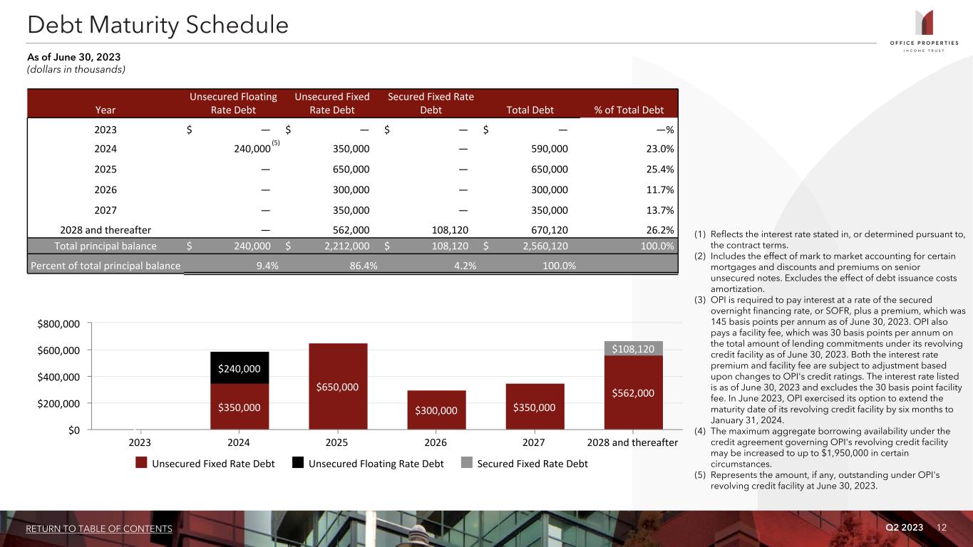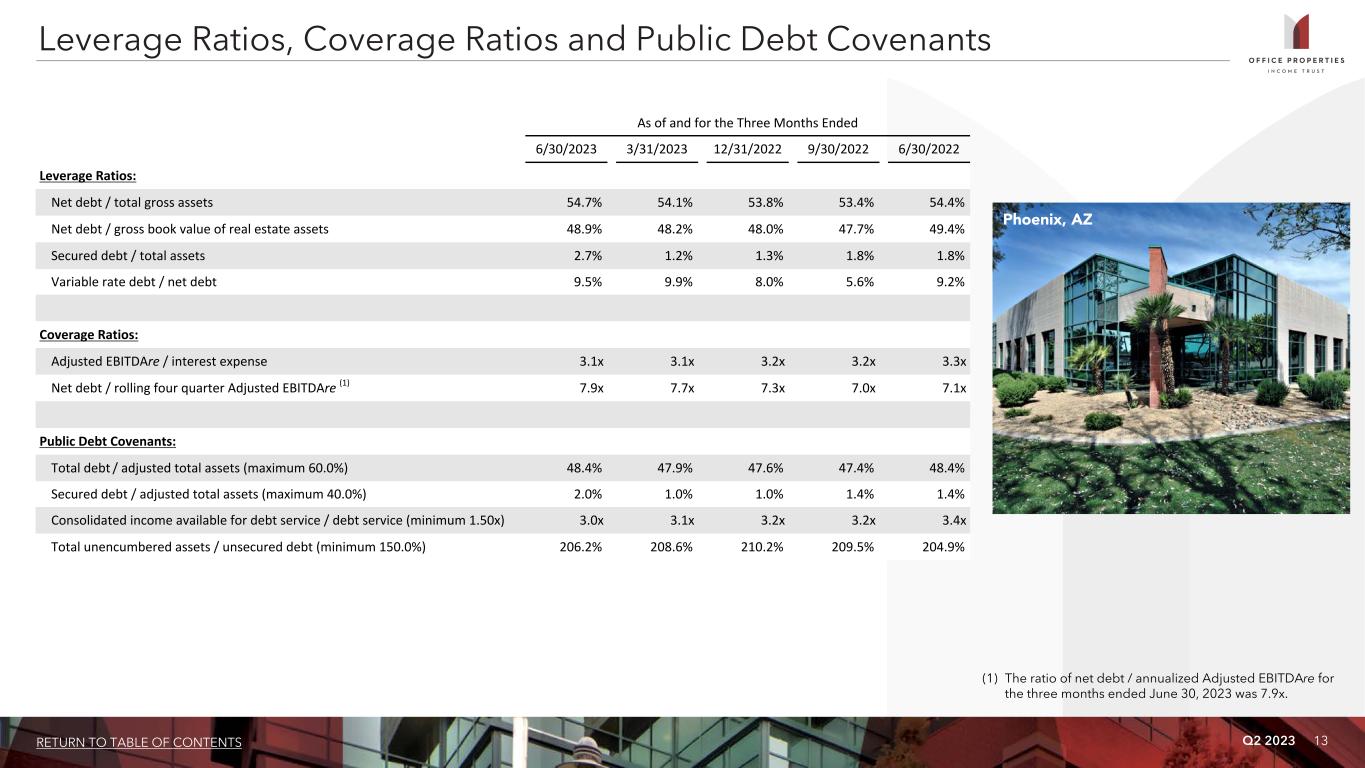 Q2 2023 12RETURN TO TABLE OF CONTENTS $— $350,000 $650,000 $300,000 $350,000 $562,000 $240,000 $108,120 Unsecured Fixed Rate Debt Unsecured Floating Rate Debt Secured Fixed Rate Debt 2023 2024 2025 2026 2027 2028 and thereafter $0 $200,000 $400,000 $600,000 $800,000 Year Unsecured Floating Rate Debt Unsecured Fixed Rate Debt Secured Fixed Rate Debt Total Debt % of Total Debt 2023 $ — $ — $ — $ — —% 2024 240,000 350,000 — 590,000 23.0% 2025 — 650,000 — 650,000 25.4% 2026 — 300,000 — 300,000 11.7% 2027 — 350,000 — 350,000 13.7% 2028 and thereafter — 562,000 108,120 670,120 26.2% Total principal balance $ 240,000 $ 2,212,000 $ 108,120 $ 2,560,120 100.0% Percent of total principal balance 9.4% 86.4% 4.2% 100.0% Debt Maturity Schedule As of June 30, 2023 (dollars in thousands) (1) Reflects the interest rate stated in, or determined pursuant to, the contract terms. (2) Includes the effect of mark to market accounting for certain mortgages and discounts and premiums on senior unsecured notes. Excludes the effect of debt issuance costs amortization. (3) OPI is required to pay interest at a rate of the secured overnight financing rate, or SOFR, plus a premium, which was 145 basis points per annum as of June 30, 2023. OPI also pays a facility fee, which was 30 basis points per annum on the total amount of lending commitments under its revolving credit facility as of June 30, 2023. Both the interest rate premium and facility fee are subject to adjustment based upon changes to OPI's credit ratings. The interest rate listed is as of June 30, 2023 and excludes the 30 basis point facility fee. In June 2023, OPI exercised its option to extend the maturity date of its revolving credit facility by six months to January 31, 2024. (4) The maximum aggregate borrowing availability under the credit agreement governing OPI's revolving credit facility may be increased to up to $1,950,000 in certain circumstances. (5) Represents the amount, if any, outstanding under OPI's revolving credit facility at June 30, 2023. (5)