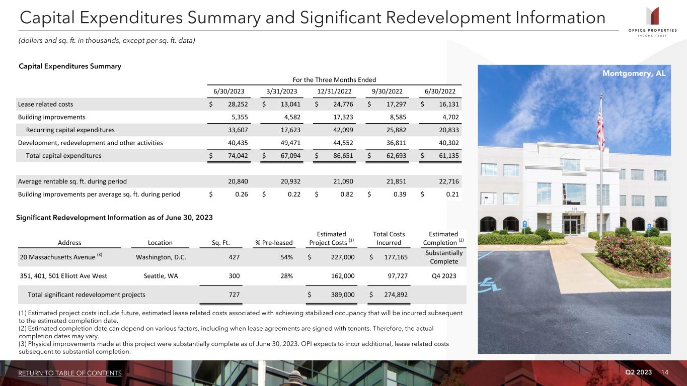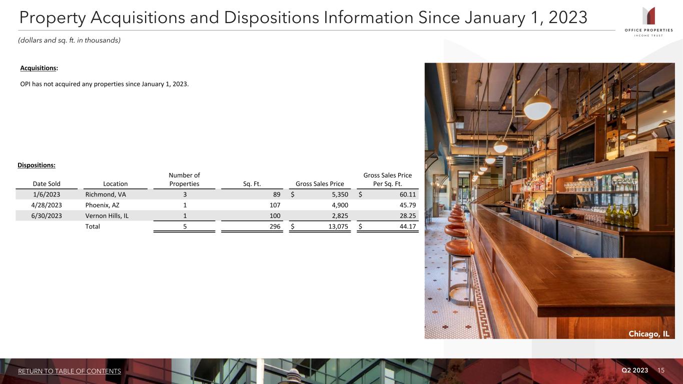 Q2 2023 14RETURN TO TABLE OF CONTENTS For the Three Months Ended 6/30/2023 3/31/2023 12/31/2022 9/30/2022 6/30/2022 Lease related costs $ 28,252 $ 13,041 $ 24,776 $ 17,297 $ 16,131 Building improvements 5,355 4,582 17,323 8,585 4,702 Recurring capital expenditures 33,607 17,623 42,099 25,882 20,833 Development, redevelopment and other activities 40,435 49,471 44,552 36,811 40,302 Total capital expenditures $ 74,042 $ 67,094 $ 86,651 $ 62,693 $ 61,135 Average rentable sq. ft. during period 20,840 20,932 21,090 21,851 22,716 Building improvements per average sq. ft. during period $ 0.26 $ 0.22 $ 0.82 $ 0.39 $ 0.21 Capital Expenditures Summary and Significant Redevelopment Information (dollars and sq. ft. in thousands, except per sq. ft. data) Address Location Sq. Ft. % Pre-leased Estimated Project Costs (1) Total Costs Incurred Estimated Completion (2) 20 Massachusetts Avenue (3) Washington, D.C. 427 54% $ 227,000 $ 177,165 Substantially Complete 351, 401, 501 Elliott Ave West Seattle, WA 300 28% 162,000 97,727 Q4 2023 Total significant redevelopment projects 727 $ 389,000 $ 274,892 Significant Redevelopment Information as of June 30, 2023 (1) Estimated project costs include future, estimated lease related costs associated with achieving stabilized occupancy that will be incurred subsequent to the estimated completion date. (2) Estimated completion date can depend on various factors, including when lease agreements are signed with tenants. Therefore, the actual completion dates may vary. (3) Physical improvements made at this project were substantially complete as of June 30, 2023. OPI expects to incur additional, lease related costs subsequent to substantial completion. Capital Expenditures Summary Montgomery, AL
