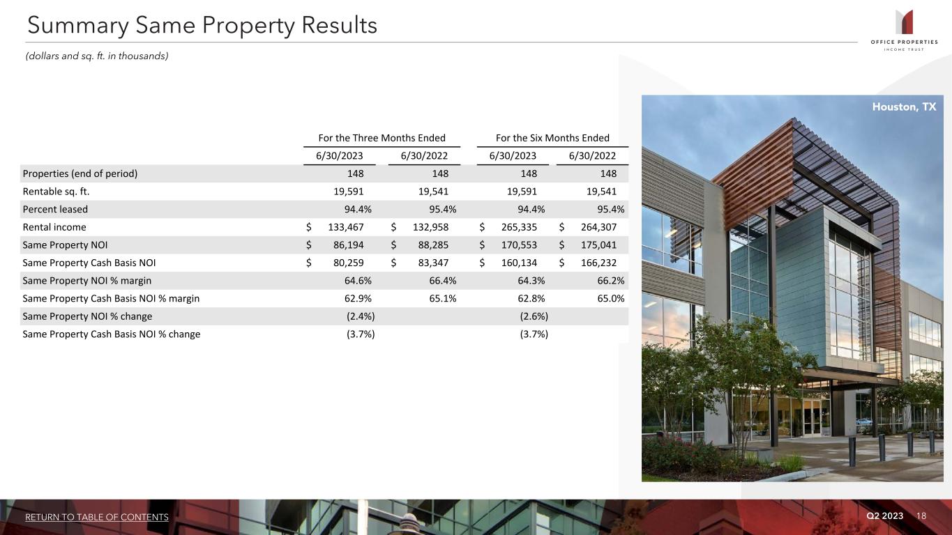 Q2 2023 16RETURN TO TABLE OF CONTENTS Unconsolidated Joint Ventures: Joint Venture OPI Ownership OPI Investment Number of Properties Location Sq. Ft. Occupancy Weighted Average Remaining Lease Term (1) Prosperity Metro Plaza 51% $ 18,810 2 Fairfax, VA 329 76.6% 3.0 years 1750 H Street, NW 50% 18,557 1 Washington, D.C. 115 45.4% 9.9 years Total / Weighted Average $ 37,367 3 444 68.5% 4.5 years (1) Lease term is weighted based on annualized rental income. (2) Includes the effect of interest rate protection and mark to market accounting. (3) Reflects OPI's proportionate share of the principal debt balances based on its ownership percentage of the applicable joint venture; none of the debt is recourse to us. (4) The mortgage loan requires interest-only payments through December 2024, at which time the loan requires principal and interest payments through its maturity date. (5) In July 2023, the maturity date of this mortgage loan was extended by three years at the same interest rate. (6) Reflects OPI's proportionate share of operating results based on its ownership percentage of the respective joint ventures. (7) Includes interest expense, net of other income. (8) OPI's unconsolidated joint ventures report rental income on a straight line basis over the terms of the respective leases; accordingly, rental income includes non-cash straight line rent adjustments. Rental income also includes expense reimbursements, tax escalations, parking revenues, service income and other fixed and variable charges paid to the unconsolidated joint ventures by their tenants, as well as the net effect of non- cash amortization of intangible lease assets and liabilities. Investments in Unconsolidated Joint Ventures As of June 30, 2023 (dollars and sq. ft. in thousands) Results of Operations - Unconsolidated Joint Ventures: (6) For the Three Months Ended June 30, 2023 For the Six Months Ended June 30, 2023 Prosperity Metro Plaza 1750 H Street, NW Total Prosperity Metro Plaza 1750 H Street, NW Total Equity in losses $ (191) $ (500) $ (691) $ (427) $ (1,098) $ (1,525) Depreciation and amortization 662 206 868 1,340 358 1,698 Other expenses, net (7) 165 149 314 407 297 704 NOI 636 (145) 491 1,320 (443) 877 Lease value amortization included in rental income (8) (1) — (1) (2) — (2) Non-cash straight line rent adjustments included in rental income (8) (66) (125) (191) (134) (163) (297) Cash Basis NOI $ 569 $ (270) $ 299 $ 1,184 $ (606) $ 578 Contributions paid by OPI $ — $ (1,500) $ (1,500) $ — $ (3,763) $ (3,763) Outstanding Unconsolidated Debt: Joint Venture OPI Ownership Interest Rate (2) Maturity Date Principal Balance Annualized Debt Service Principal Balance at Maturity OPI Share of Principal Balance (3) Prosperity Metro Plaza (4) 51% 4.090% 12/1/2029 $ 50,000 $ 2,045 $ 45,246 $ 25,500 1750 H Street, NW (5) 50% 3.690% 8/1/2027 32,000 1,181 32,000 16,000 Total / Weighted Average 3.934% $ 82,000 $ 3,226 $ 77,246 $ 41,500