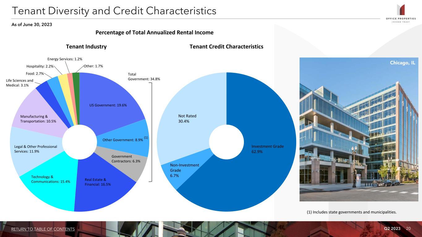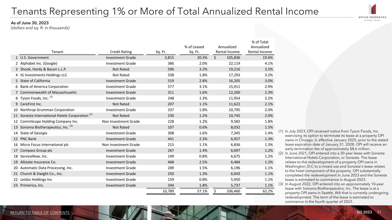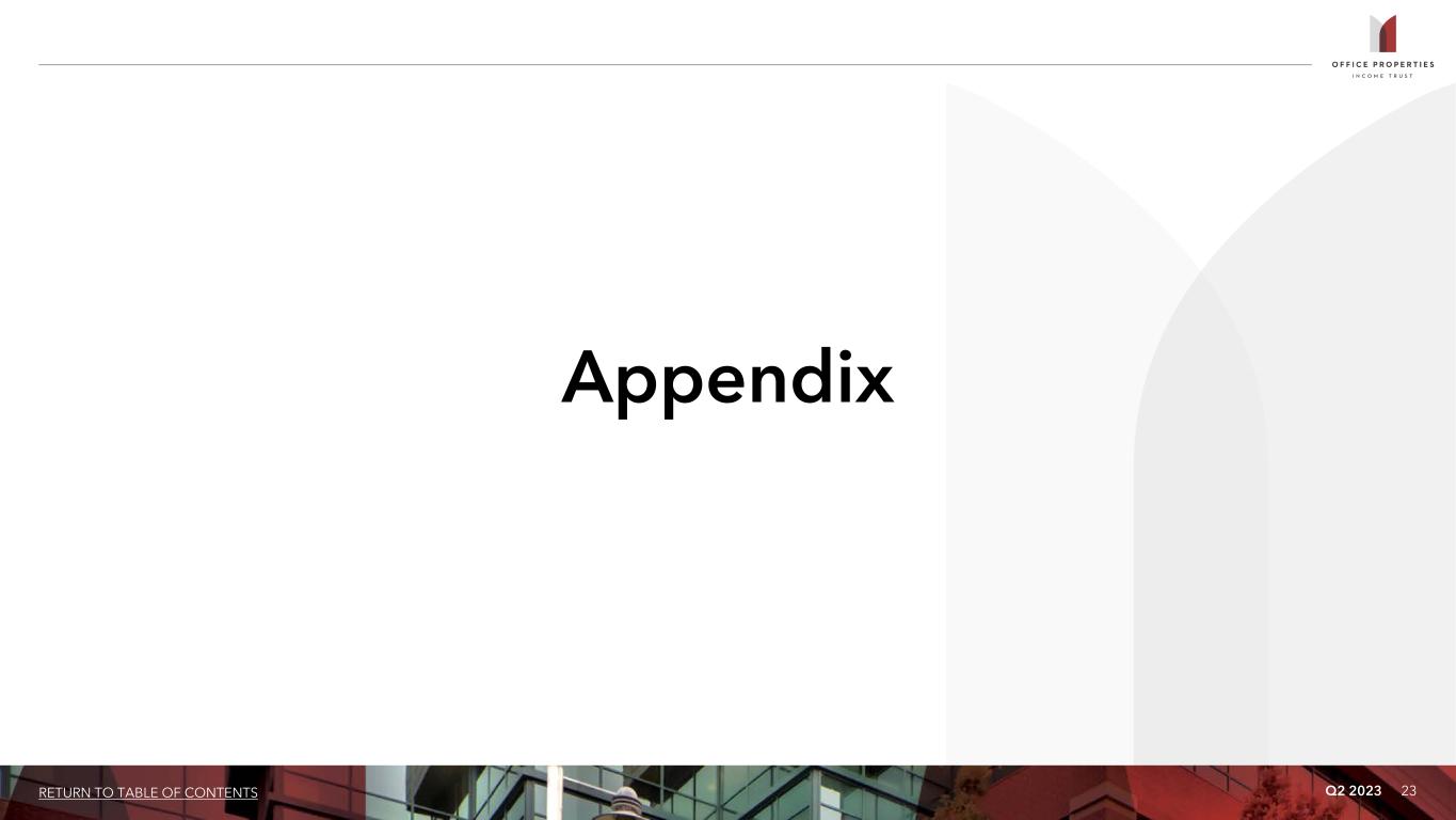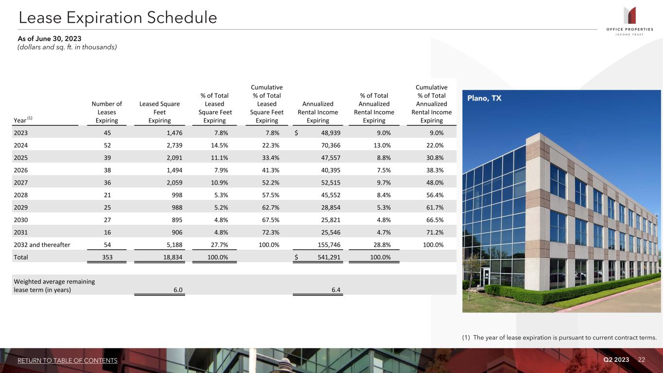 Q2 2023 21RETURN TO TABLE OF CONTENTS Tenant Credit Rating Sq. Ft. % of Leased Sq. Ft. Annualized Rental Income % of Total Annualized Rental Income 1 U.S. Government Investment Grade 3,815 20.3% $ 105,836 19.6% 2 Alphabet Inc. (Google) Investment Grade 386 2.0% 22,119 4.1% 3 Shook, Hardy & Bacon L.L.P. Not Rated 596 3.2% 19,216 3.5% 4 IG Investments Holdings LLC Not Rated 338 1.8% 17,293 3.2% 5 State of California Investment Grade 519 2.8% 16,205 3.0% 6 Bank of America Corporation Investment Grade 577 3.1% 15,911 2.9% 7 Commonwealth of Massachusetts Investment Grade 311 1.6% 12,260 2.3% 8 Tyson Foods, Inc. (1) Investment Grade 248 1.3% 11,954 2.2% 9 CareFirst Inc. Not Rated 207 1.1% 11,622 2.1% 10 Northrop Grumman Corporation Investment Grade 337 1.8% 10,795 2.0% 11 Sonesta International Hotels Corporation (2) Not Rated 230 1.2% 10,745 2.0% 12 CommScope Holding Company Inc. Non Investment Grade 228 1.2% 9,582 1.8% 13 Sonoma Biotherapeutics, Inc. (3) Not Rated 107 0.6% 8,032 1.5% 14 State of Georgia Investment Grade 308 1.6% 7,345 1.4% 15 PNC Bank Investment Grade 441 2.3% 6,927 1.3% 16 Micro Focus International plc Non Investment Grade 215 1.1% 6,836 1.3% 17 Compass Group plc Investment Grade 267 1.4% 6,697 1.2% 18 ServiceNow, Inc. Investment Grade 149 0.8% 6,675 1.2% 19 Allstate Insurance Co. Investment Grade 468 2.5% 6,484 1.2% 20 Automatic Data Processing, Inc. Investment Grade 289 1.5% 6,196 1.1% 21 Church & Dwight Co., Inc. Investment Grade 250 1.3% 6,043 1.1% 22 Leidos Holdings Inc Investment Grade 159 0.8% 5,950 1.1% 23 Primerica, Inc. Investment Grade 344 1.8% 5,737 1.1% 10,789 57.1% $ 336,460 62.2% Tenants Representing 1% or More of Total Annualized Rental Income As of June 30, 2023 (dollars and sq. ft. in thousands) (1) In July 2023, OPI received notice from Tyson Foods, Inc. exercising its option to terminate its lease at a property OPI owns in Chicago, IL effective January 2025, prior to the stated lease expiration date of January 31, 2028. OPI will receive an early termination fee of approximately $8.6 million. (2) In June 2021, OPI entered into a 30-year lease with Sonesta International Hotels Corporation, or Sonesta. The lease relates to the redevelopment of a property OPI owns in Washington, D.C to a mixed use and Sonesta's lease relates to the hotel component of the property. OPI substantially completed the redevelopment in June 2023 and the Sonesta lease is estimated to commence in August 2023. (3) In August 2022, OPI entered into an approximately 10-year lease with Sonoma Biotherapeutics, Inc. The lease is at a property OPI owns in Seattle, WA that is currently undergoing redevelopment. The term of the lease is estimated to commence in the fourth quarter of 2023.